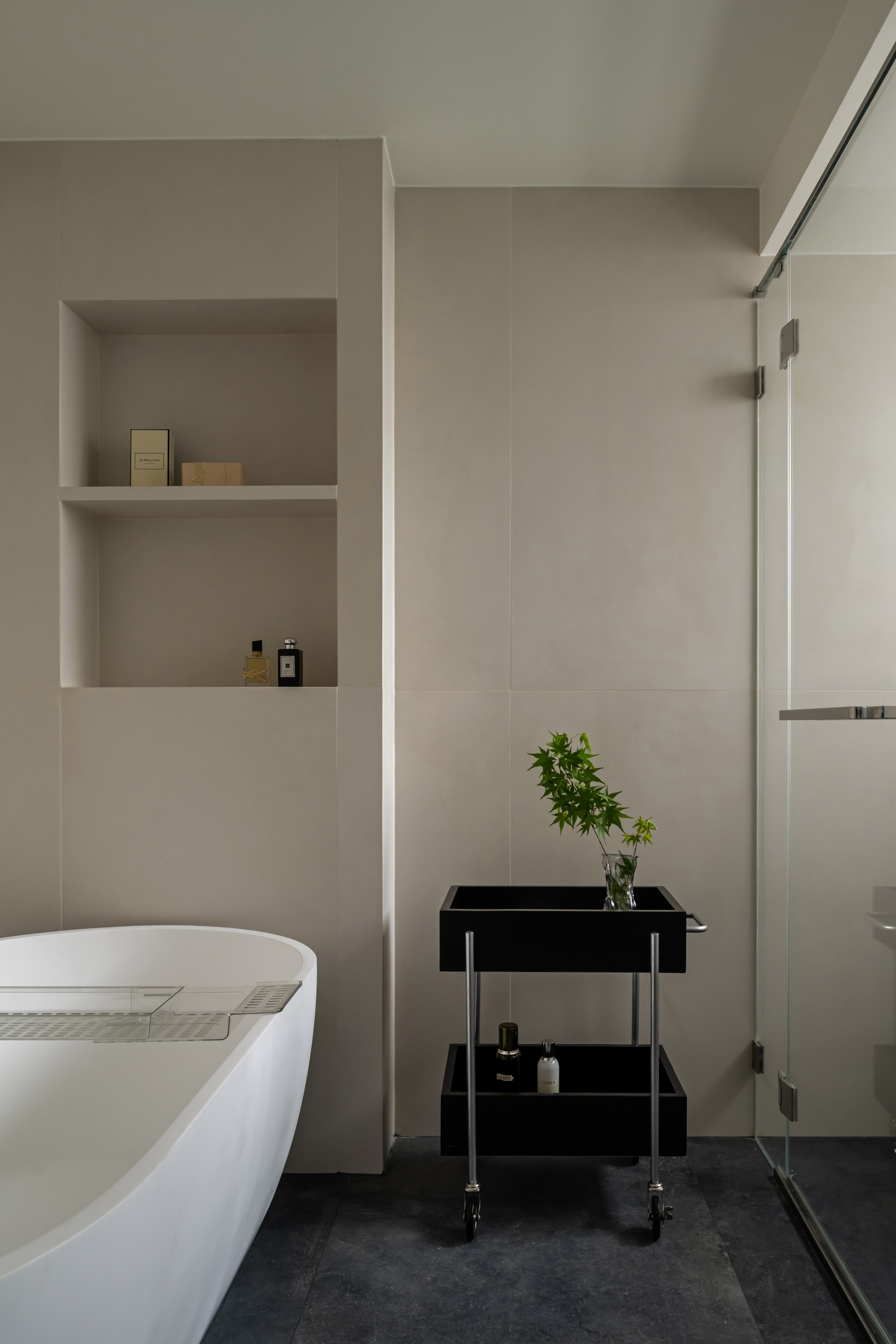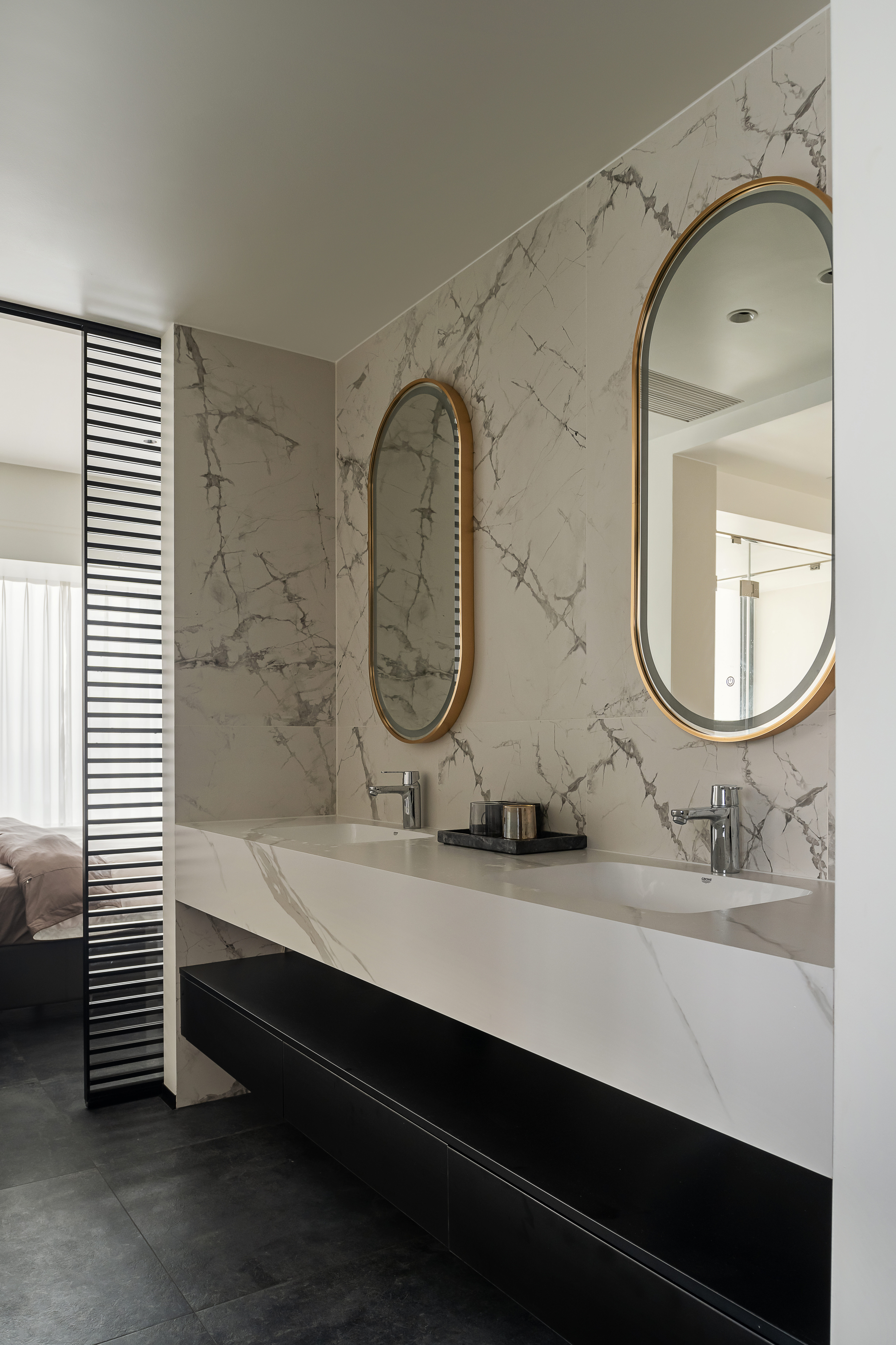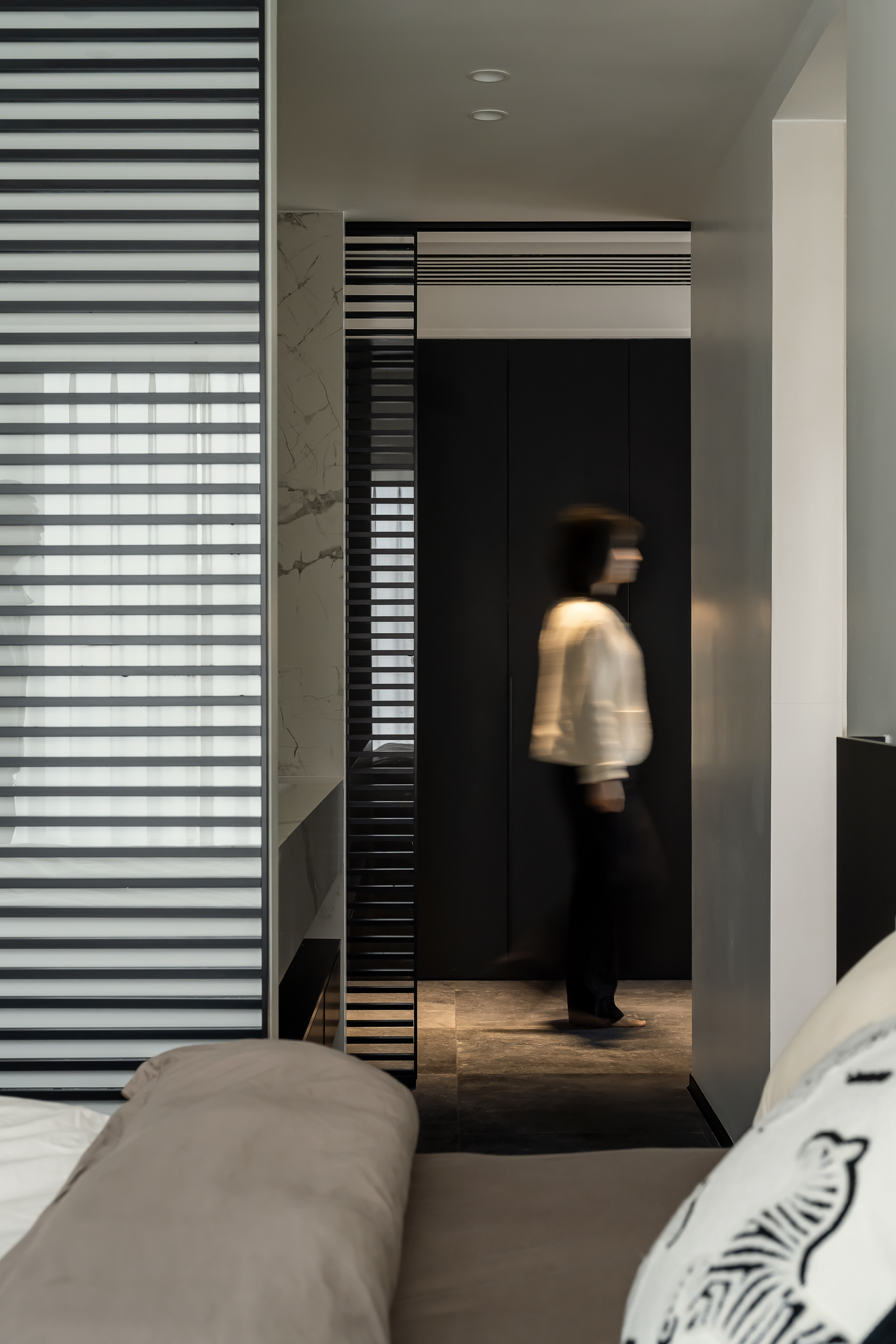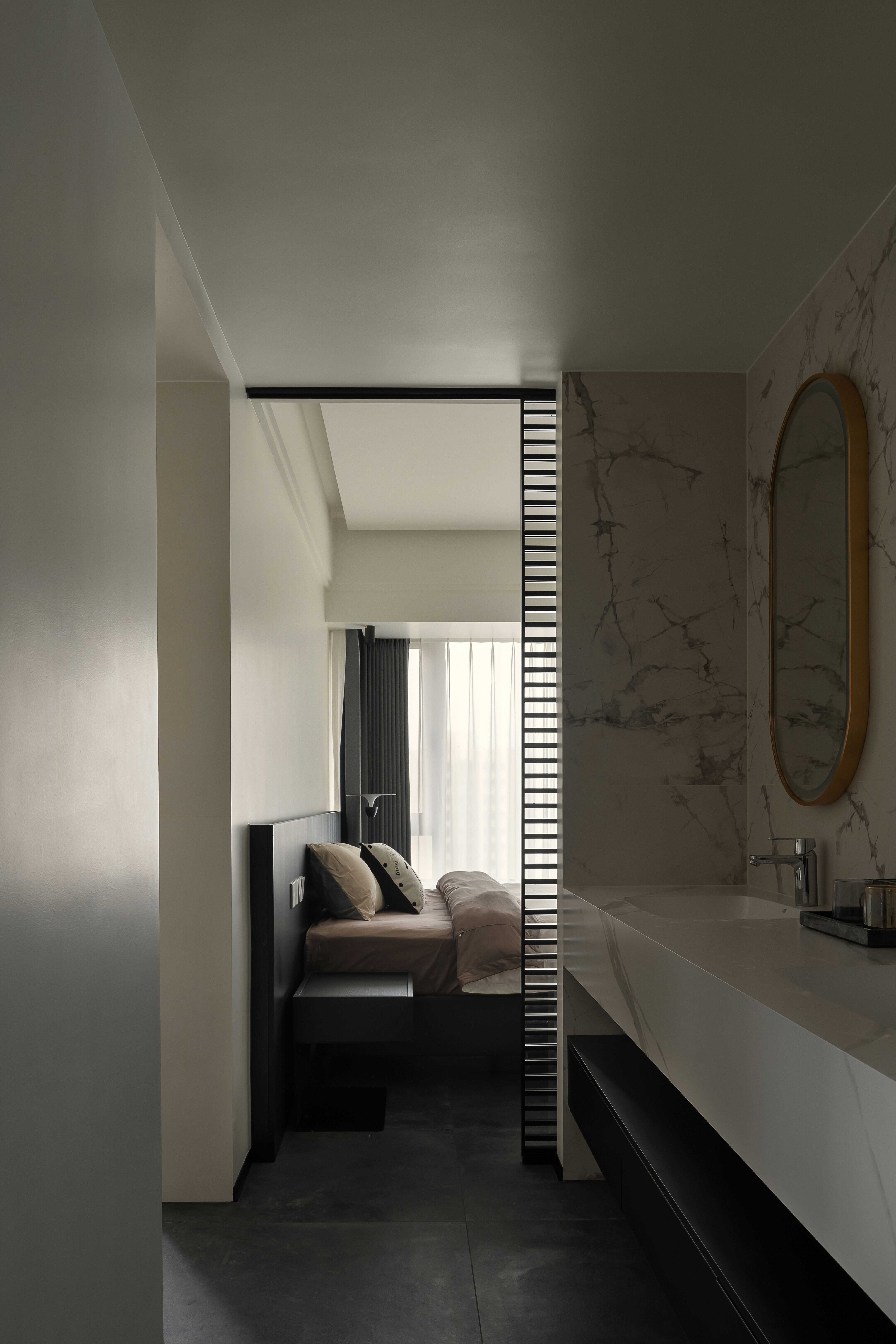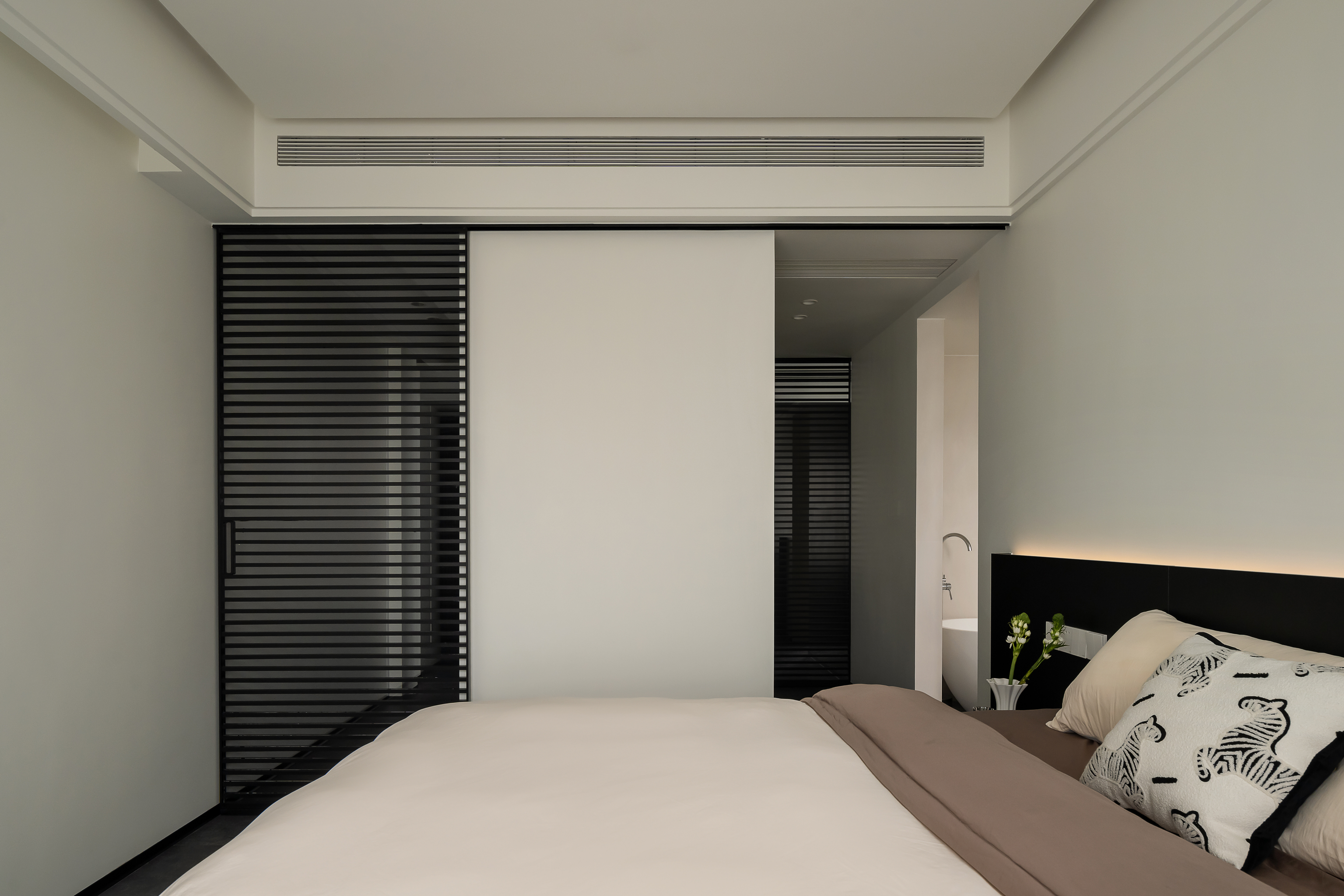 主卧与卫生间之间采用两扇独立滑门,通过滑轨联动,可根据需要灵活划分主卧与卫生间区域,既保持空间连贯,又能确保私密,形成通透且独立的套间体验。