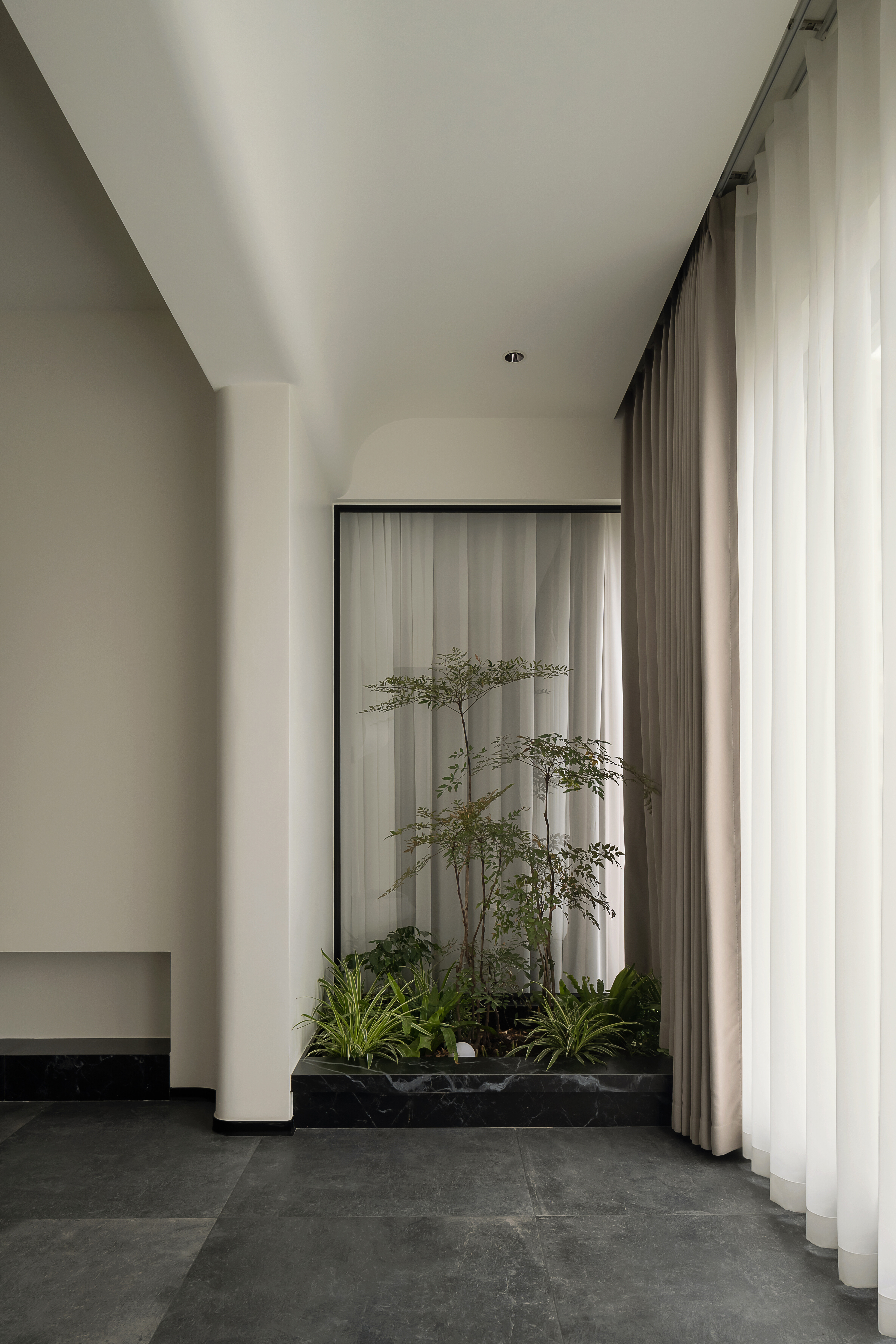 这套住宅具备得天独厚的先天条件。客厅、次卧、主卧三面朝向宽广中庭,采光充足,为室内注入明亮通透的自然光线。设计师巧妙借助景观阳台的开阔视野,将其与客厅空间完美融合,不仅拓宽了客厅维度,更增设玄关区域,巧妙化解“前通后通”的风水忌讳,使空间布局更加合理,动线更为流畅。