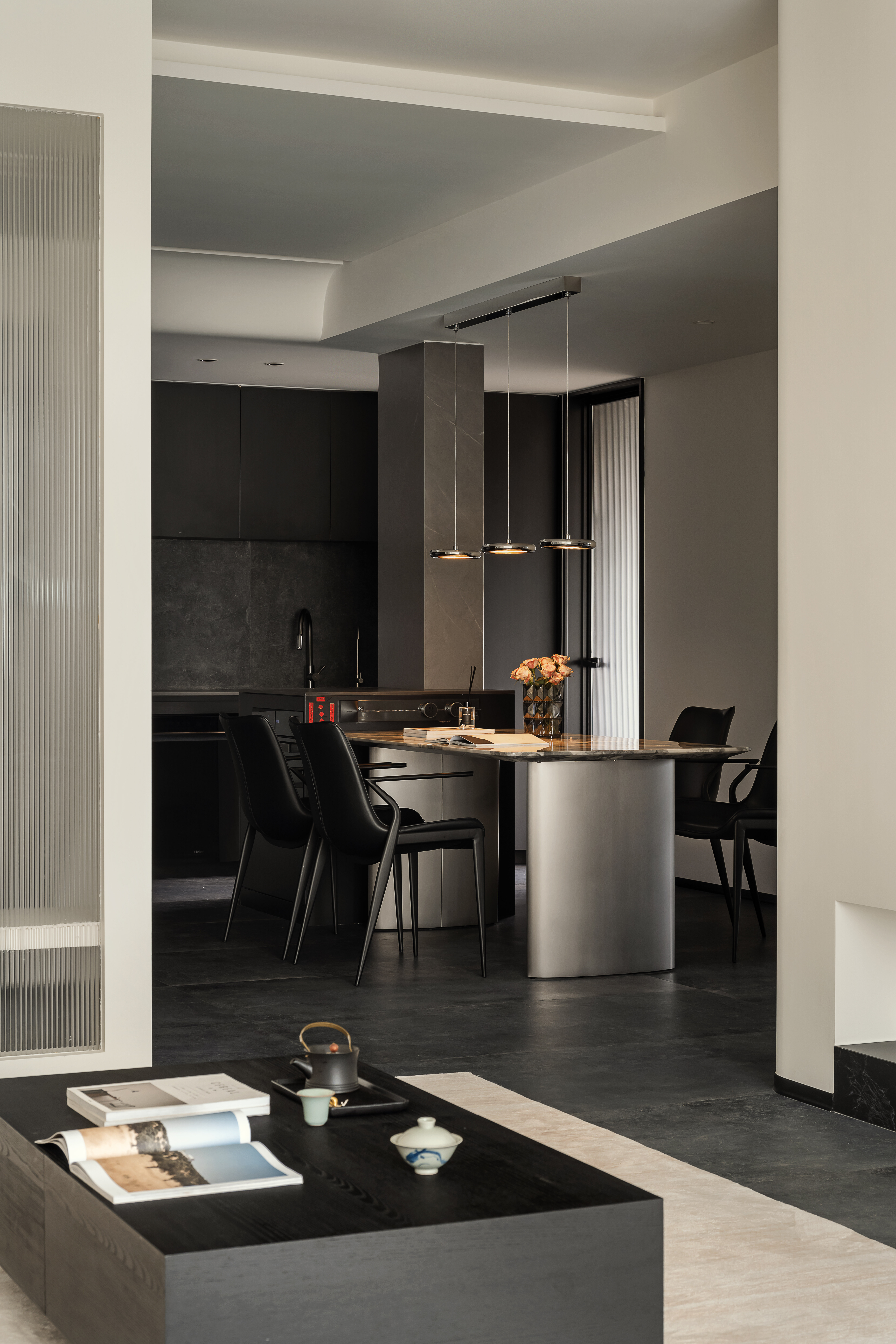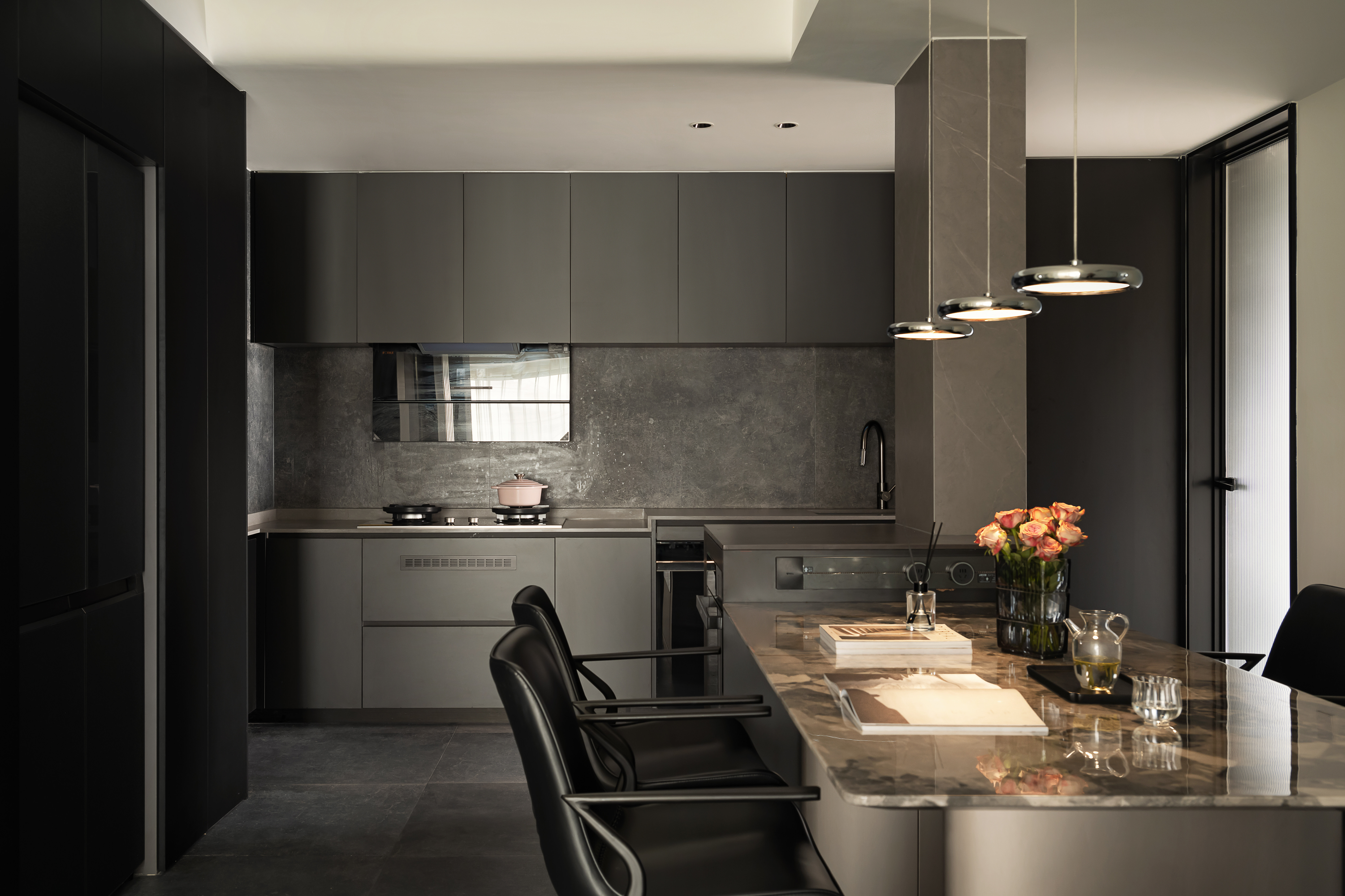 设计师巧妙运用空间布局与设计元素,一体化餐岛台打破传统界限,将烹饪、备餐、用餐与社交活动紧密相连,赋予居家生活更为流畅自如的互动体验。