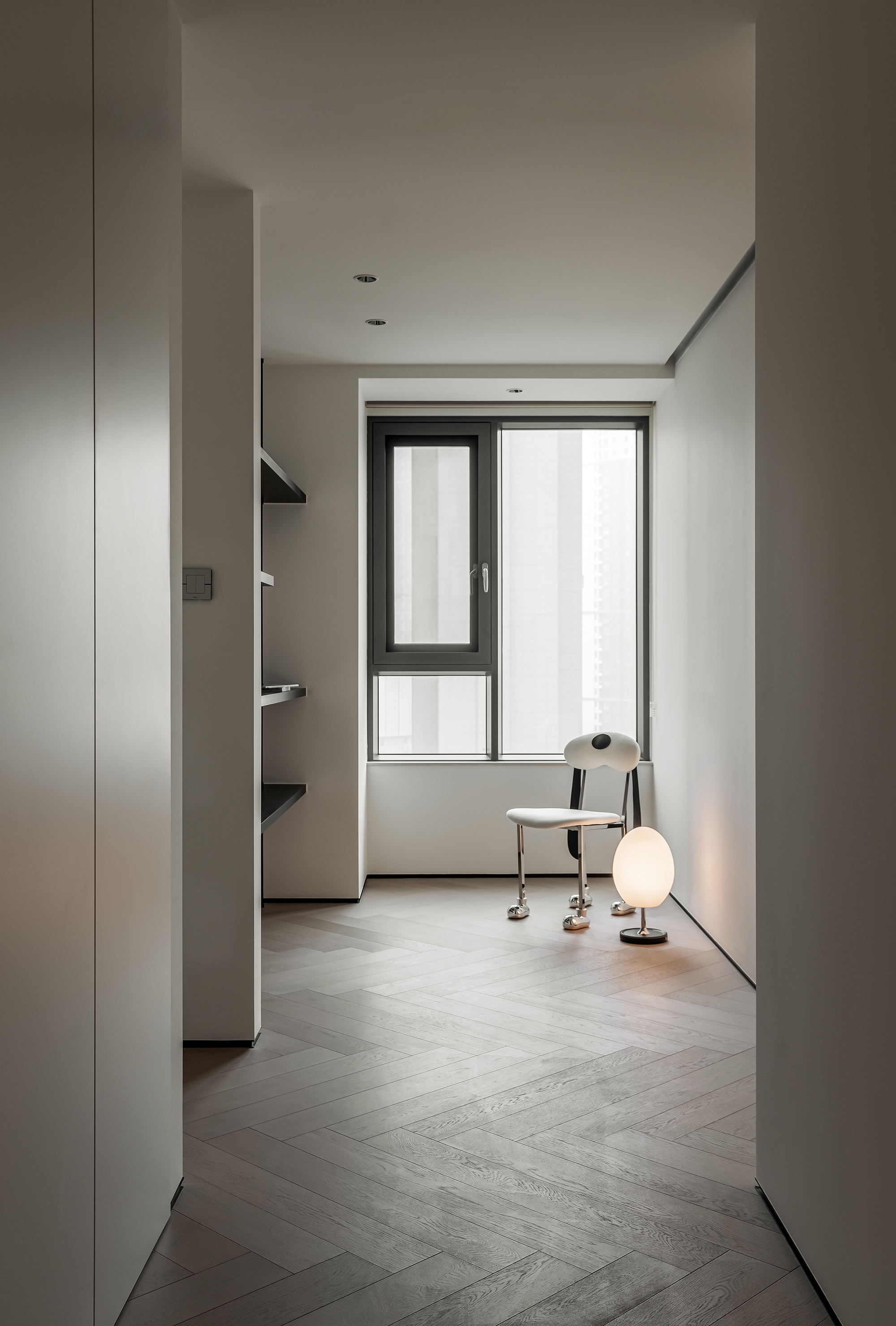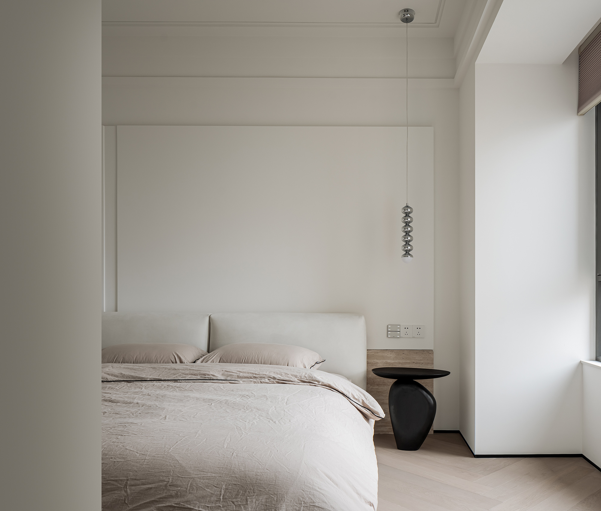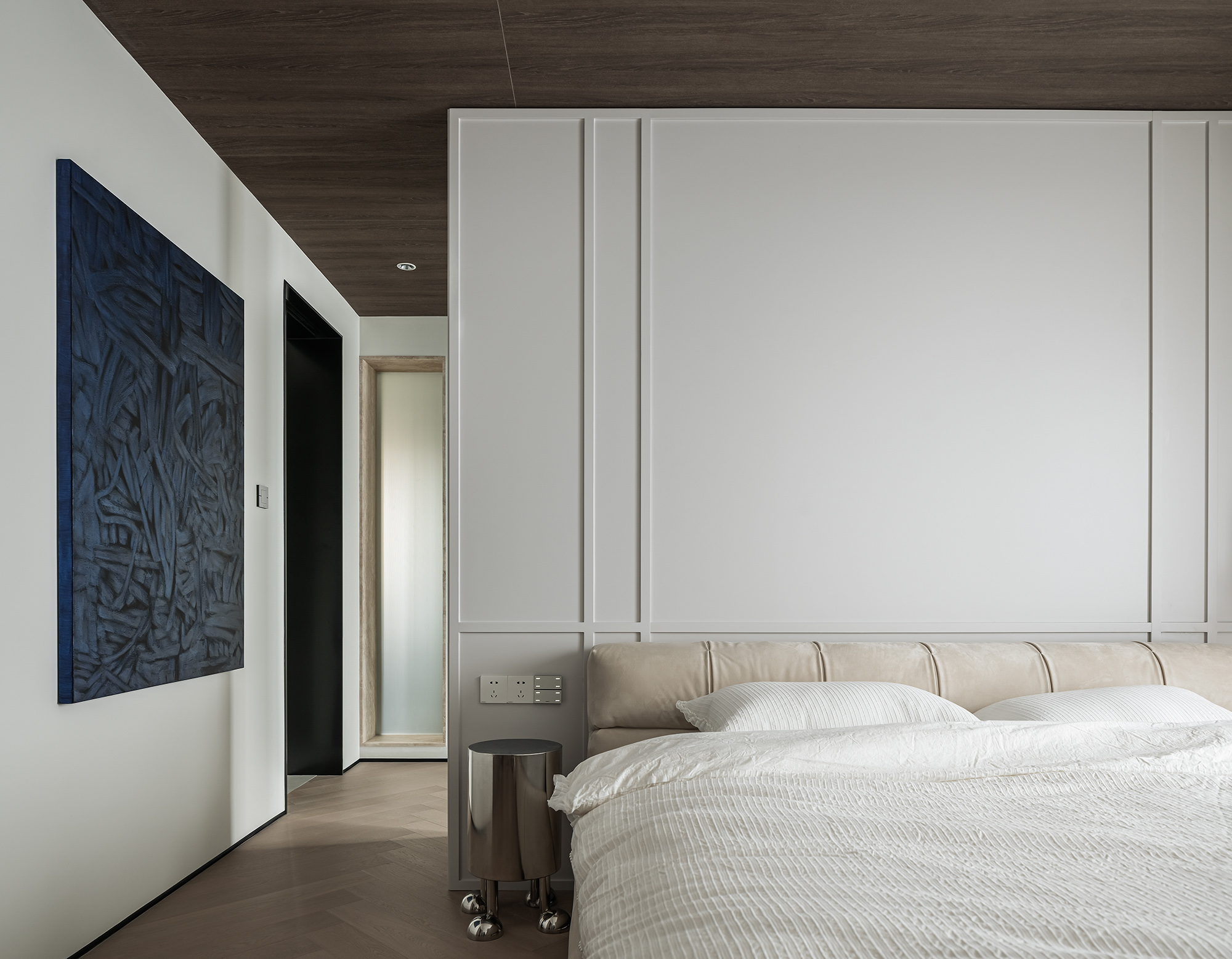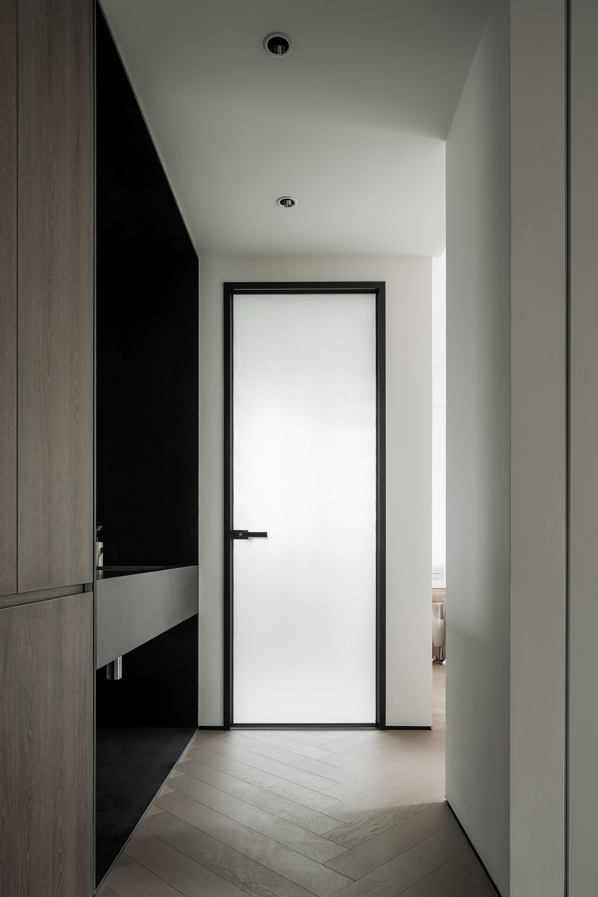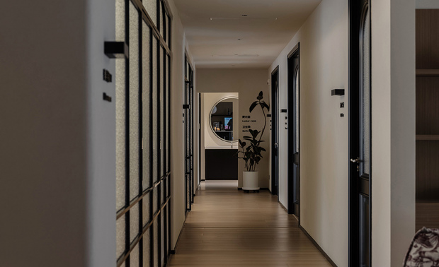 玄关、走廊尽头、主卧床头、淋浴区墙体的细节处理,巧妙将光线引到较暗区域
