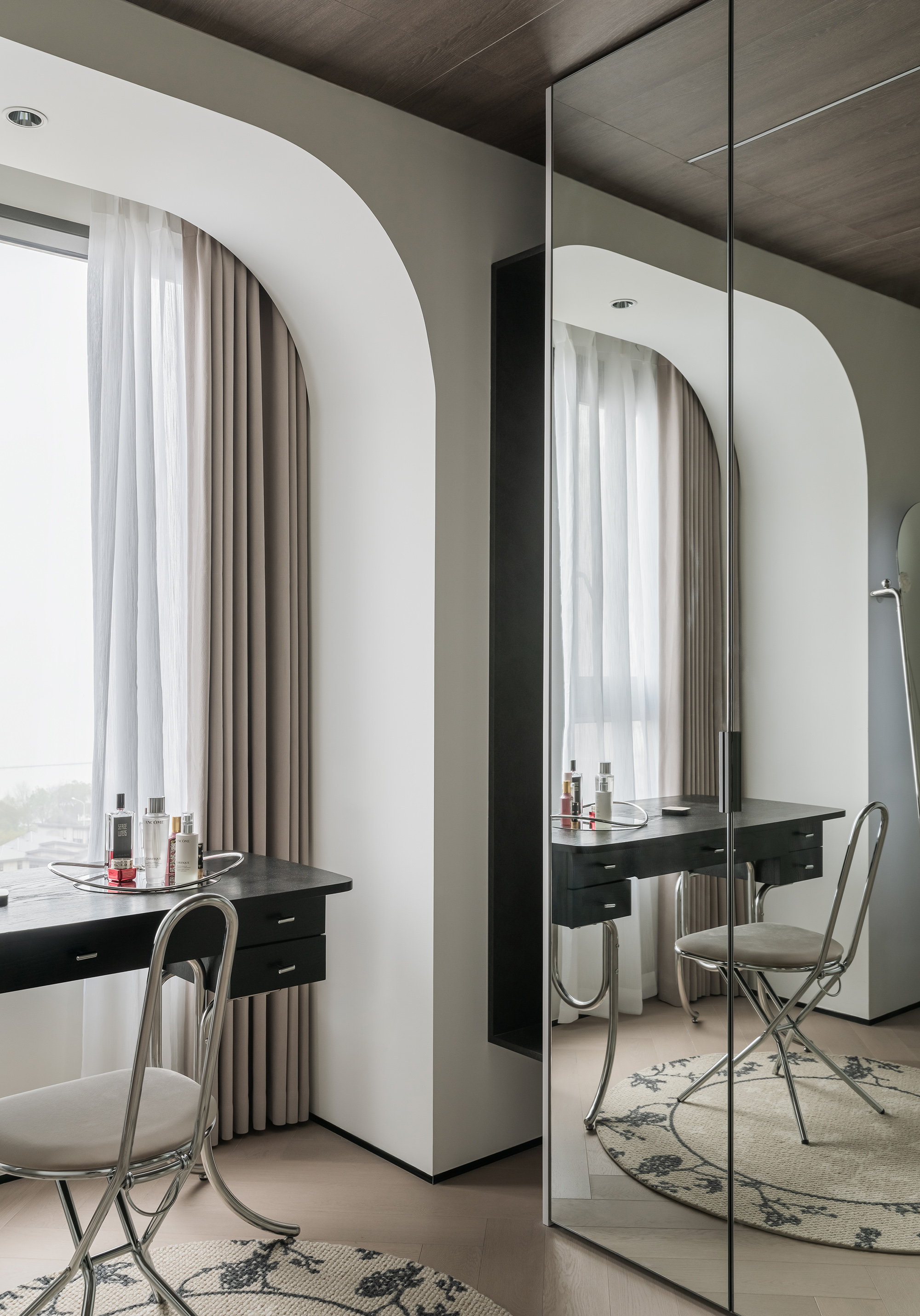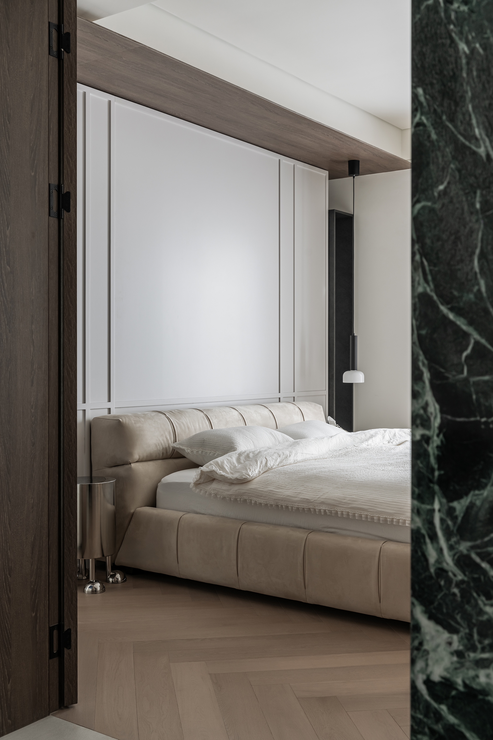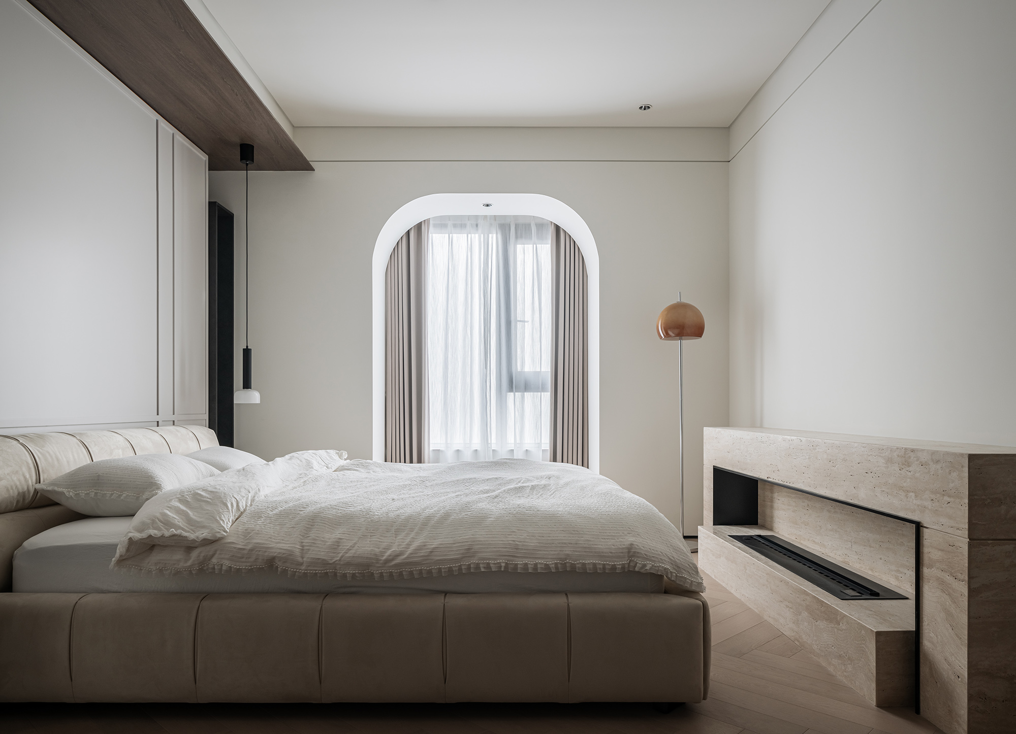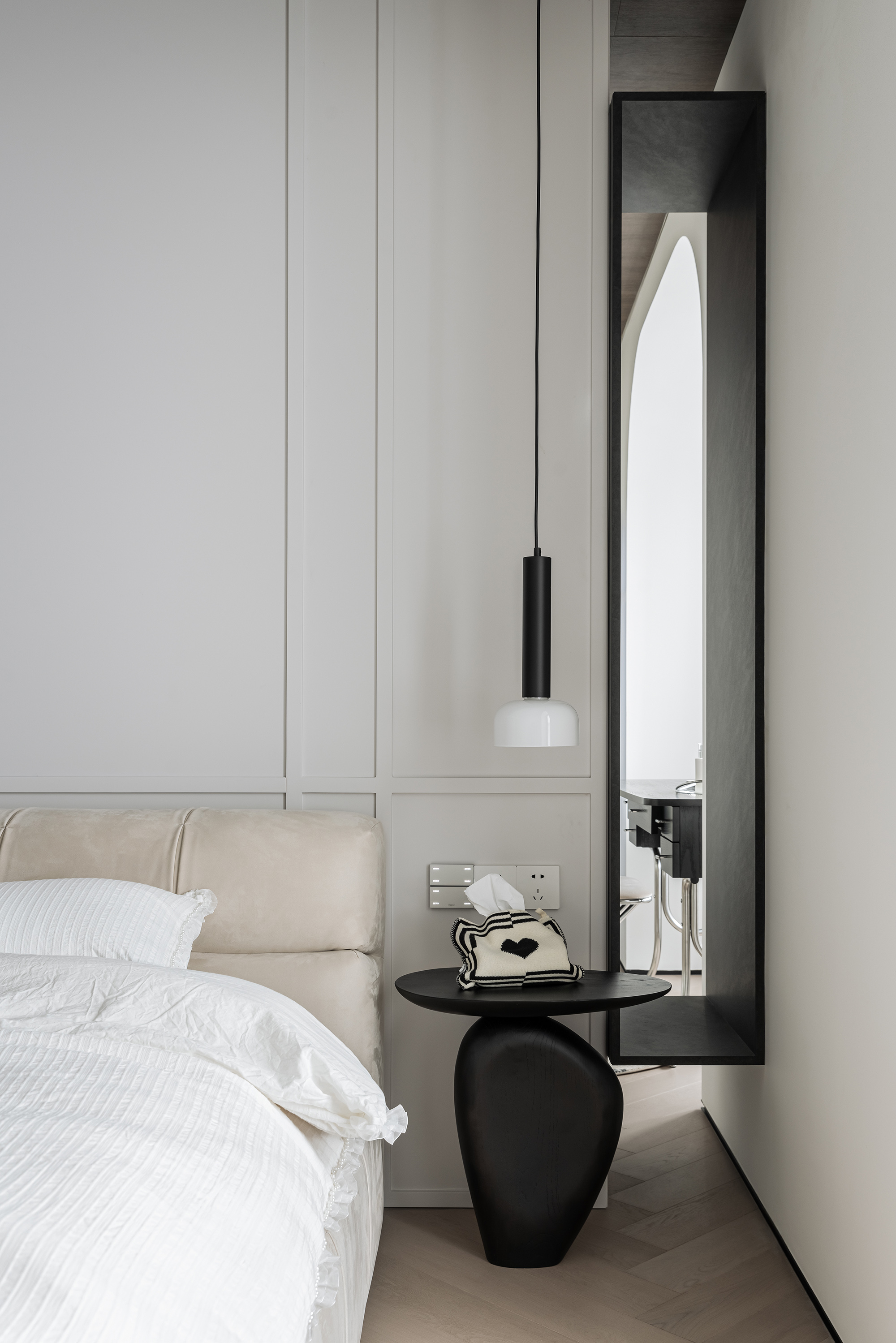 玄关、走廊尽头、主卧床头、淋浴区墙体的细节处理,巧妙将光线引到较暗区域