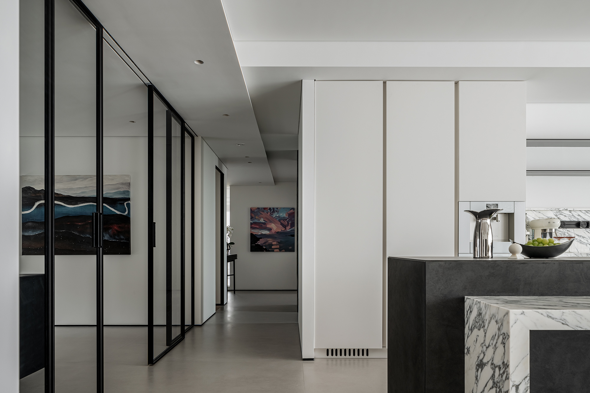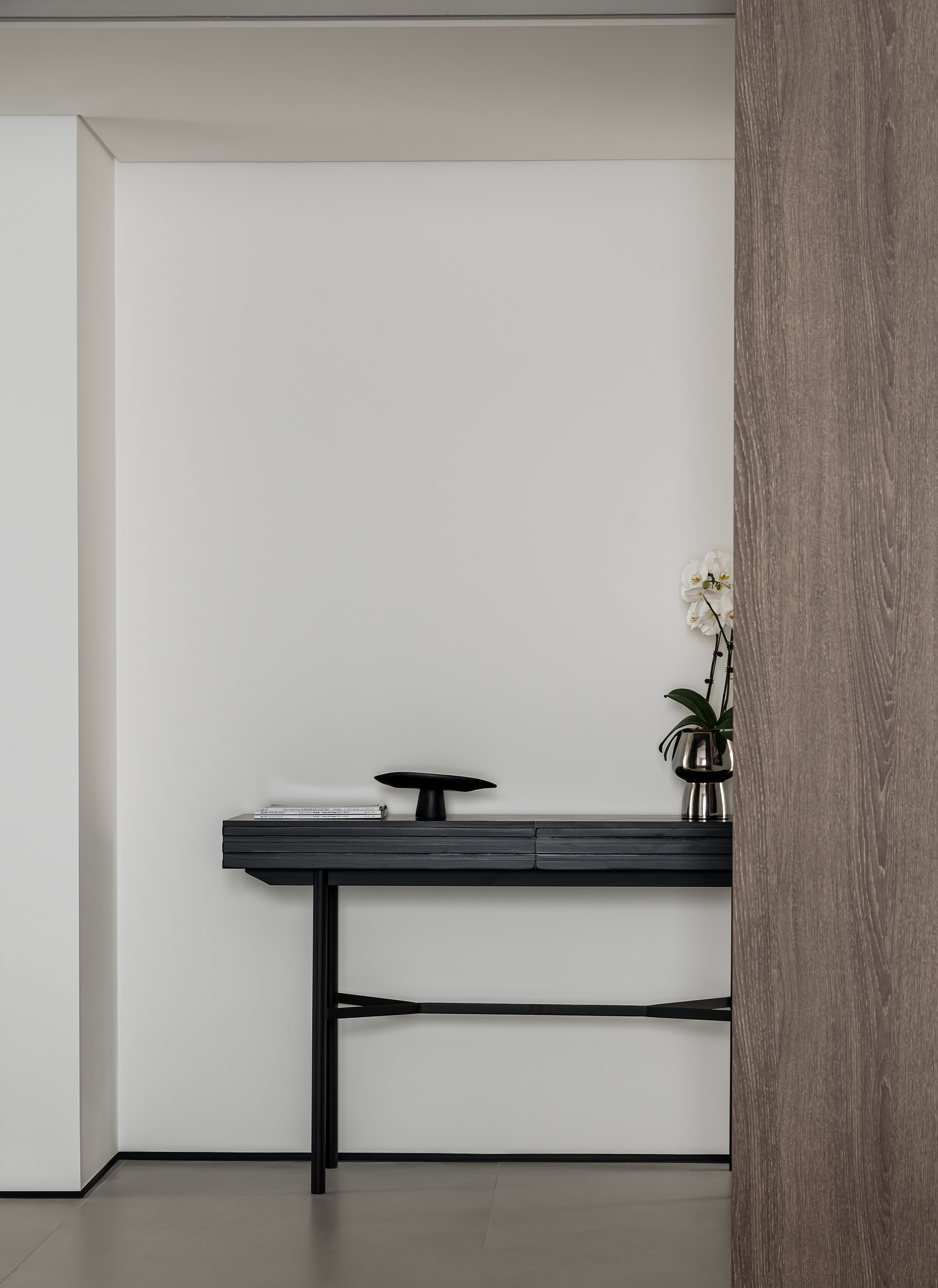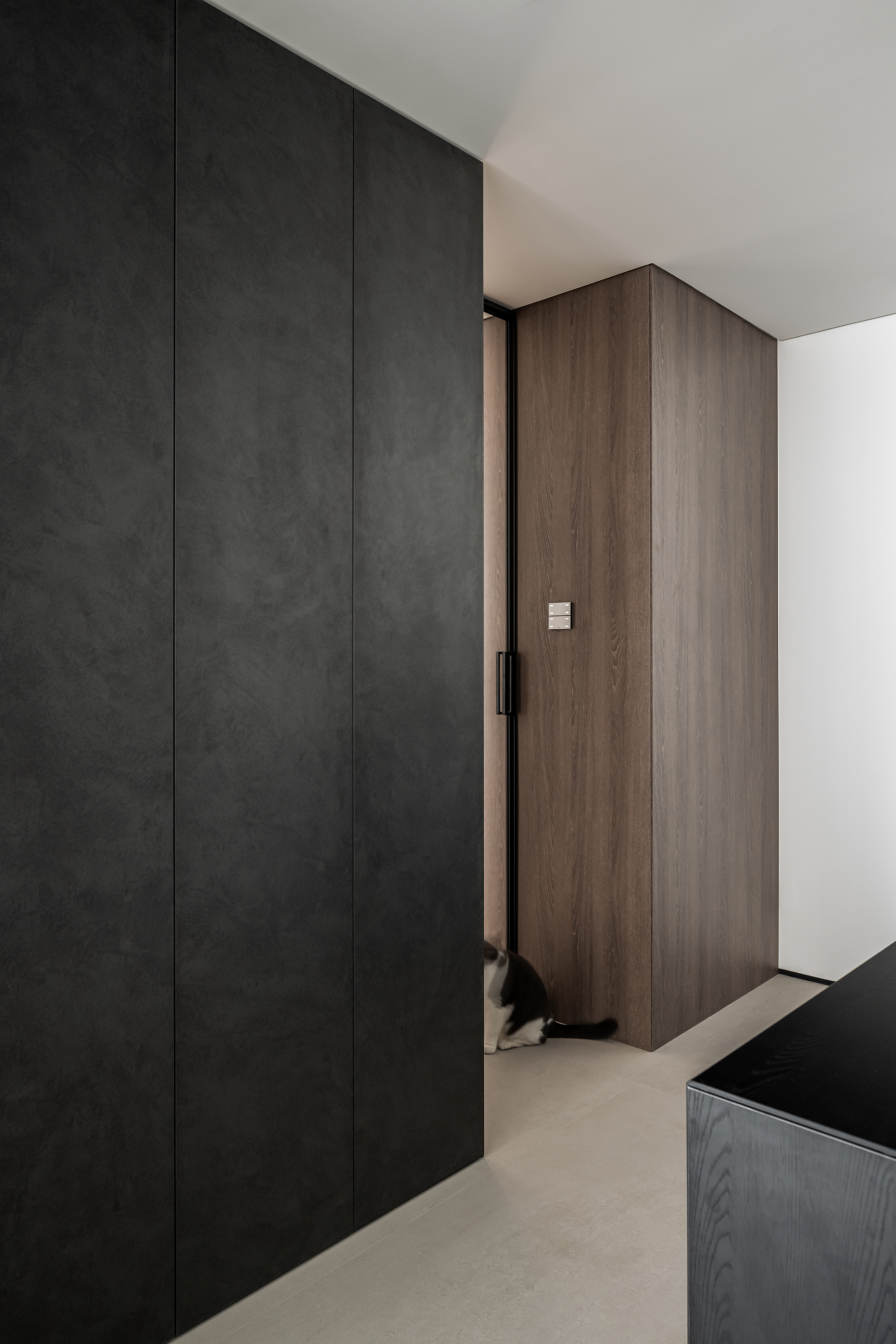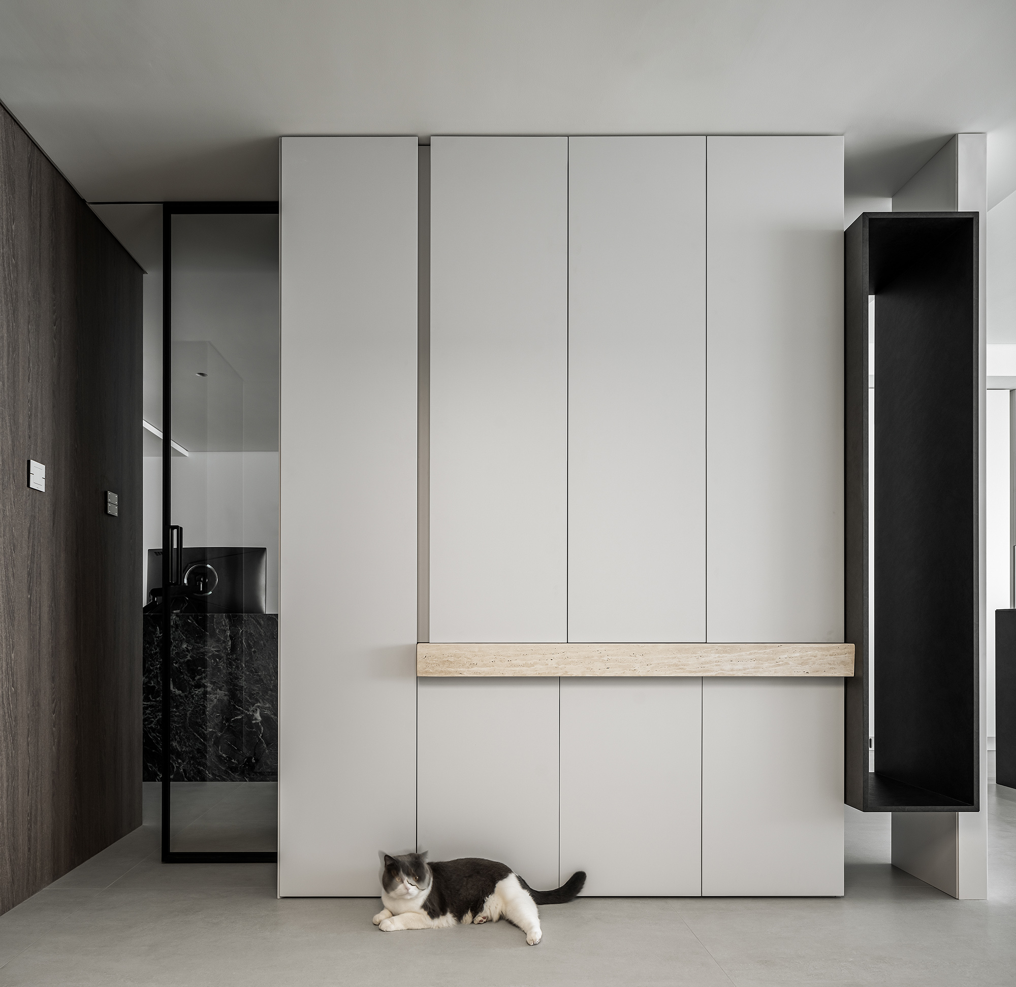 空间意境:玄关作为家的起点,需要向来者缓缓展开家的面貌,也需要表达出屋主的个性。在满足储物需求的同时,我们将柜子做得的更有设计感。在到顶的柜子中,加入一个横向和一个竖向体块,并将两个体块做一个深度的进退,让整个柜子更具层次感。
