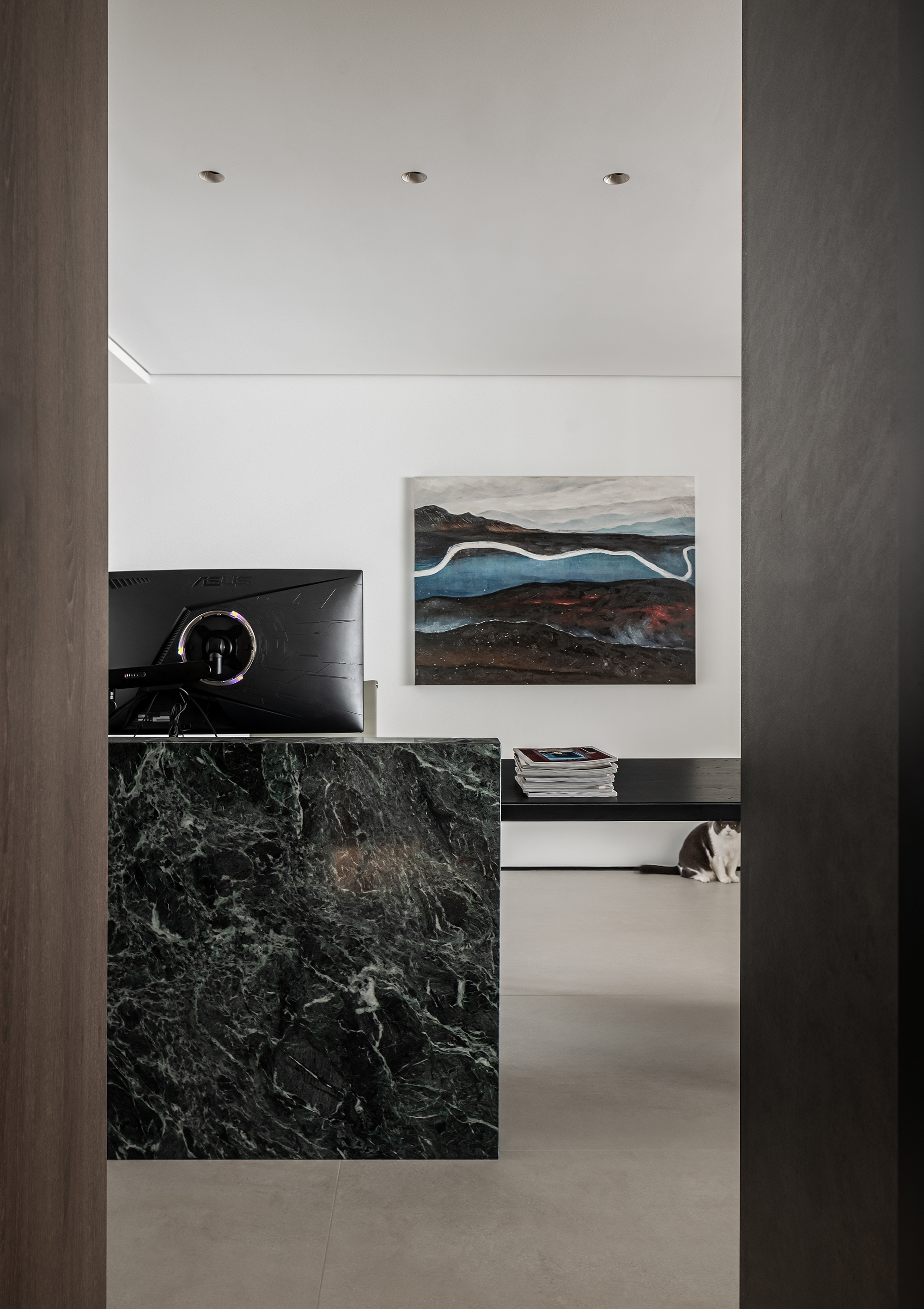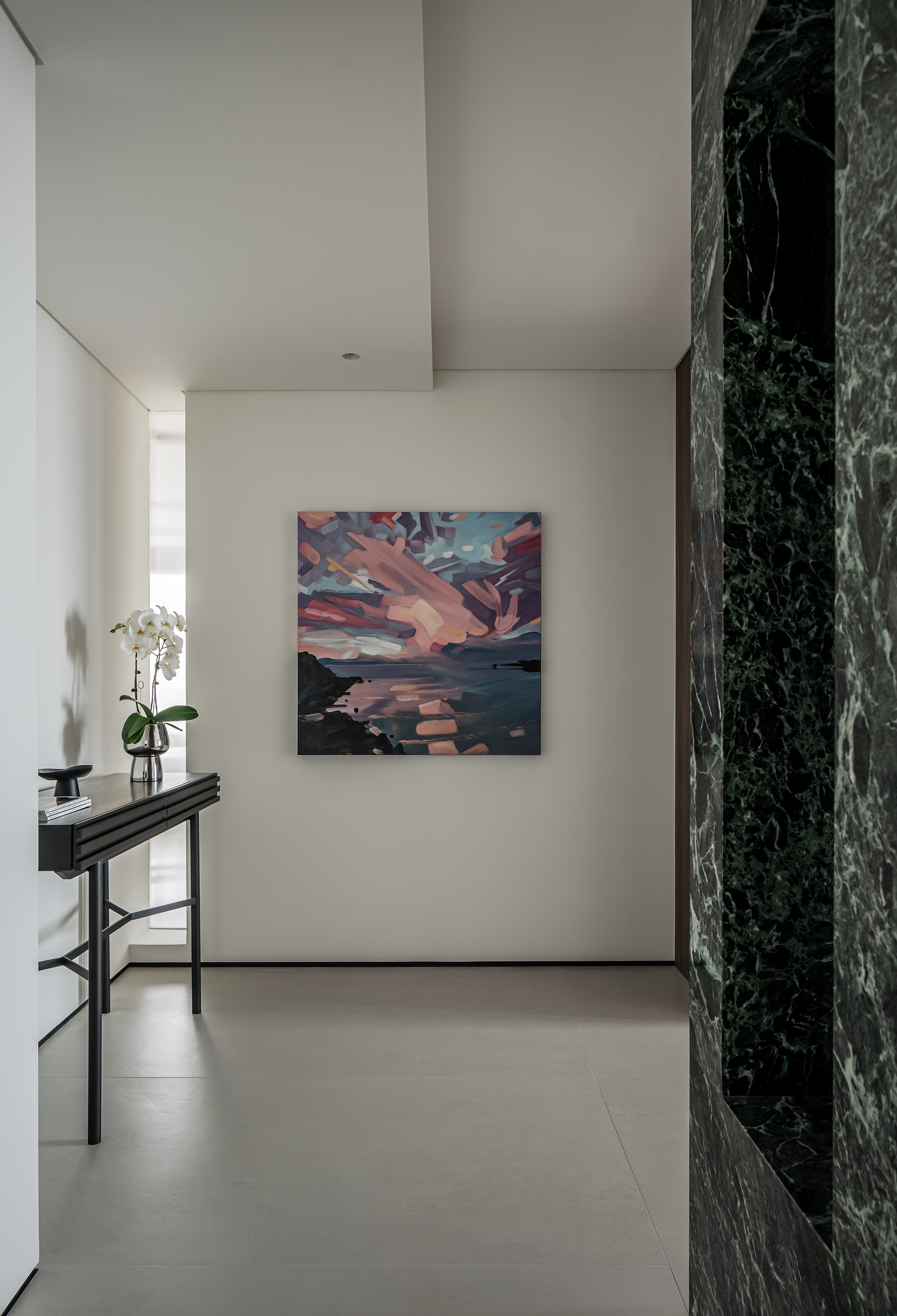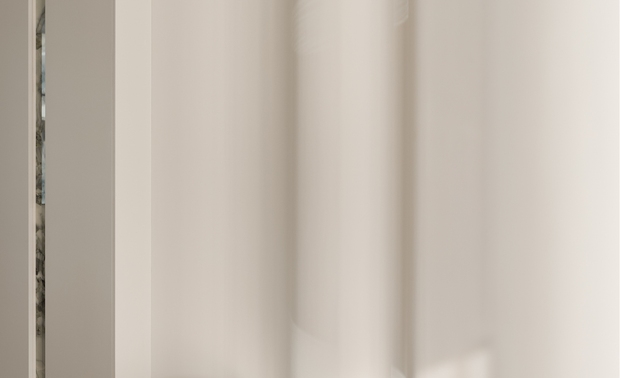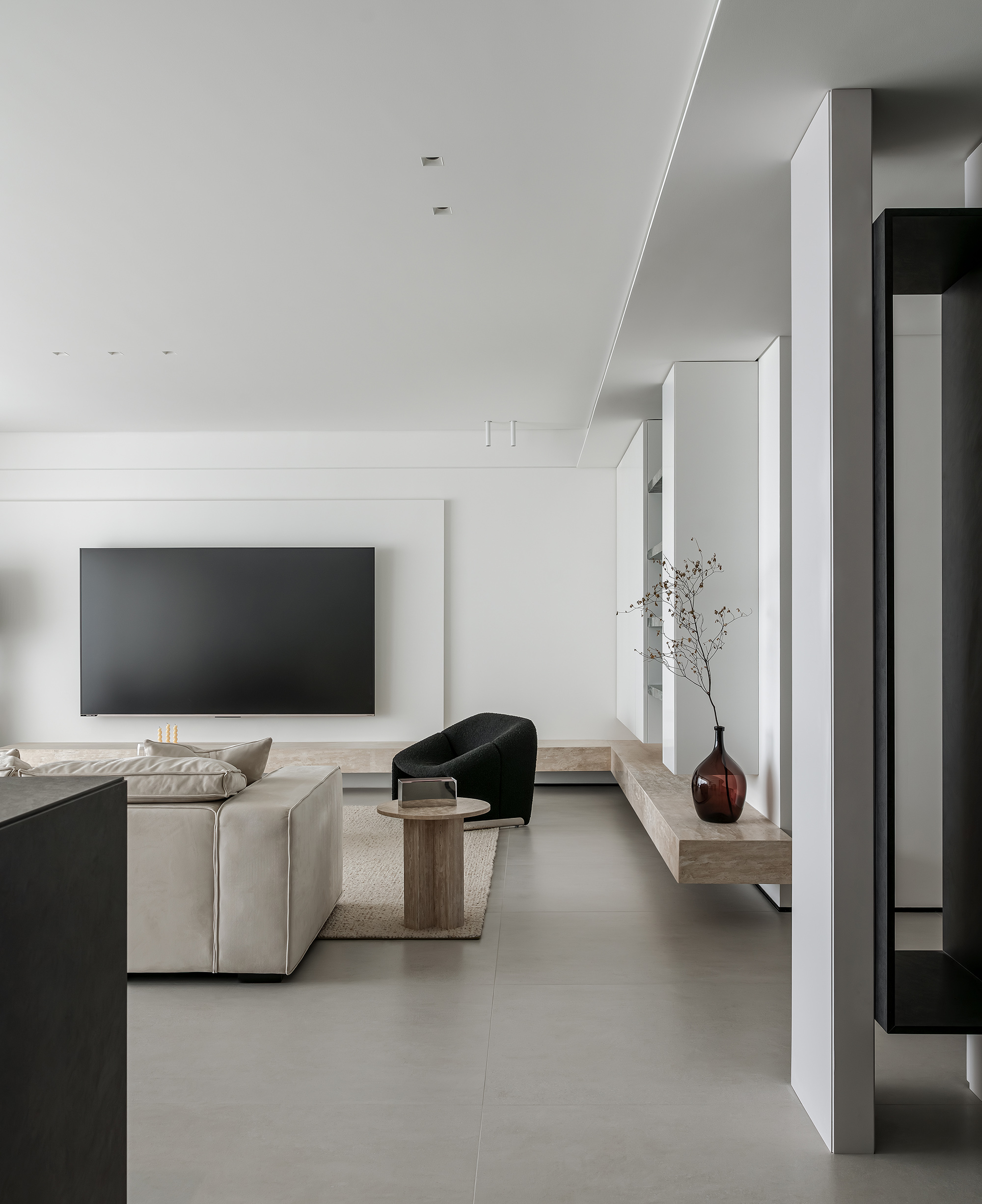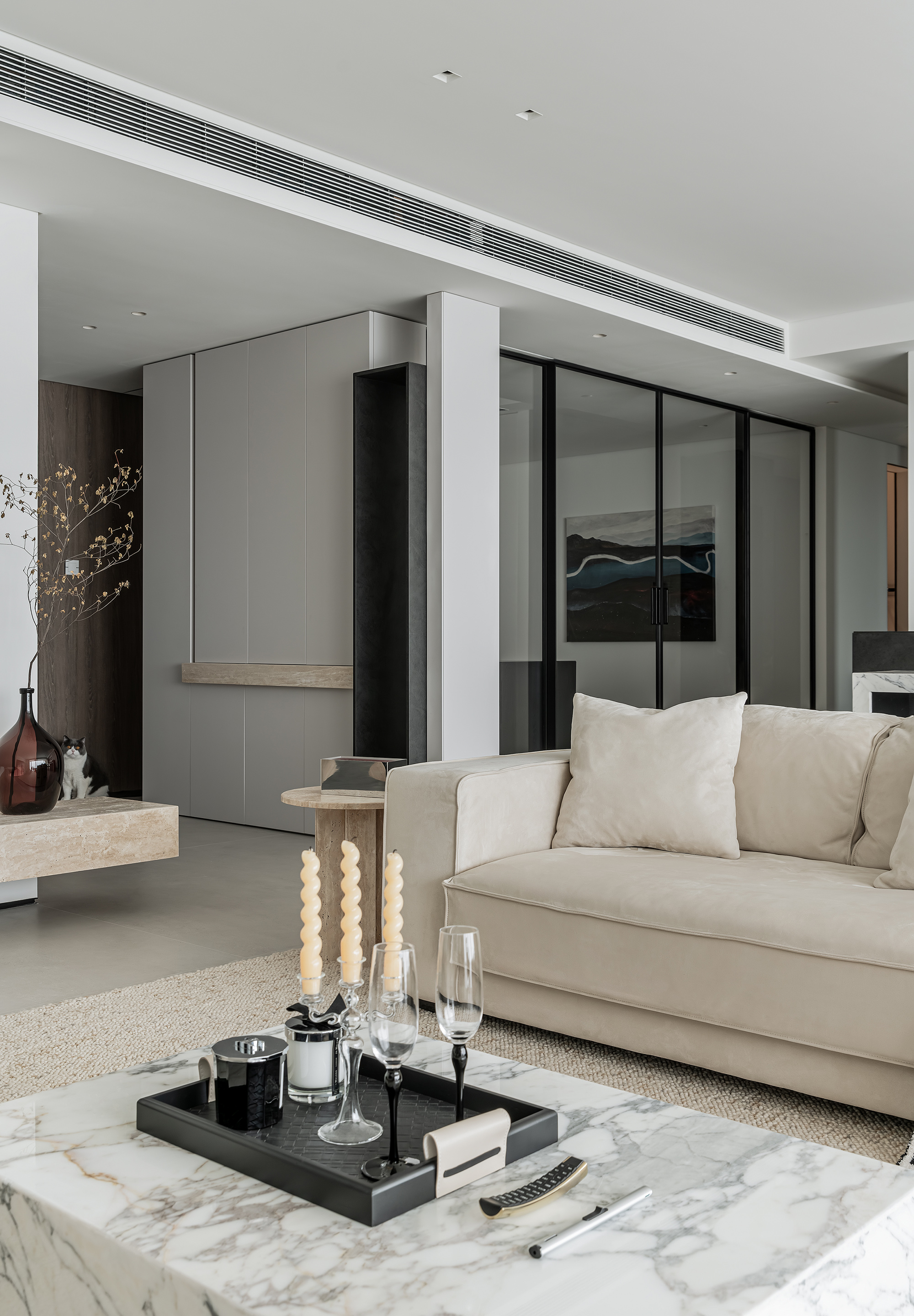 空间意境:玄关作为家的起点,需要向来者缓缓展开家的面貌,也需要表达出屋主的个性。在满足储物需求的同时,我们将柜子做得的更有设计感。在到顶的柜子中,加入一个横向和一个竖向体块,并将两个体块做一个深度的进退,让整个柜子更具层次感。