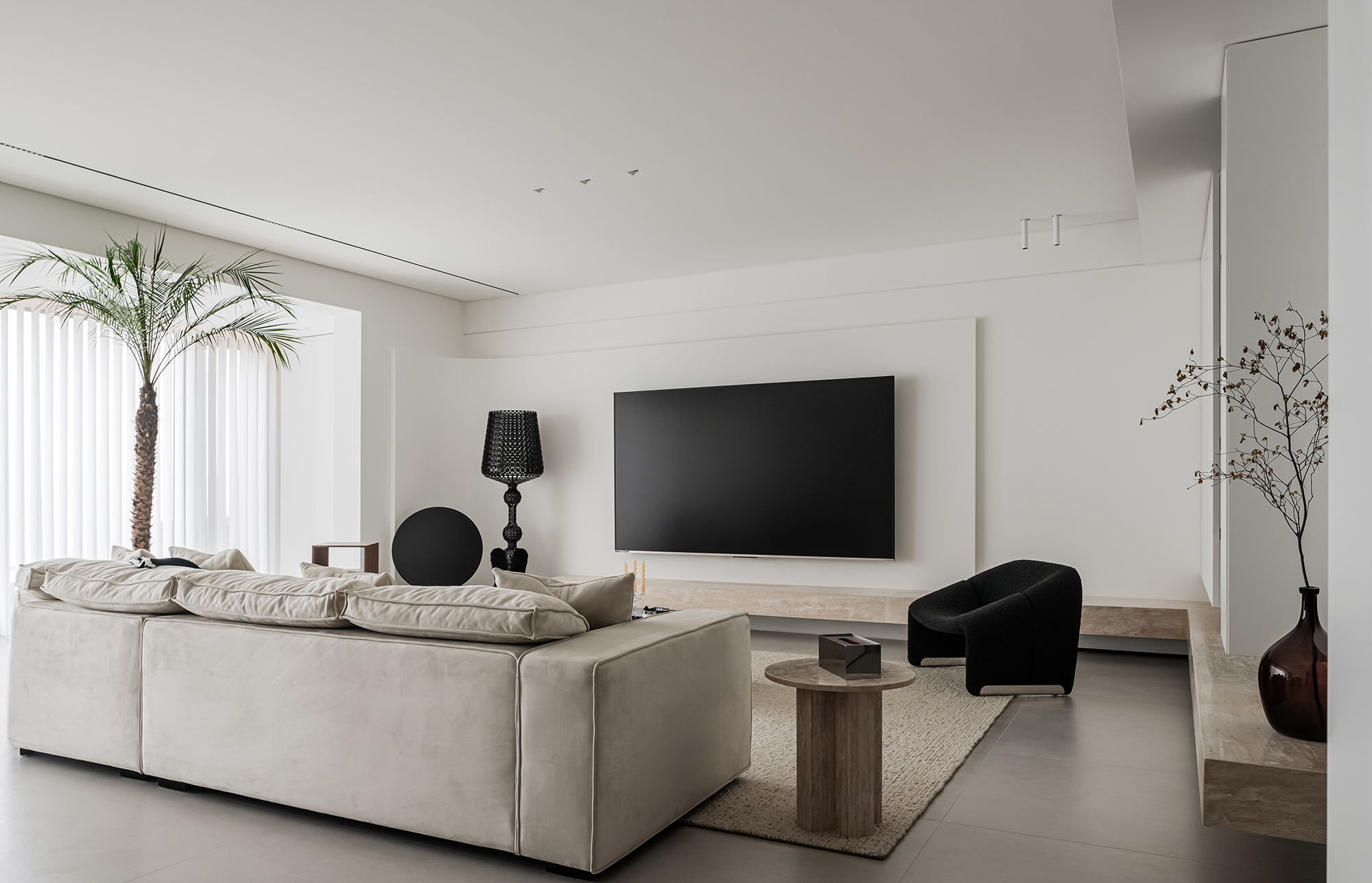 温煦的阳光透过梦幻帘,刺葵的加入,使空间氤氲在自然休闲的氛围之中。通铺的灰色地砖,是流动性的开放布局;灵活的动线,承载的是多元化的生活需求。 -