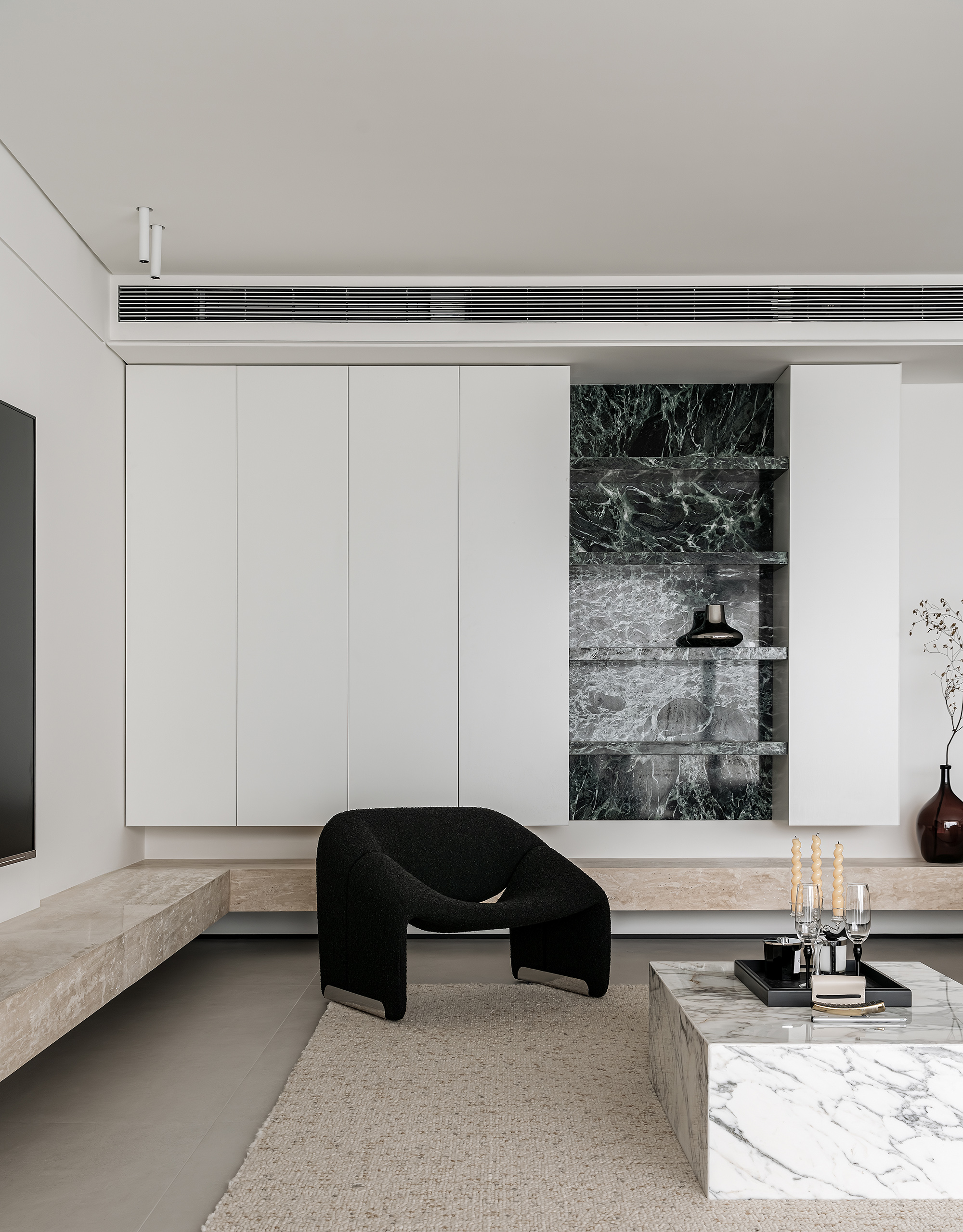 设计选材:素净的空间里,天然石材的原生美感更为凸显,高级的氛围感应运而生。点缀些许深色,在深与浅中寻找微妙的平衡。在大地色系的温暖氛围之中,普拉达绿成为空间中不可或缺的一抹色彩。体块间的穿插,构建出独一无二的景致,质感、光线、肌理、香气在这里联结,万千美好都在不经意的细节处绽放。