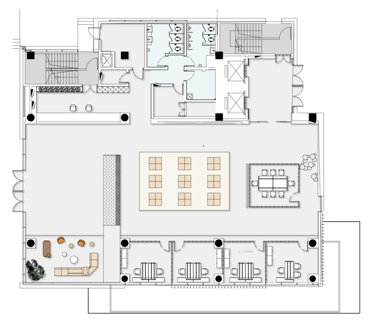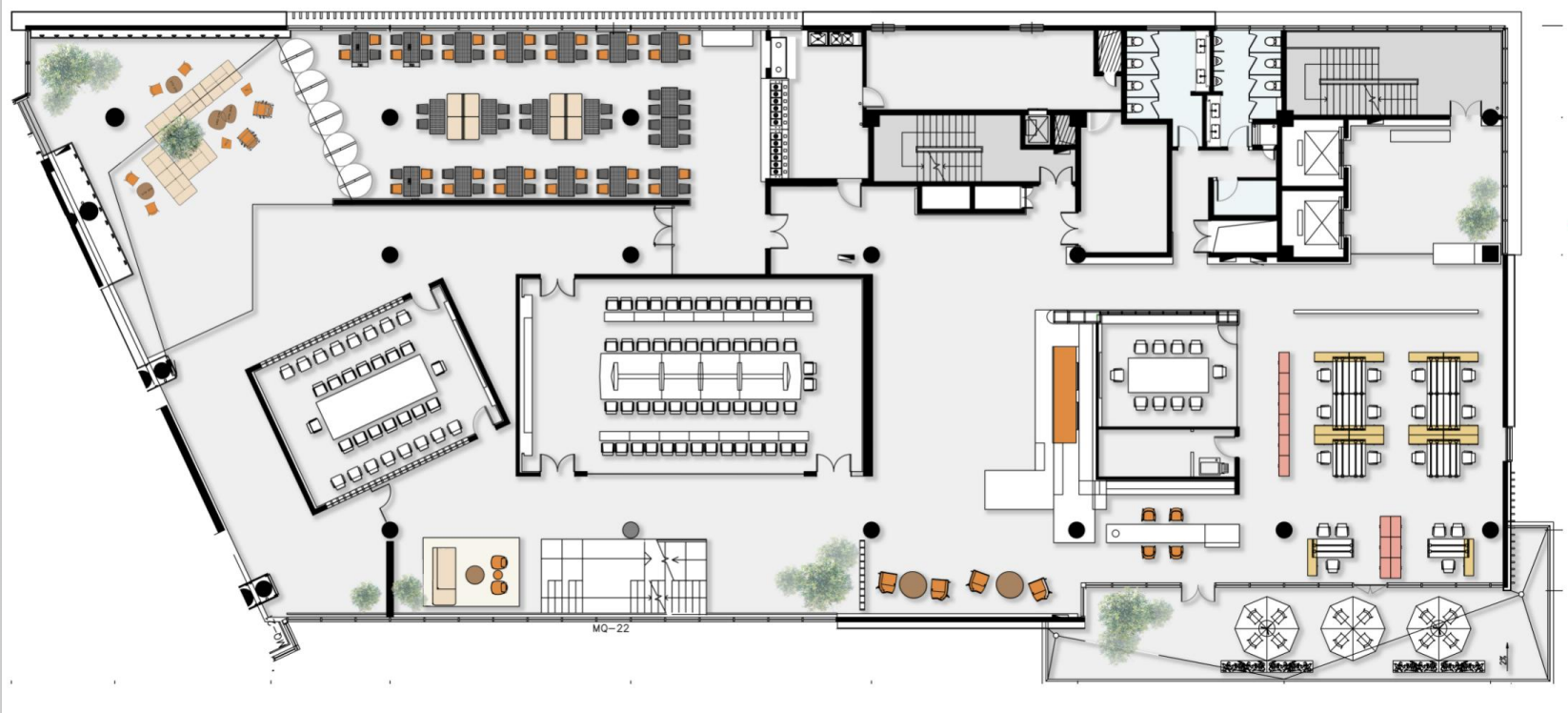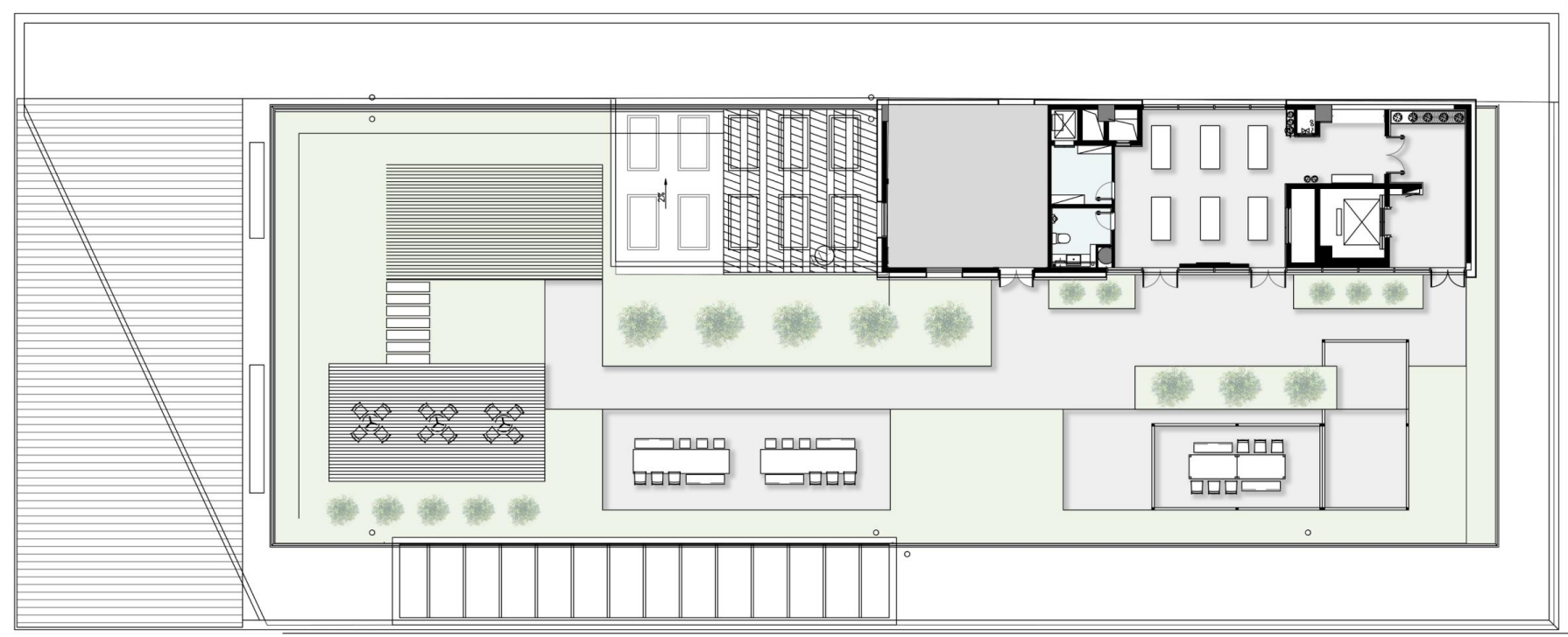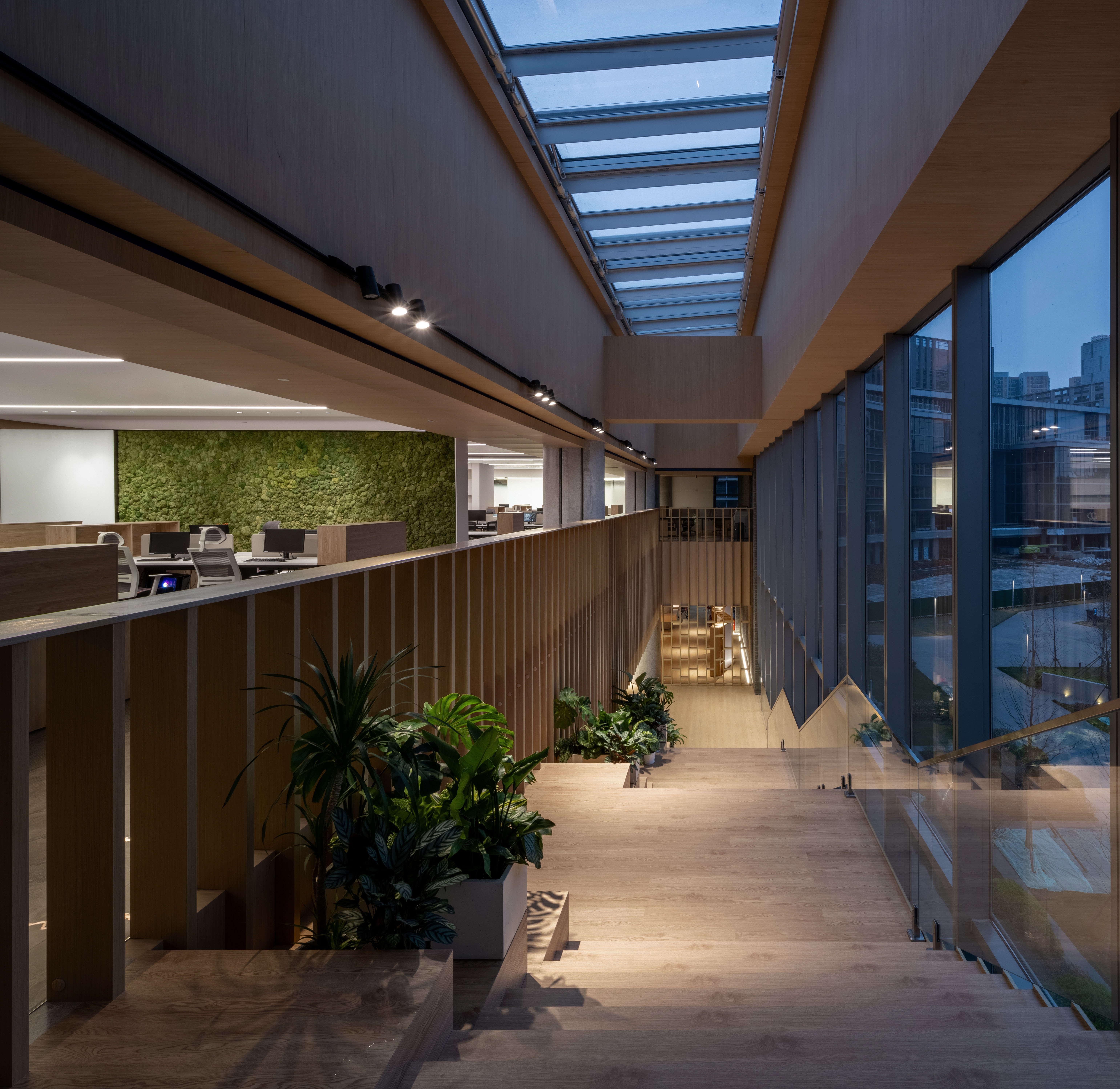 1层为前厅接待,2层为大型报告厅及餐厅,3层为集中办公层,四层健身房结合户外露台花园使用。