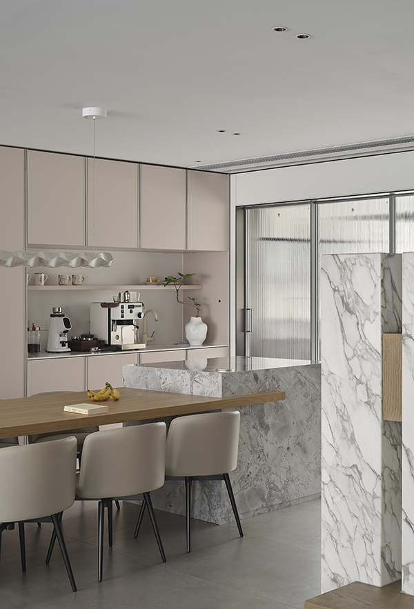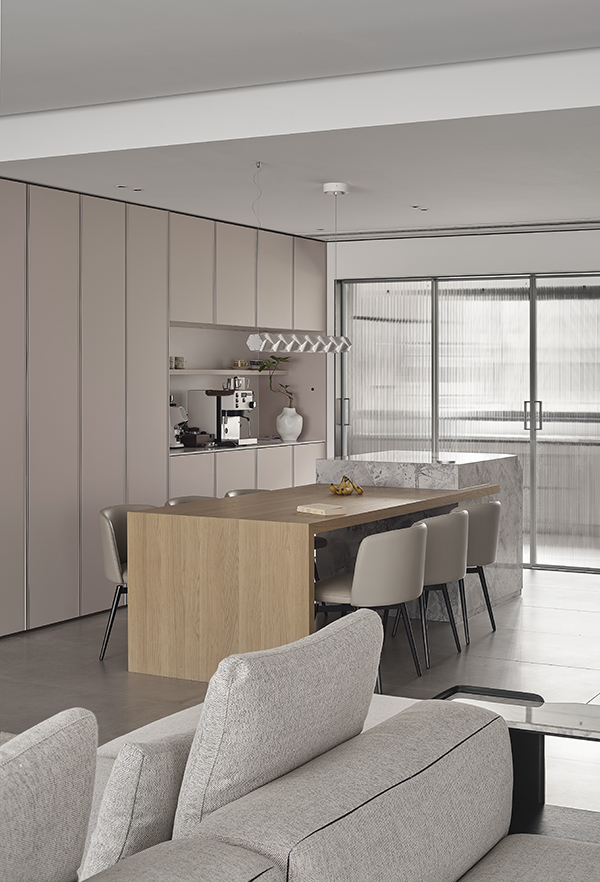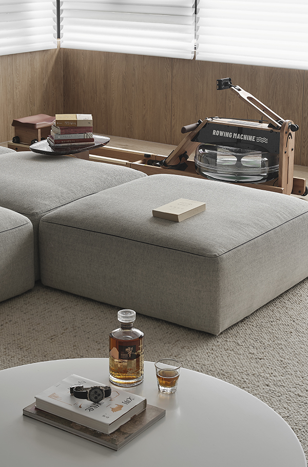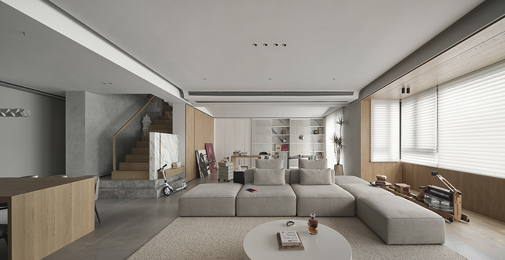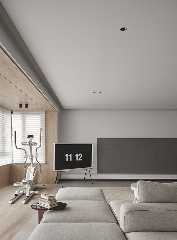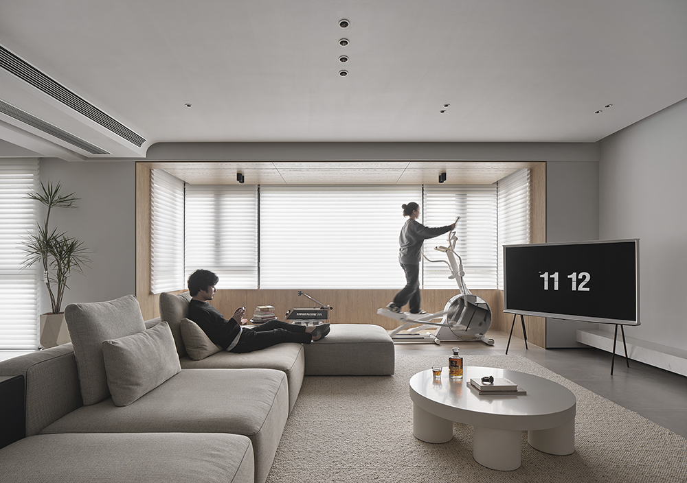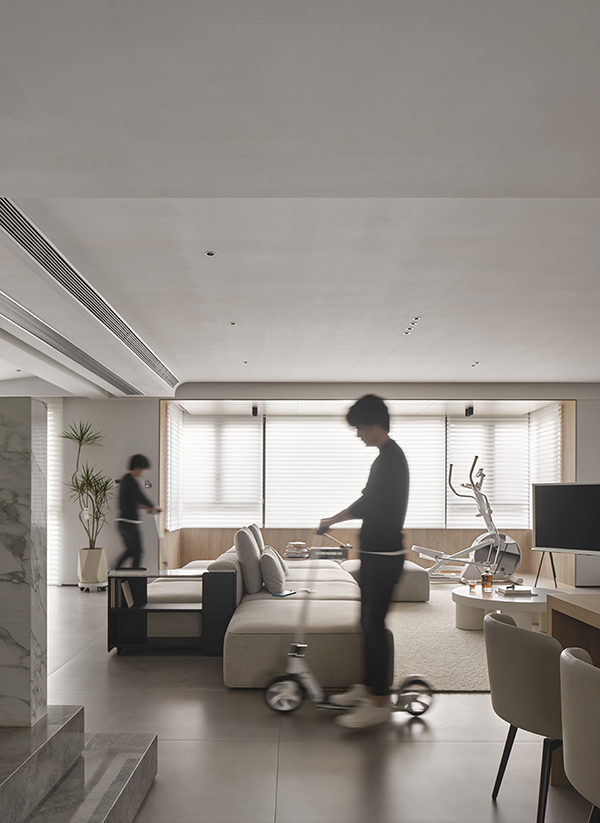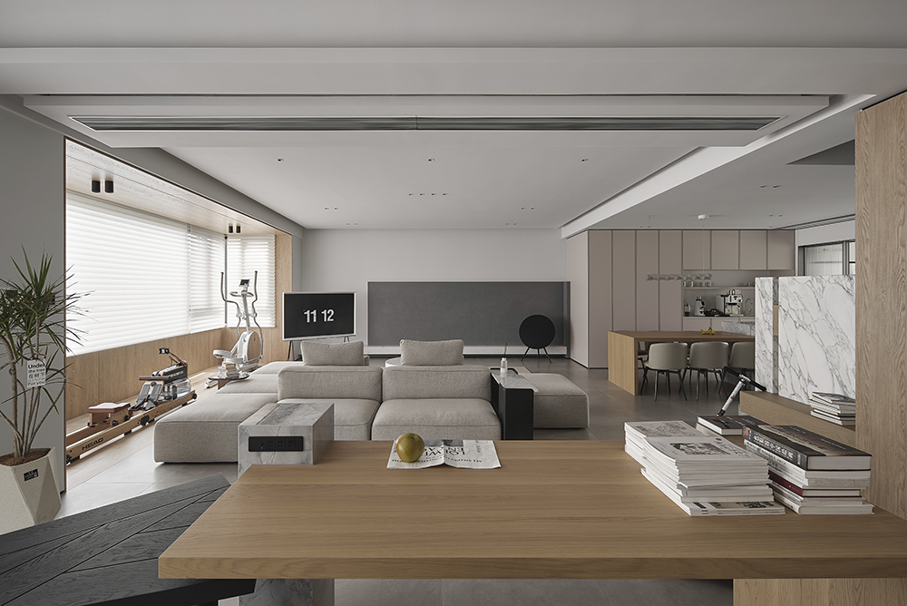 生活集中在这一个空间里,健身、品茶、分享、阅读…可以同时发生,无界的动线连接客厅区和餐厅区之间的联系,动与静的元素和谐共处。