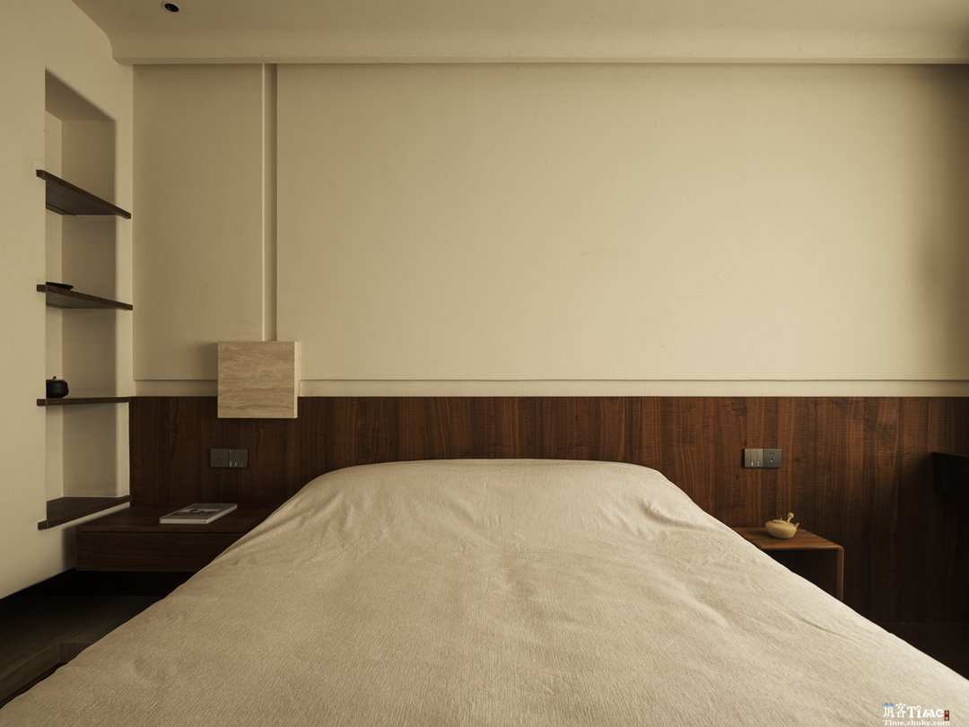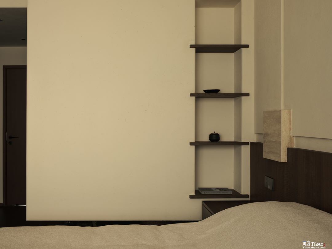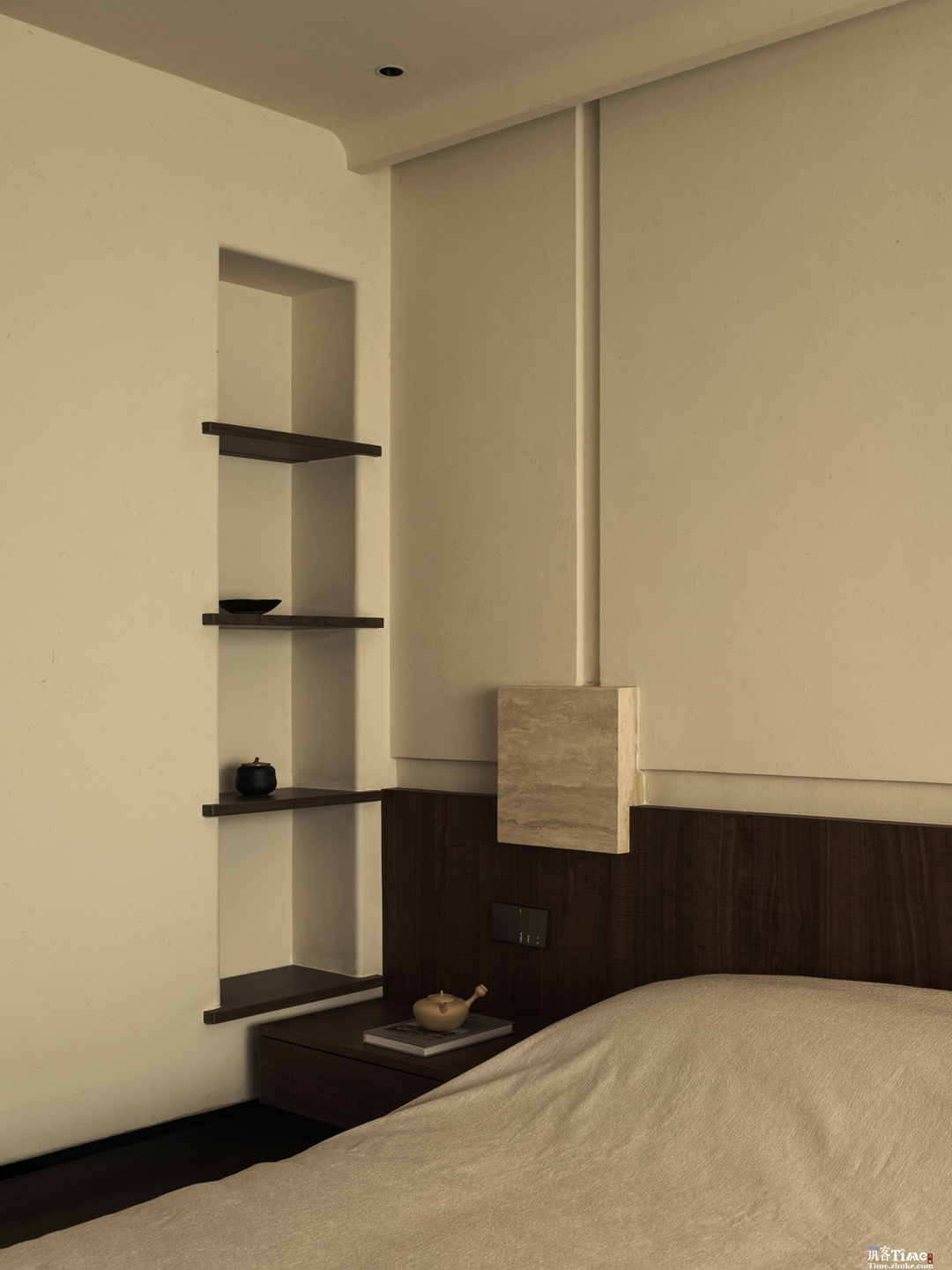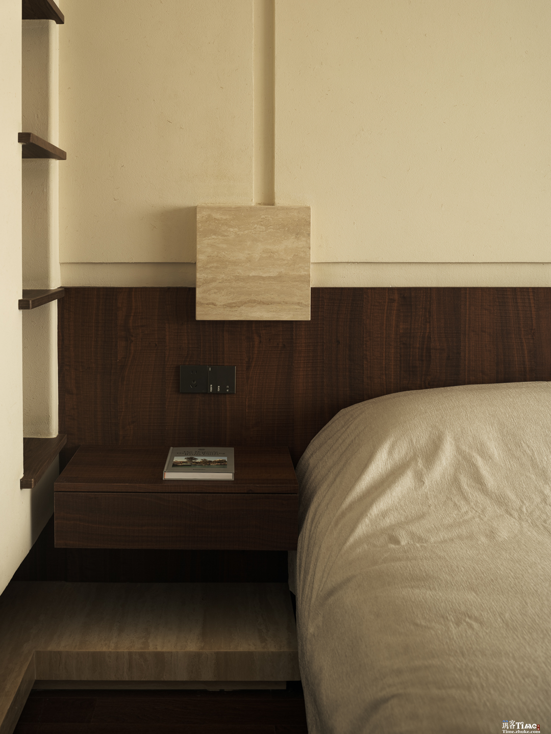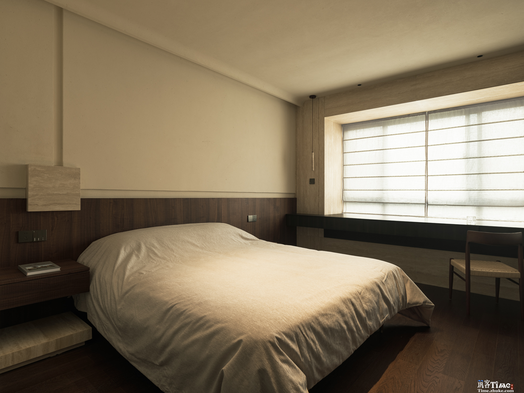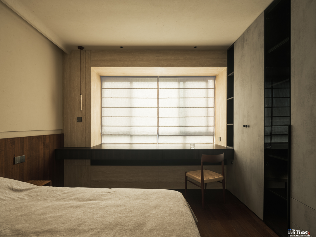 原始的主卧带有封闭的衣帽间,几乎没有采光,因此,砸开墙面,邀光入室,进入主卧的墙面做成悬空墙面,让采光从上下左右都进入,同时墙面也有了置物功能,主卧以套房的形式展开设计,独立的步入衣帽间满足丰富的储纳需求,亦不影响主卧的整洁度,洞石+老榆木的元素在这里亦体现,是客厅的材质元素呼应,飘窗放大尺度,改造成为一个大的办公书桌,办公休息两不误。