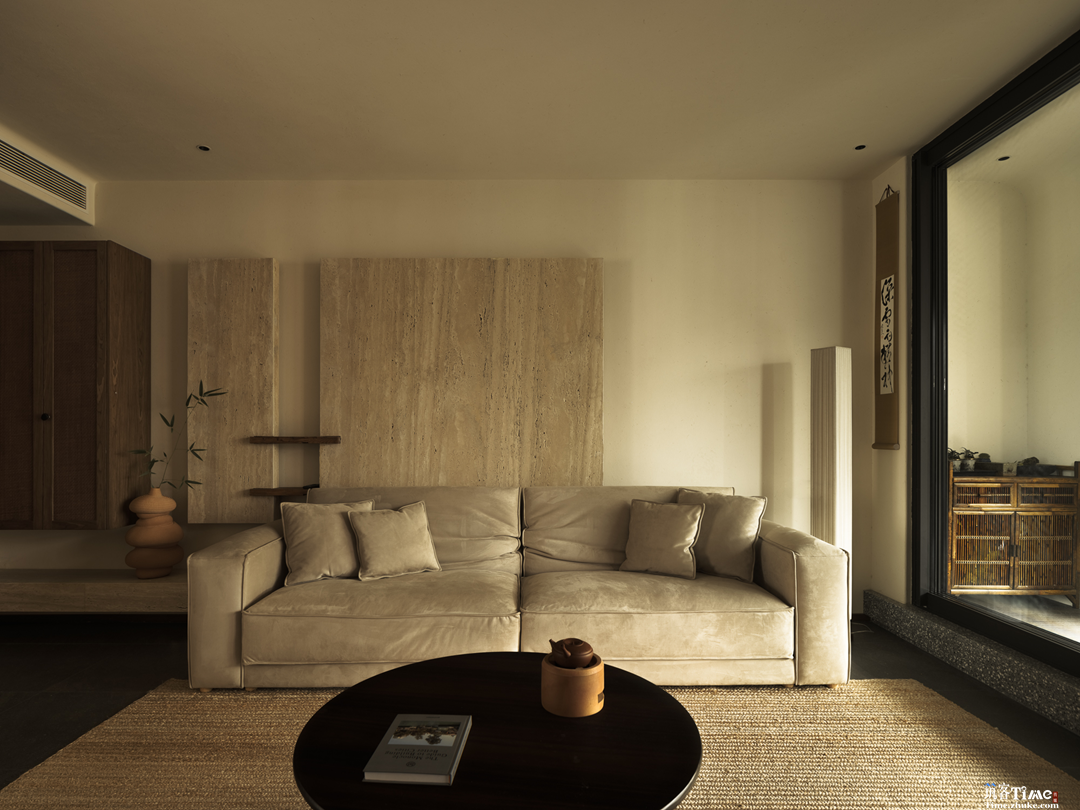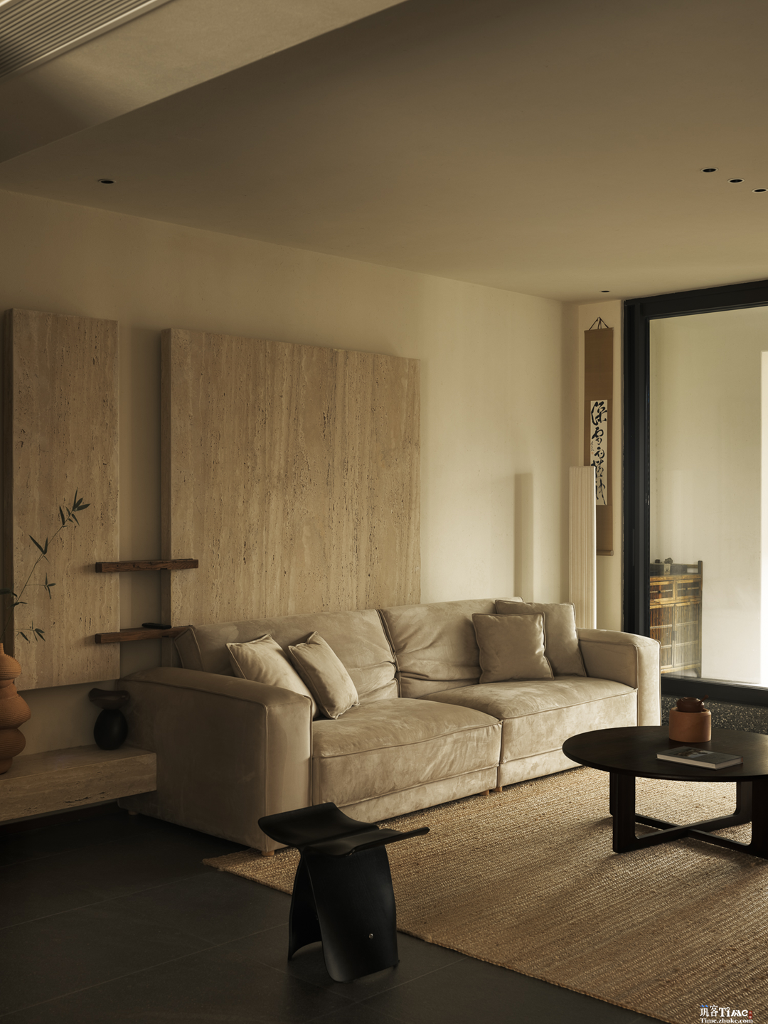空间的尺度和间隙是设计的精妙之处,作为本案精妙的设计点——露台改造,让位于高楼层的空间有了不一样的感觉,沙发墙用洞石配以老榆木板打造造型亦营造了自然品质的仪式氛围感;