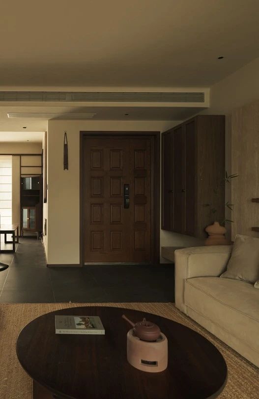素雅是最能共情的,设计师将空间的整体色调定调暖中有序,电梯入户,因此原始的入户外门厅空间足够大,可以充分满足鞋柜风雨柜的安放需求,因此入户设计悬浮的储物墙柜,与沙发墙同步,设计师并没有可以的放置更多的储物柜,让入户从克制的尺度展开,小几配画作,是点到为止的气质,也让进入的情绪缓缓放松;