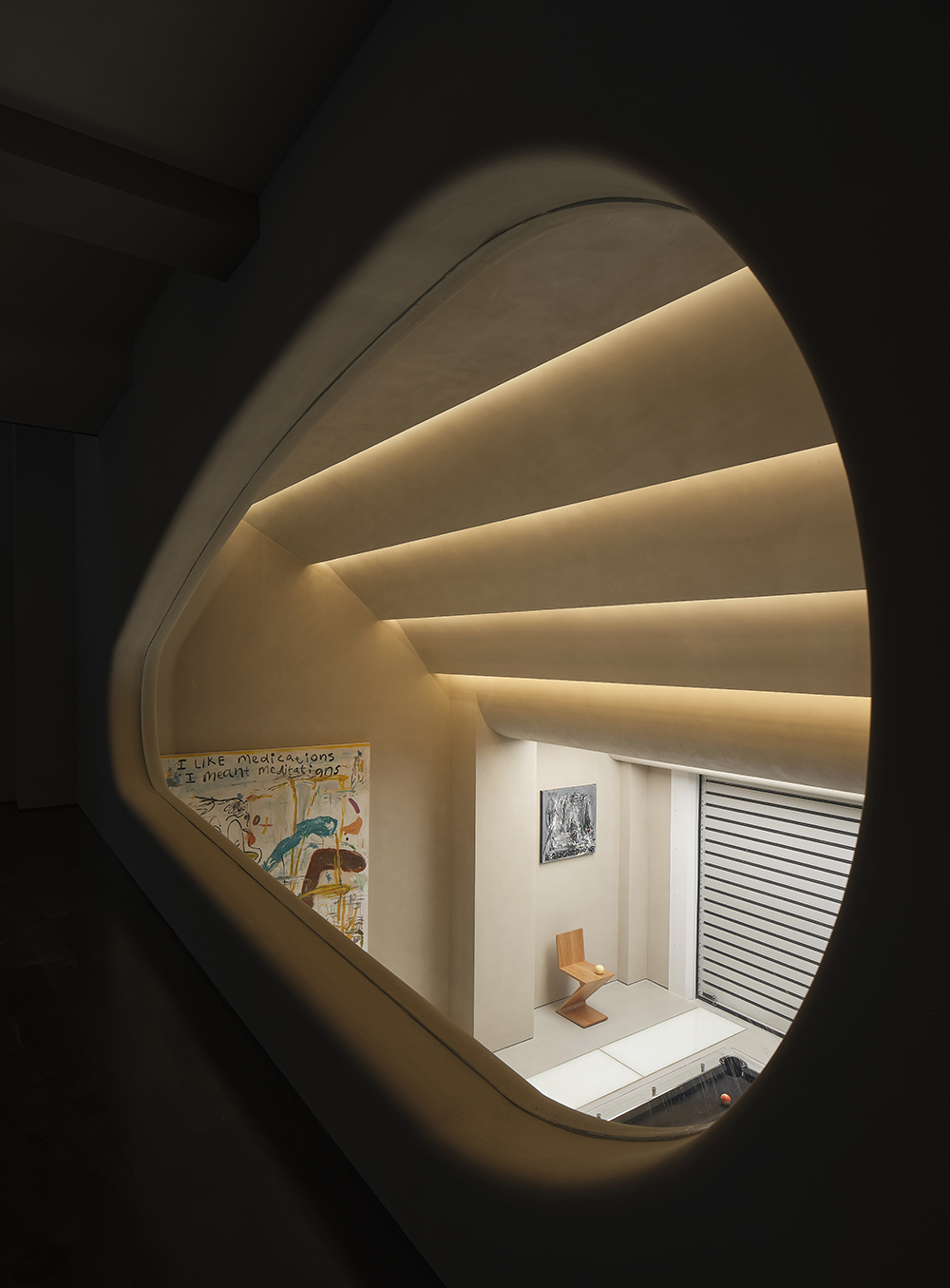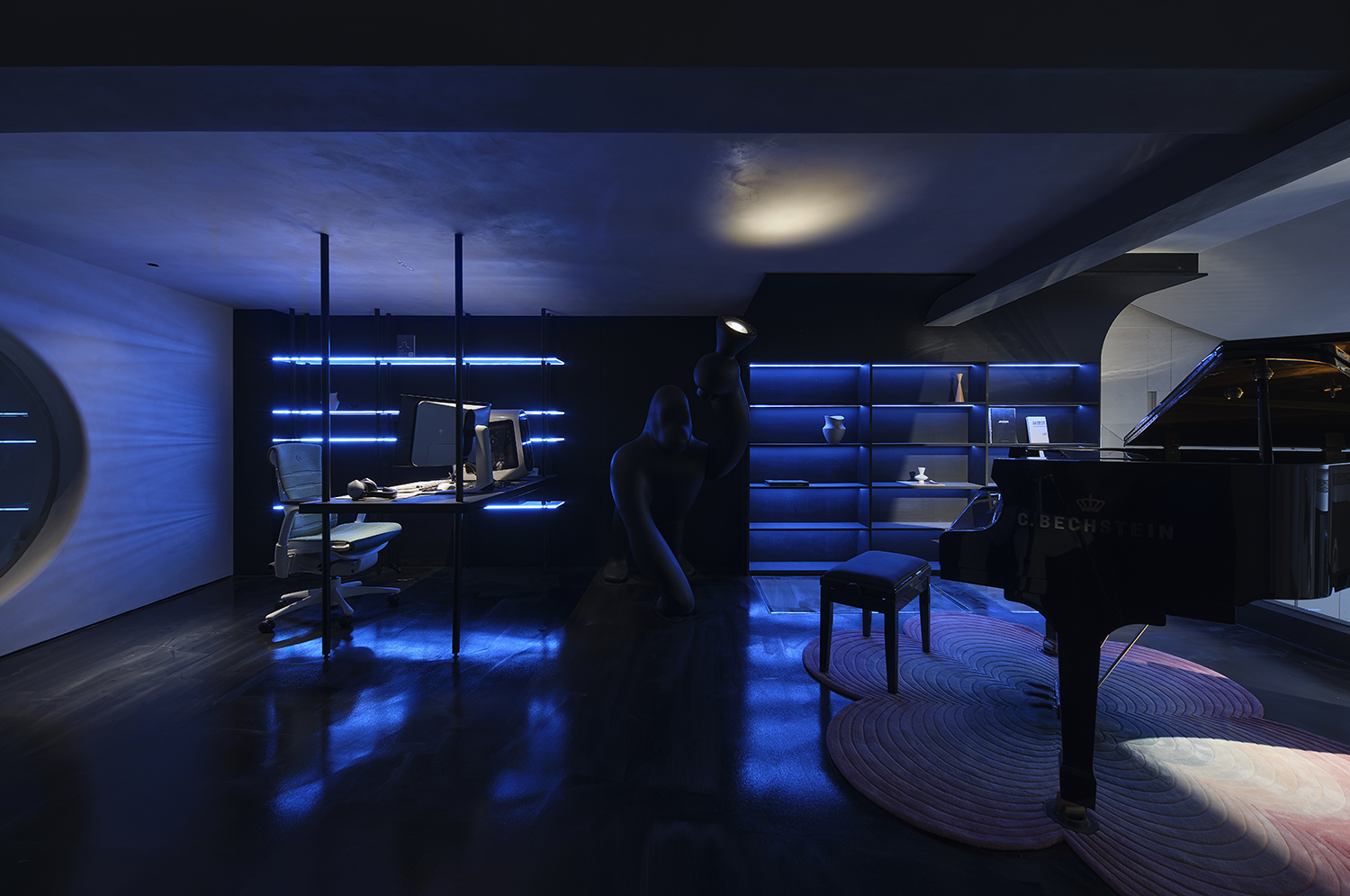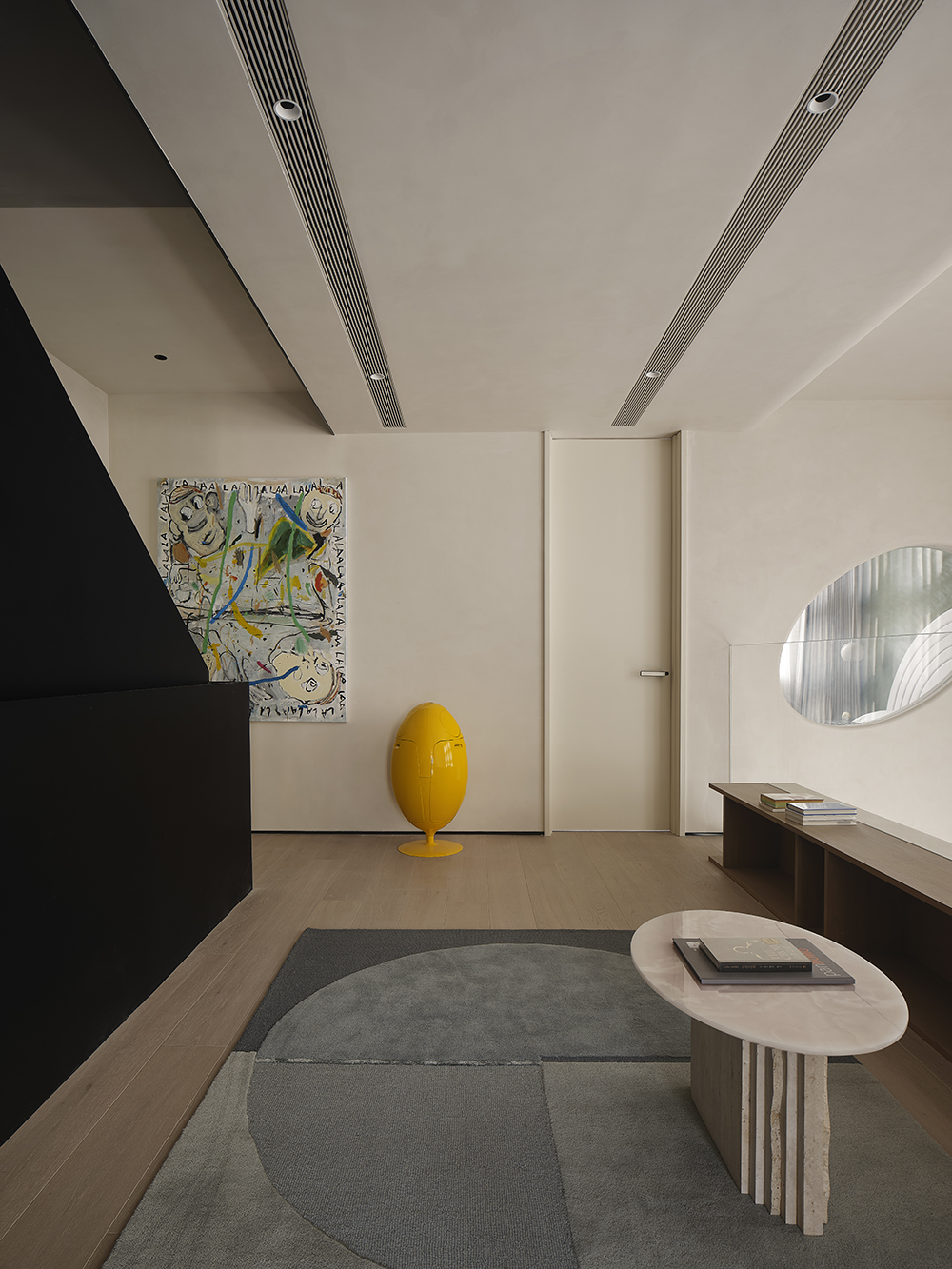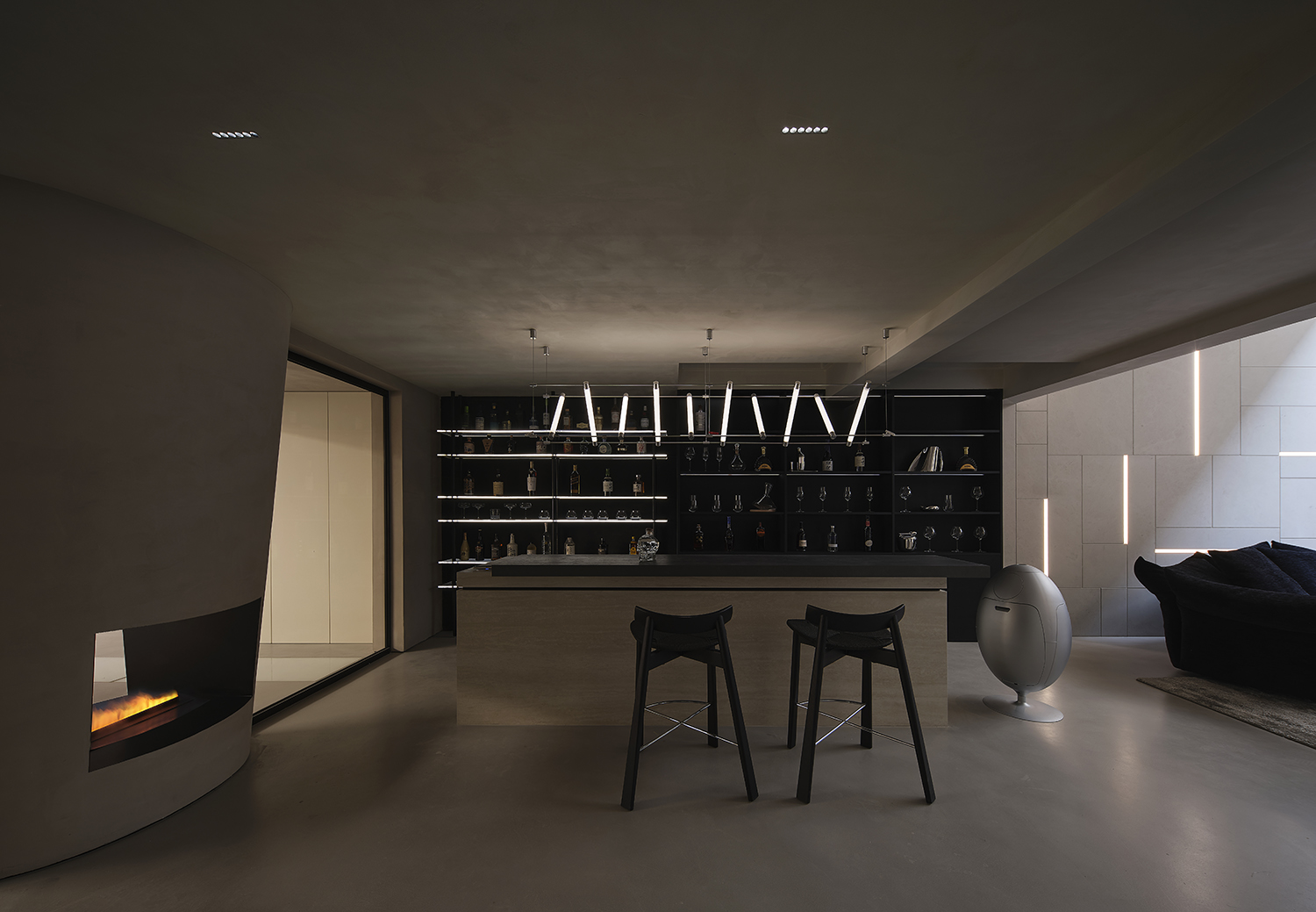 地下室不仅是一场视觉盛宴,还充分调动了人的听觉、嗅觉、触觉,感知无处不在。车库与会客区两侧都有天窗,进门处以玻璃隔断引光互通,雾化壁炉的律动升华了回家的仪式感。