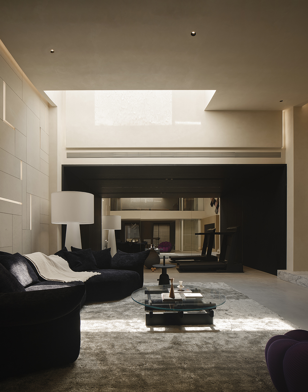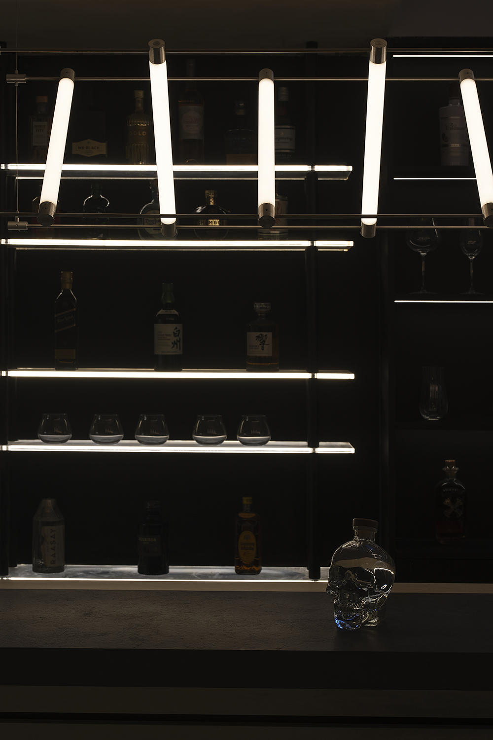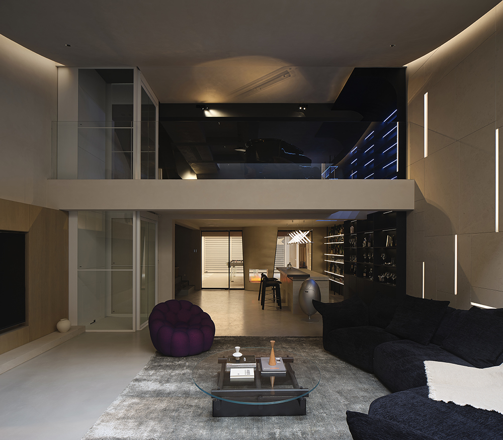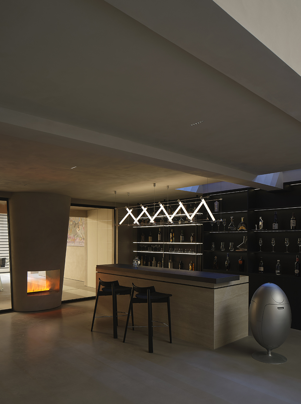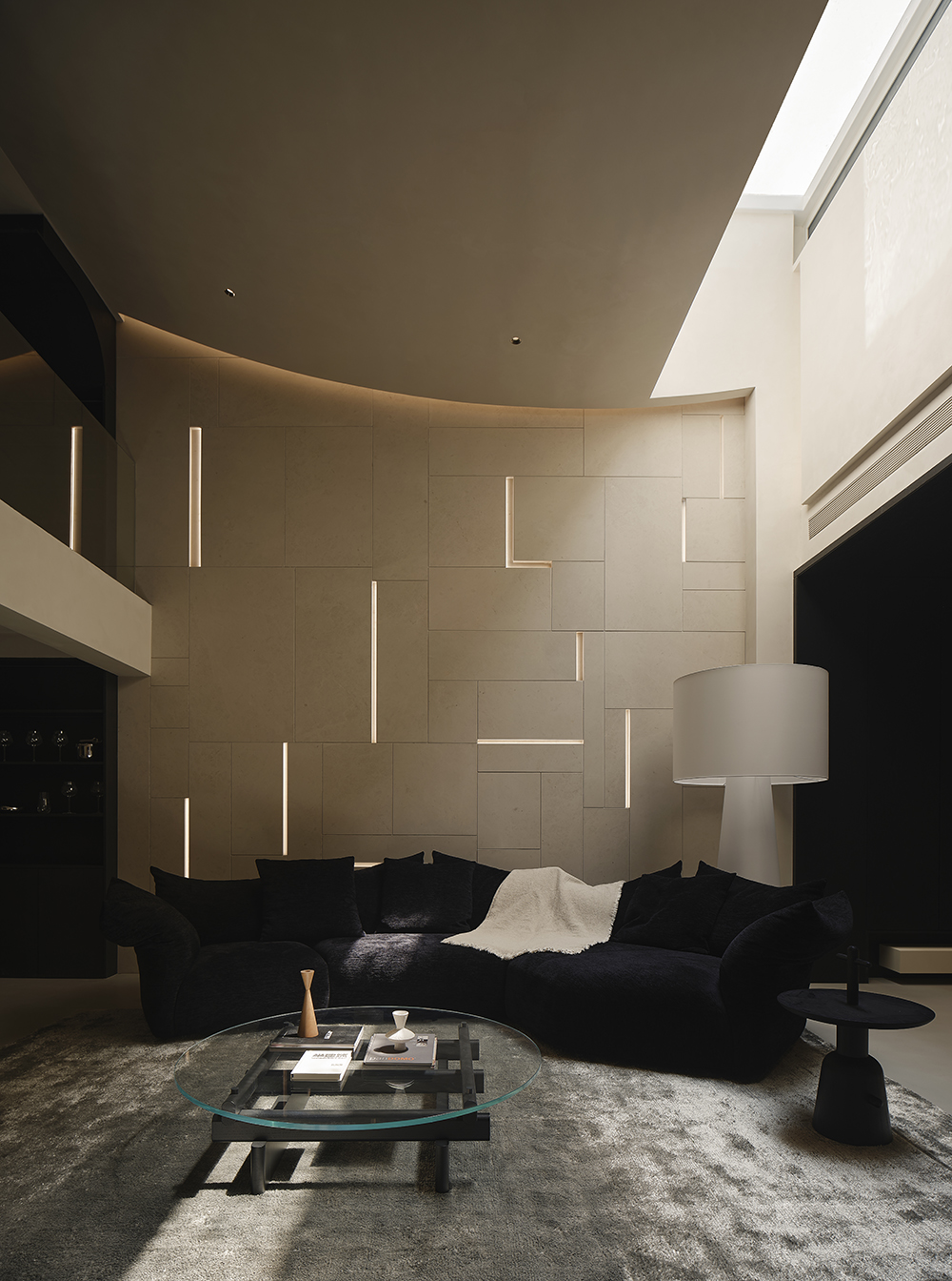 地下室不仅是一场视觉盛宴,还充分调动了人的听觉、嗅觉、触觉,感知无处不在。车库与会客区两侧都有天窗,进门处以玻璃隔断引光互通,雾化壁炉的律动升华了回家的仪式感。