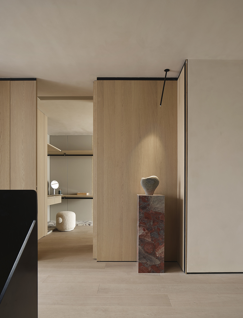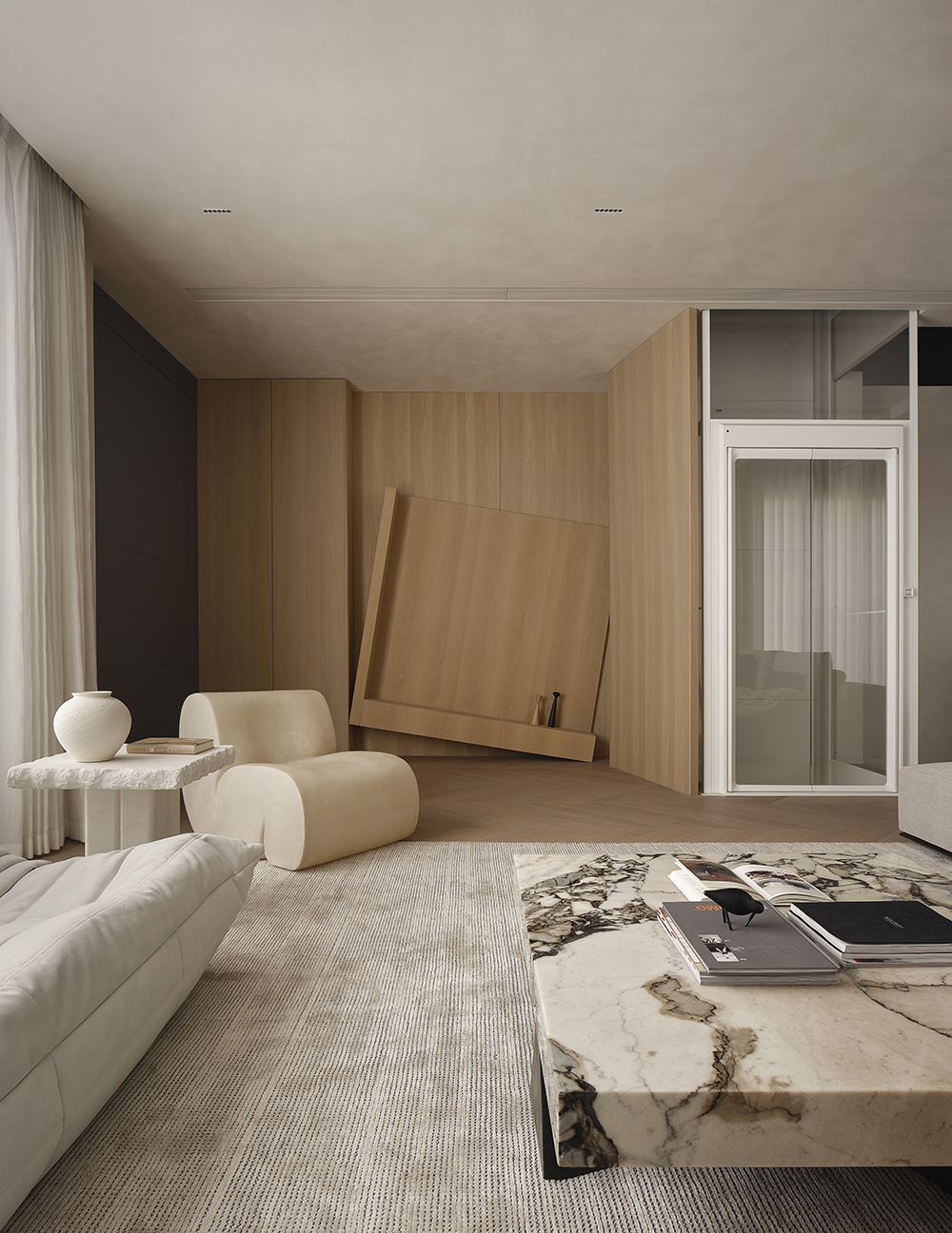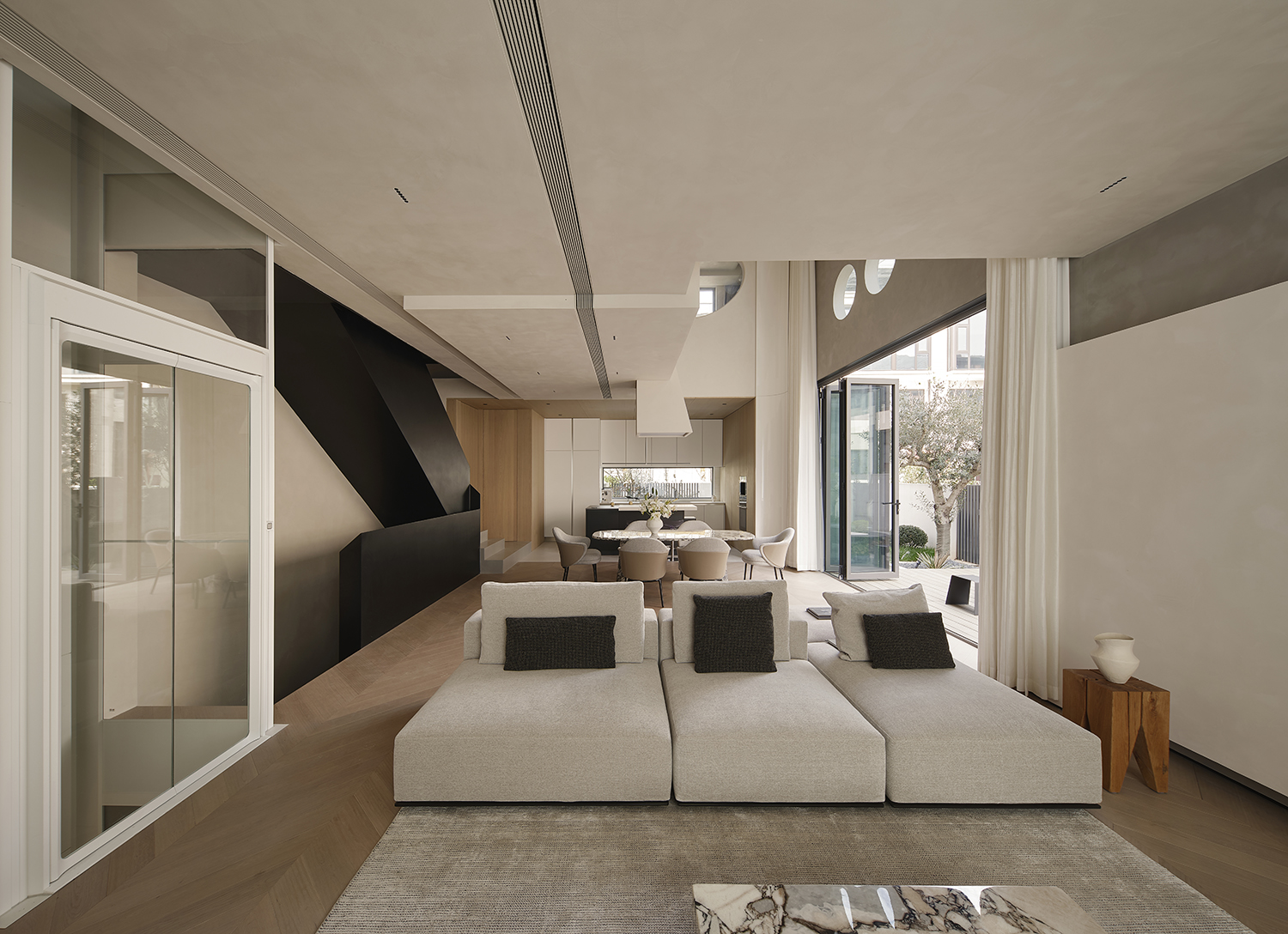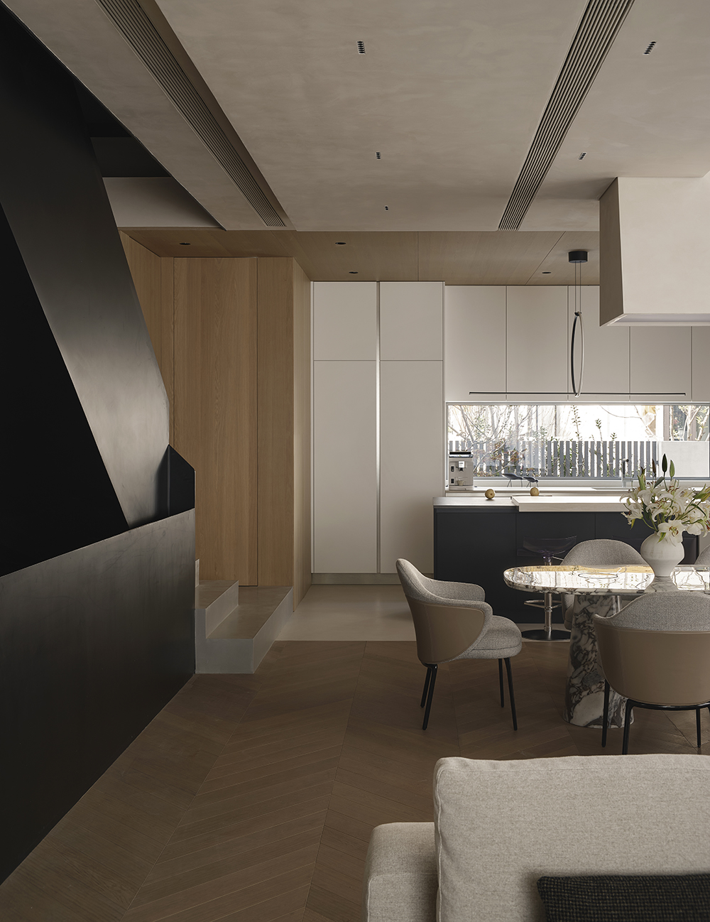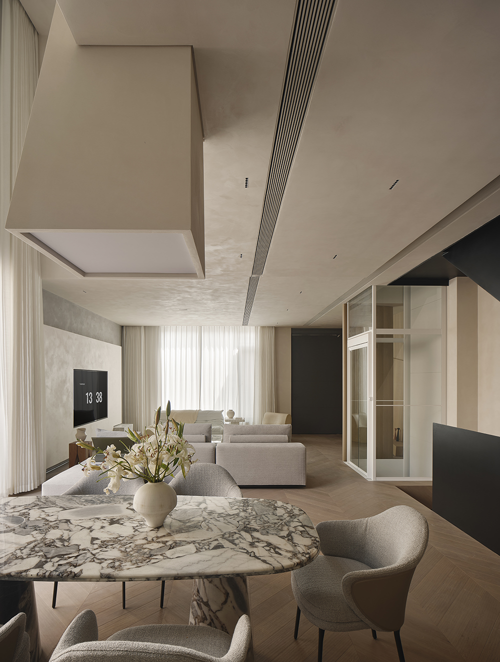 整个客厅,是一个通透的、放松的互动场域,模块化的沙发布局,最大化地实现空间的灵活性。宽幅1.5米的偏轴门,也是一次全新的尝试,将简约的视觉落实到极致。