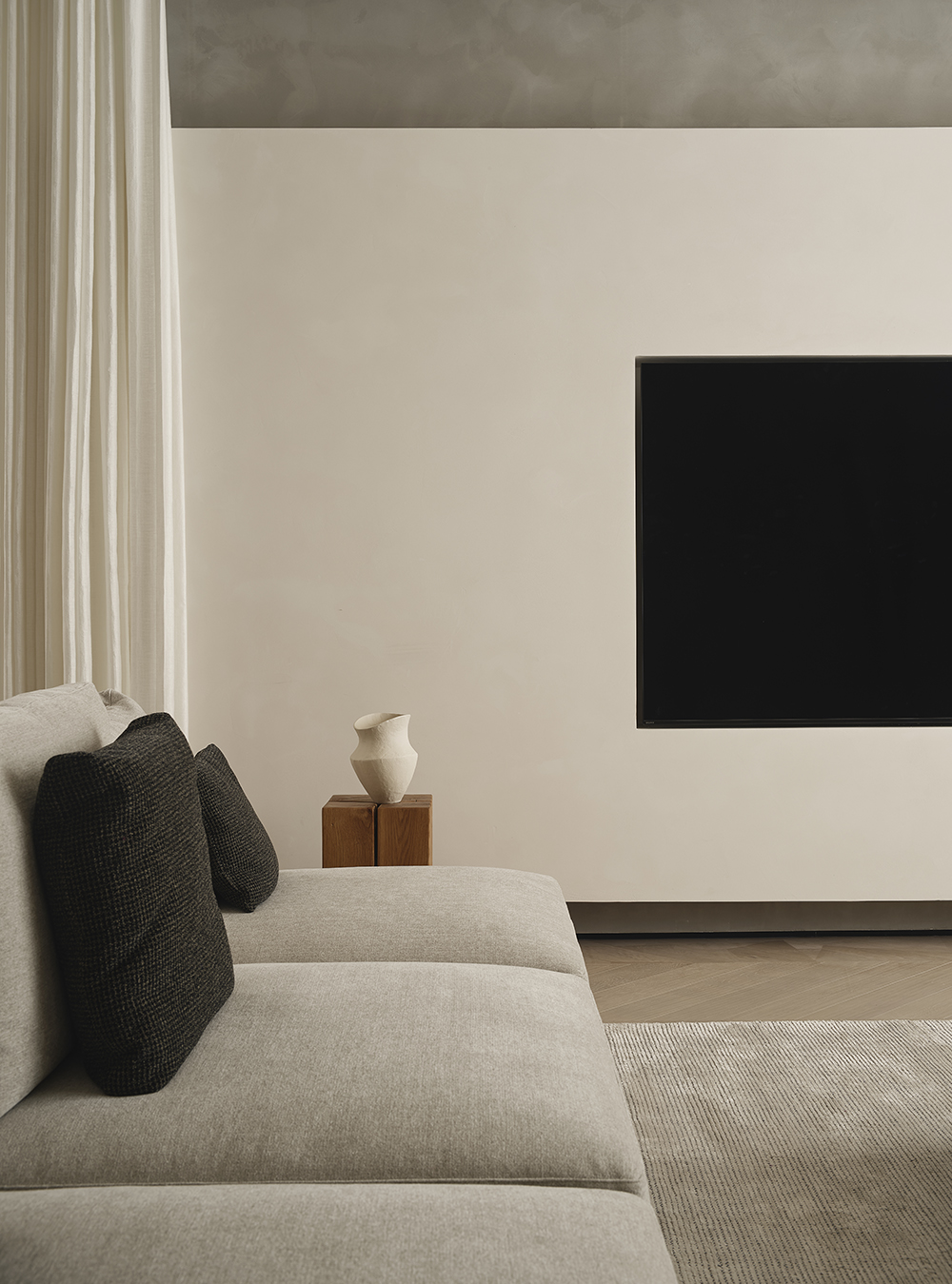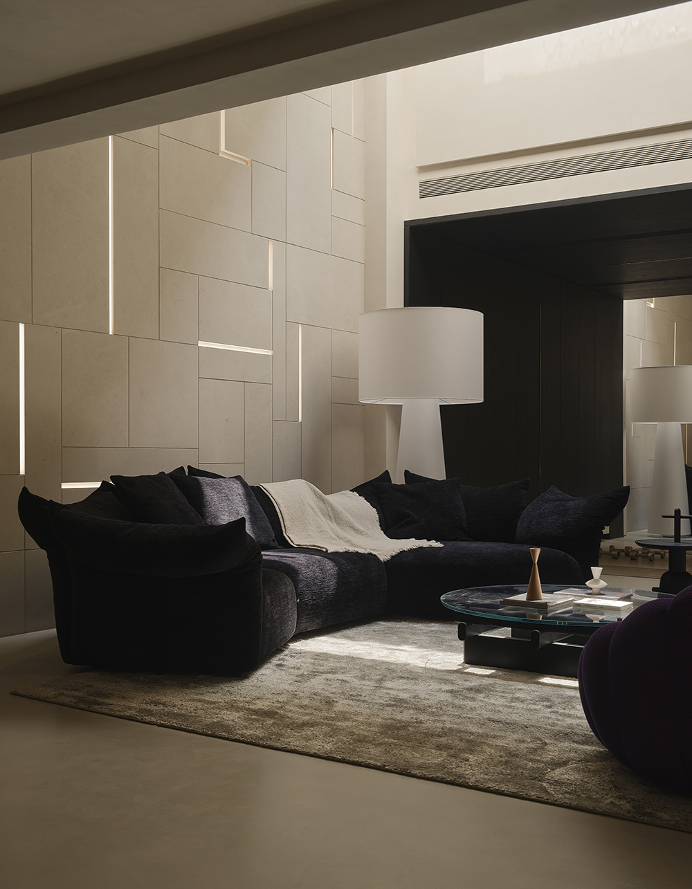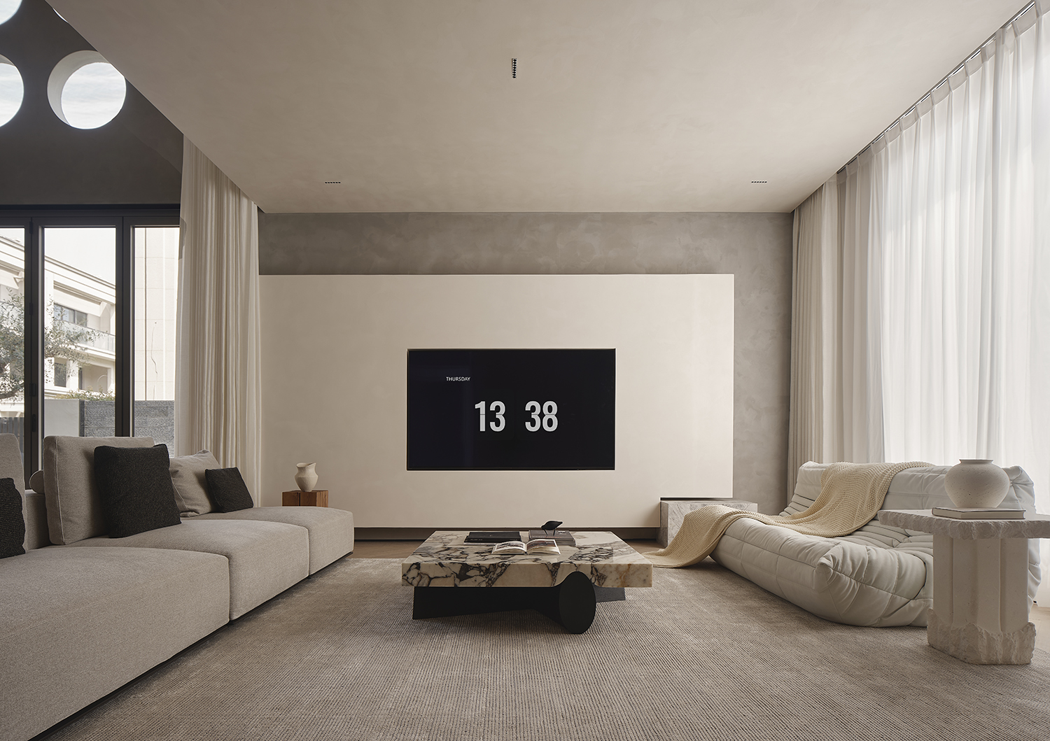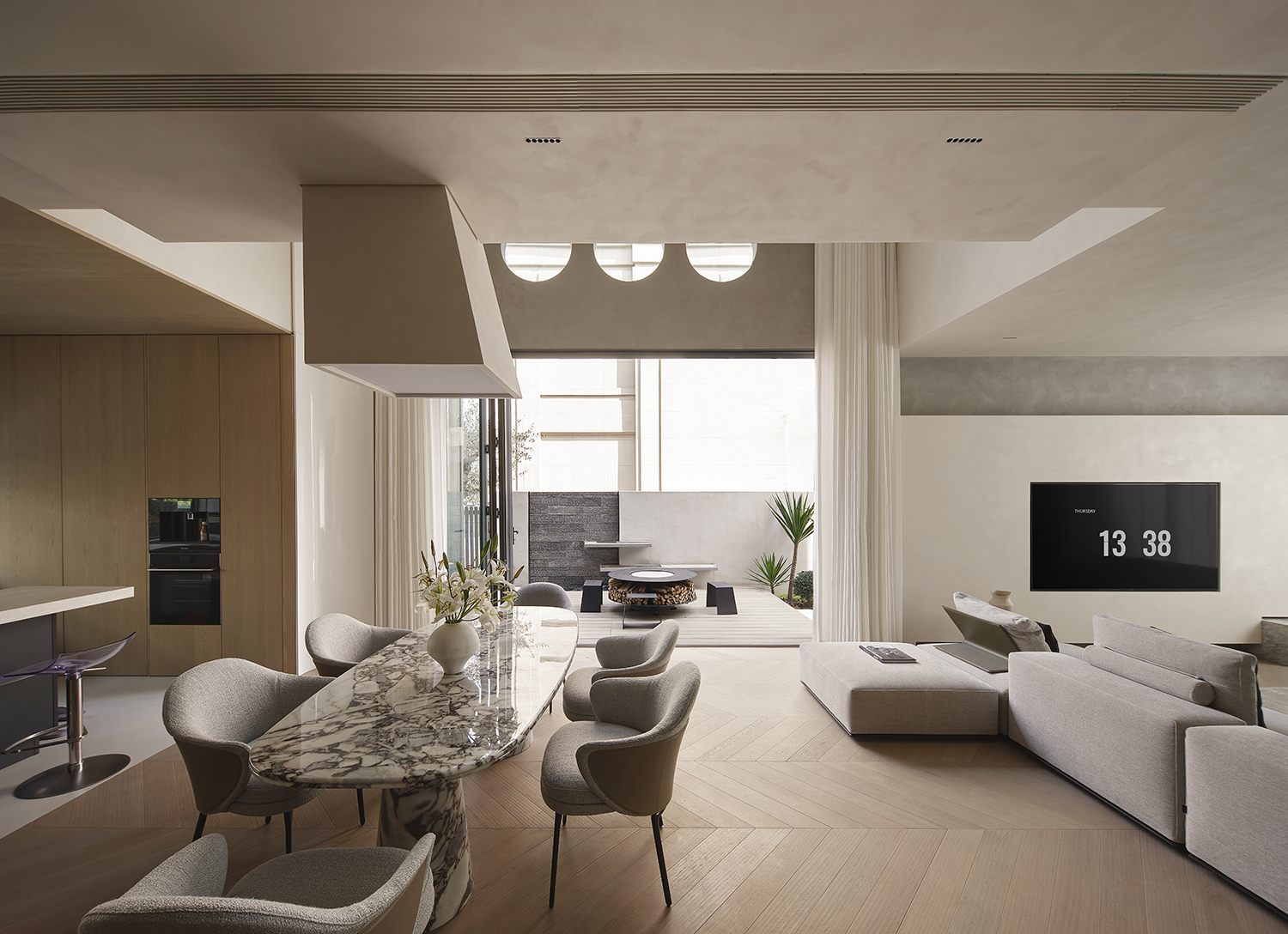 整个客厅,是一个通透的、放松的互动场域,模块化的沙发布局,最大化地实现空间的灵活性。宽幅1.5米的偏轴门,也是一次全新的尝试,将简约的视觉落实到极致。