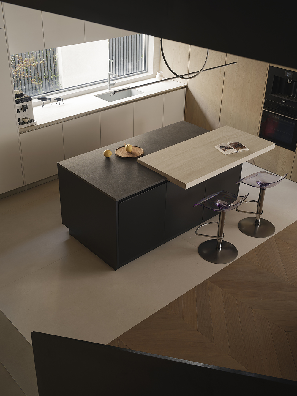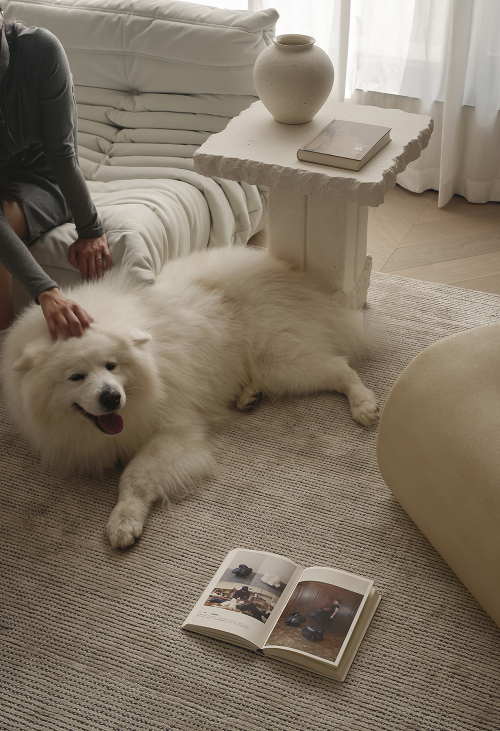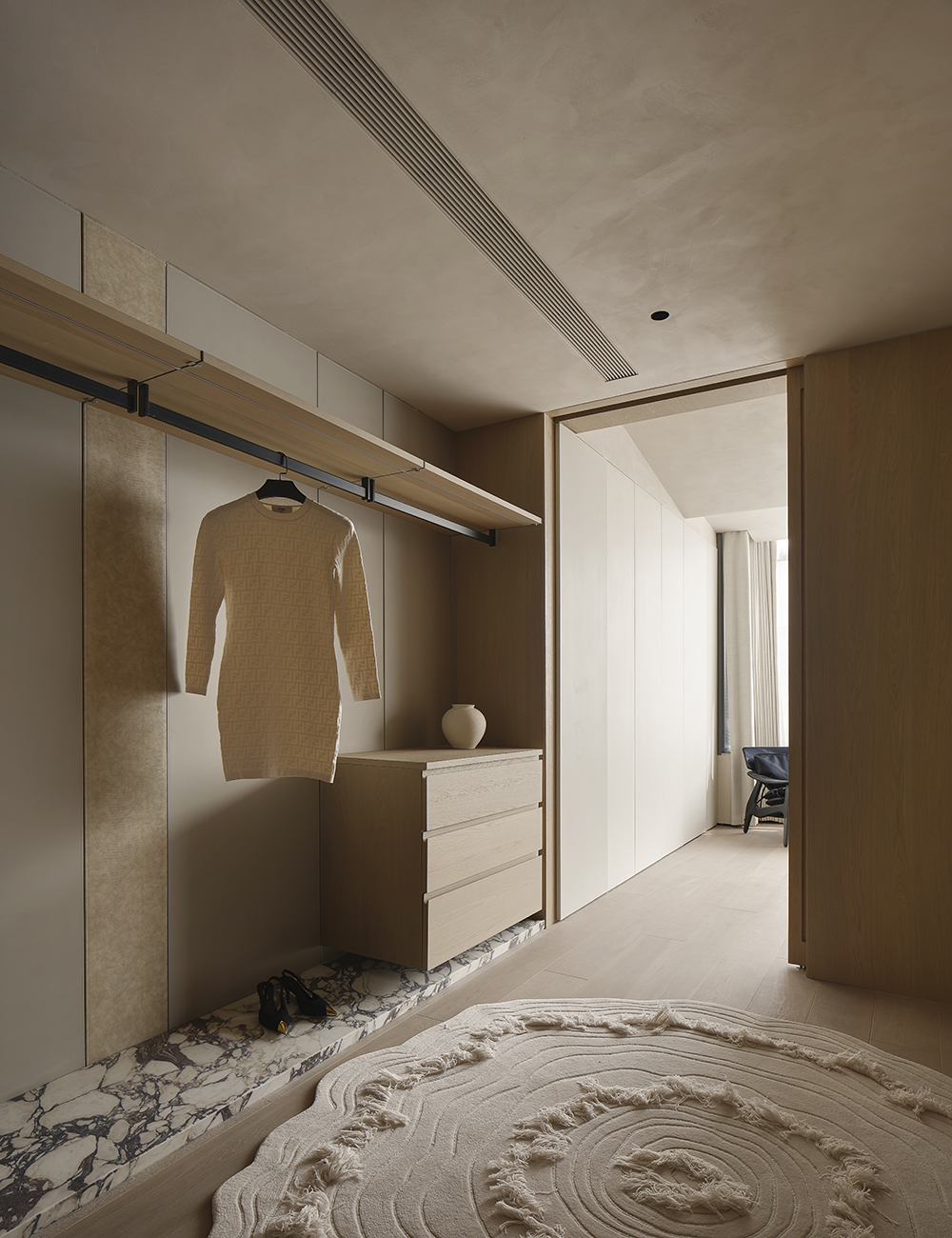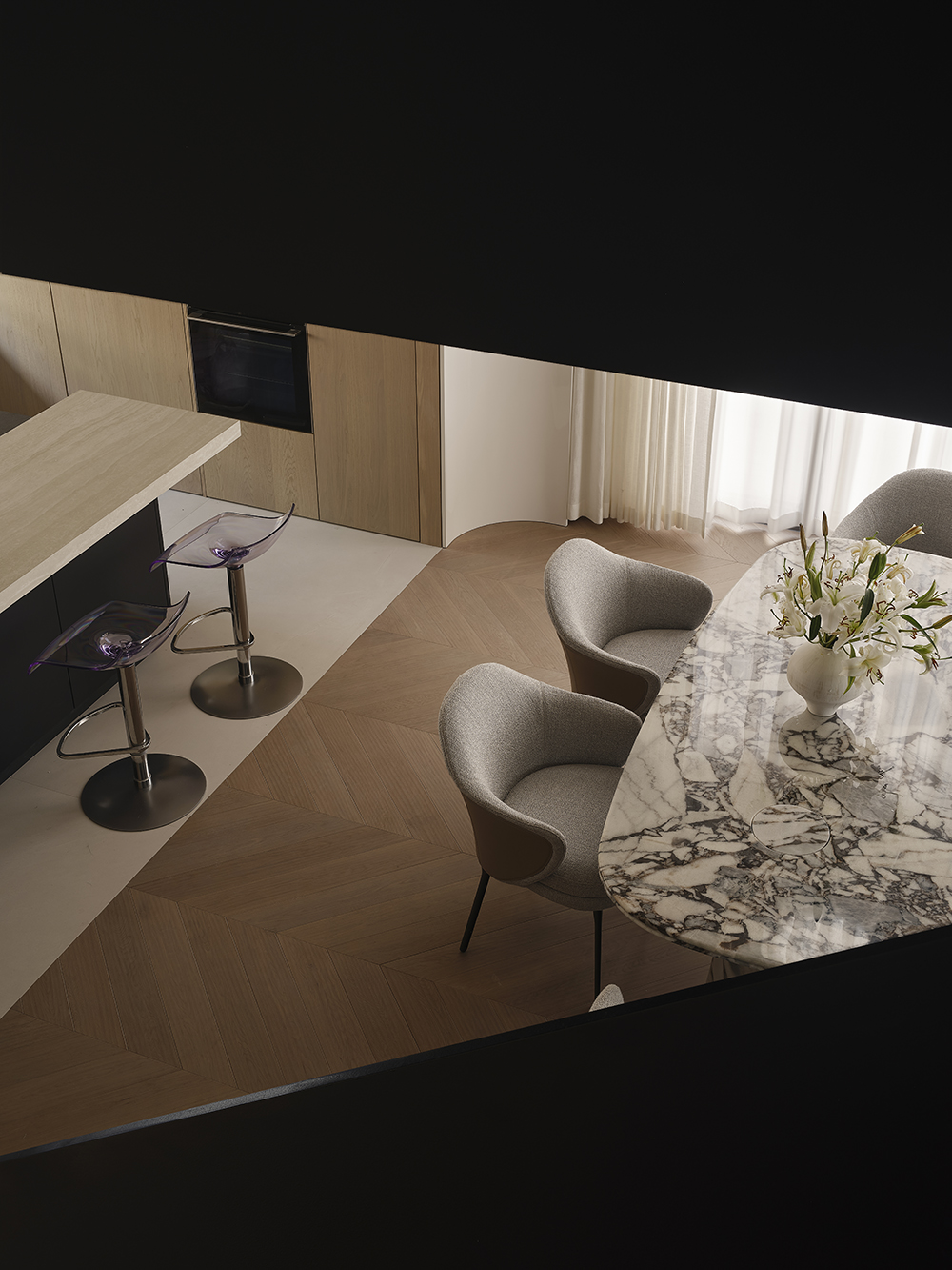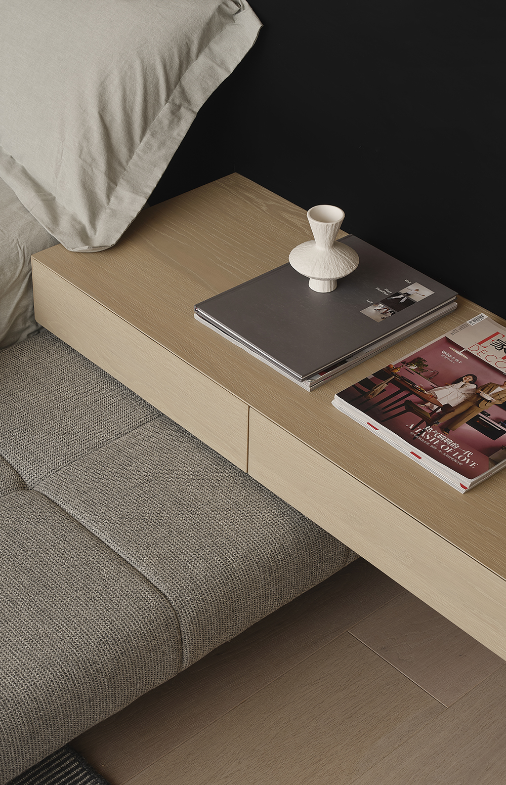 整个客厅,是一个通透的、放松的互动场域,模块化的沙发布局,最大化地实现空间的灵活性。宽幅1.5米的偏轴门,也是一次全新的尝试,将简约的视觉落实到极致。