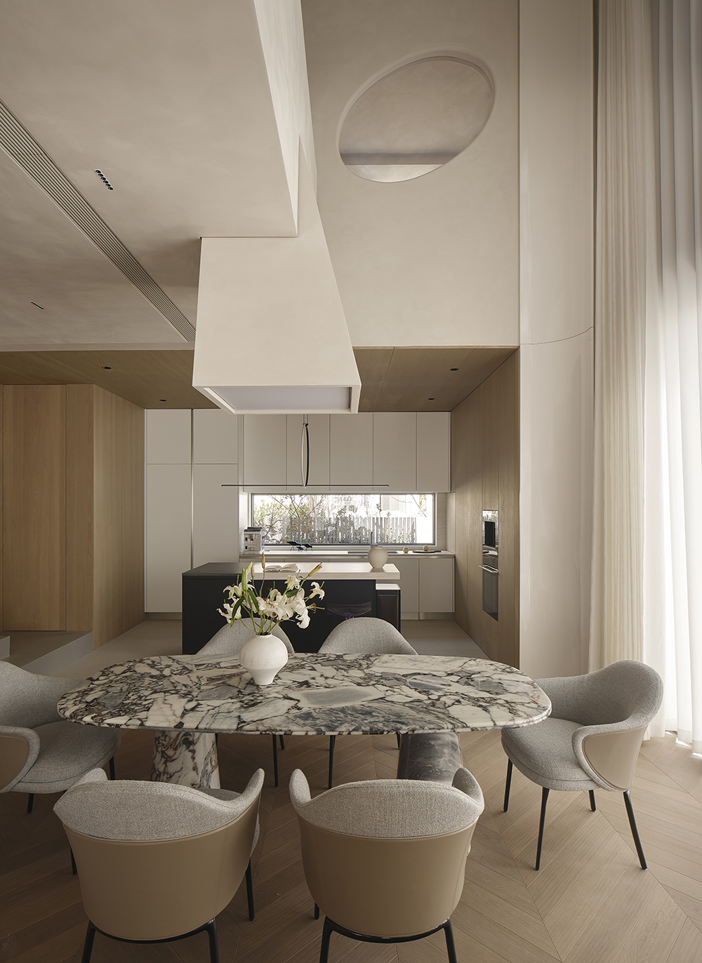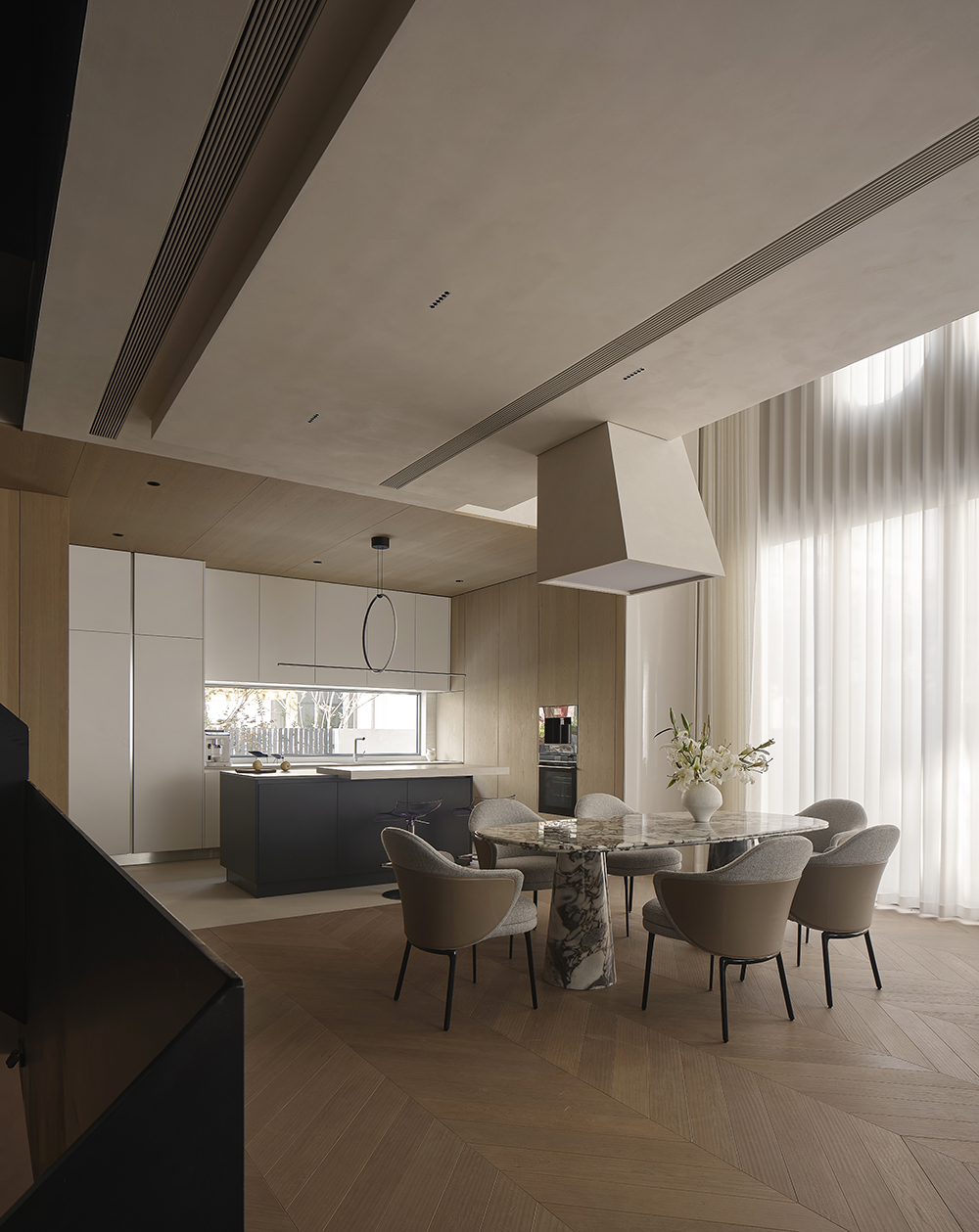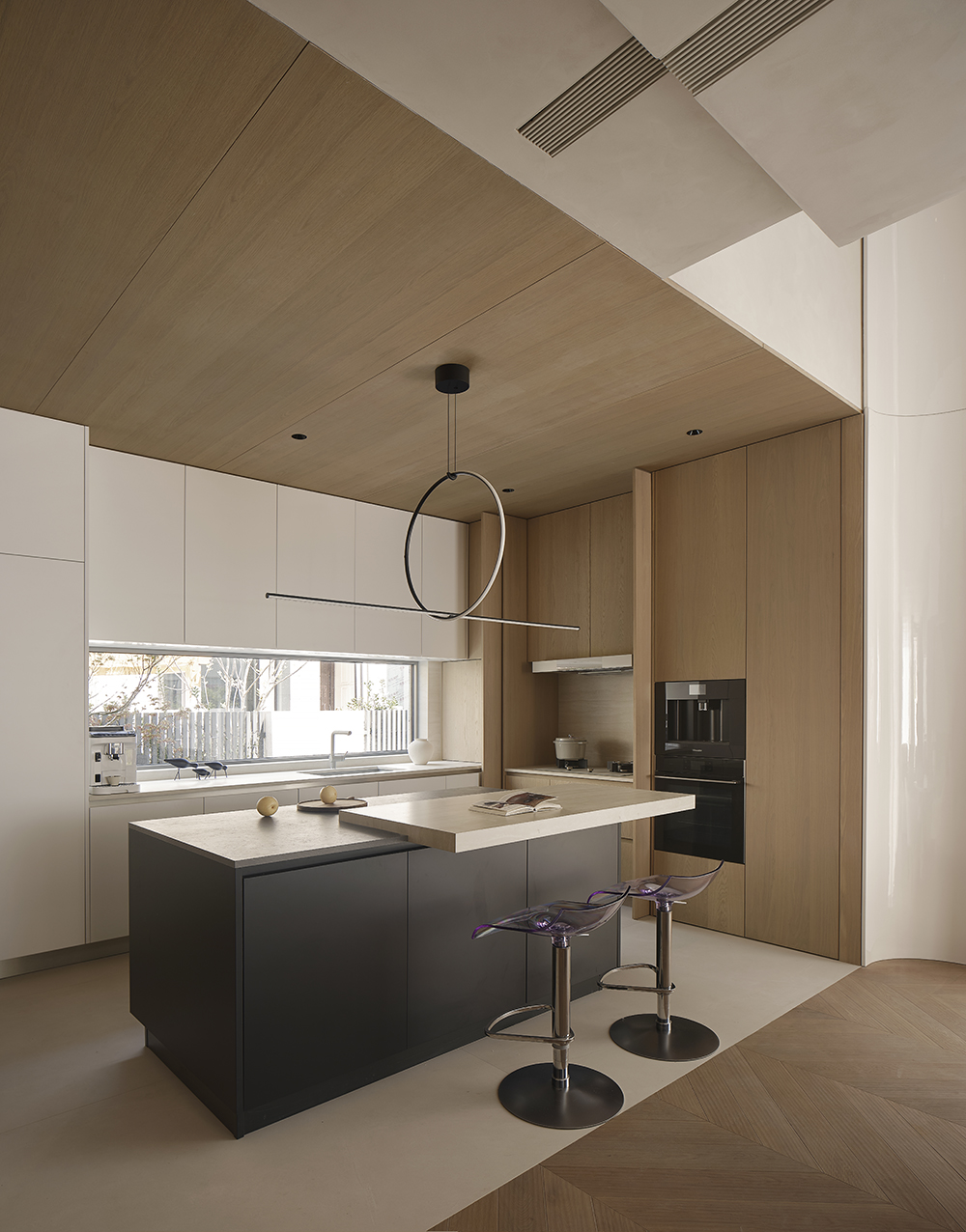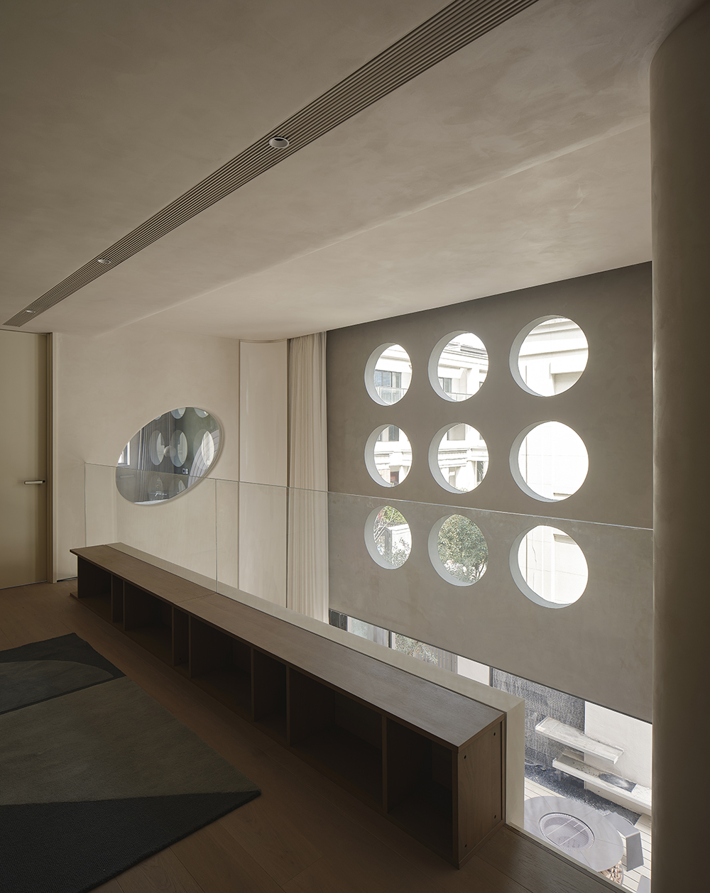 墙体采用几何形态,辅以相同材质的触感,与光、窗、院等不同的视觉来组合造景。围合式、洄游式的交流空间,通过创造与互动,成为凝聚家人情感的能量场。
