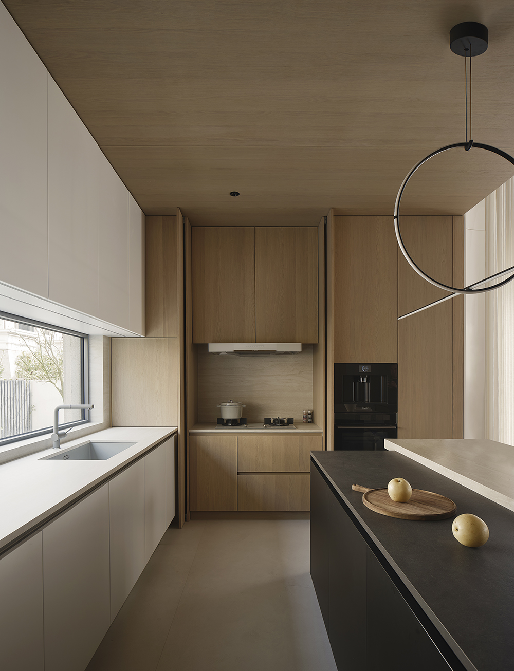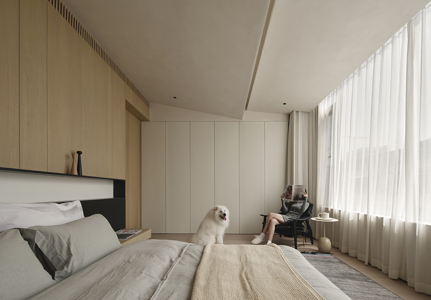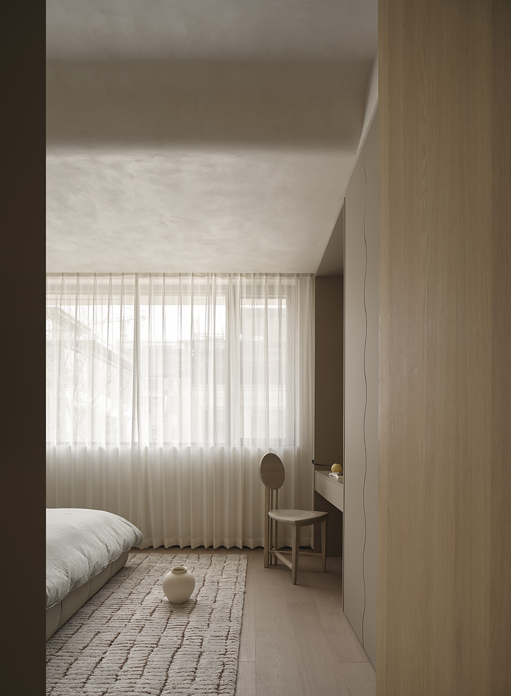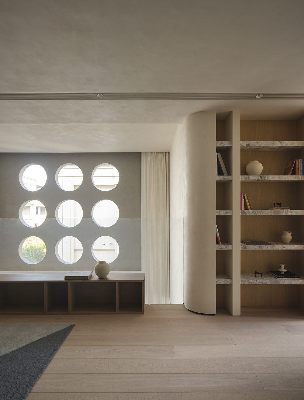 墙体采用几何形态,辅以相同材质的触感,与光、窗、院等不同的视觉来组合造景。围合式、洄游式的交流空间,通过创造与互动,成为凝聚家人情感的能量场。