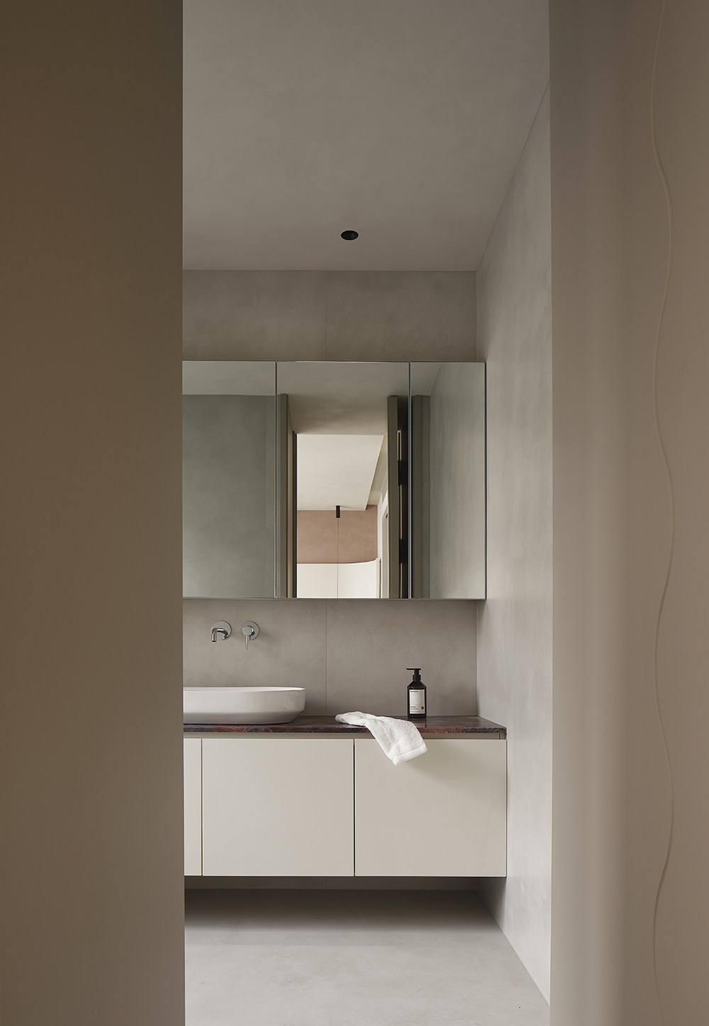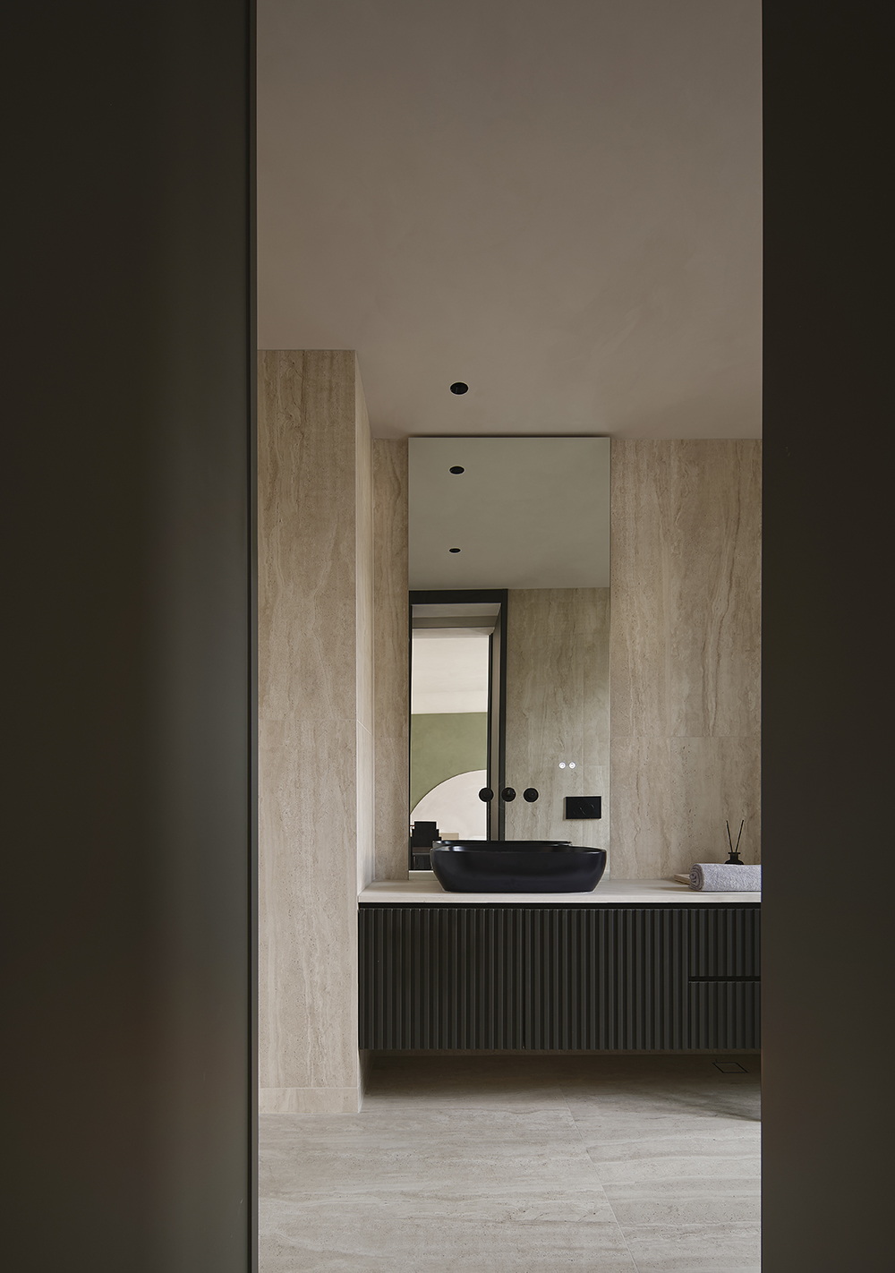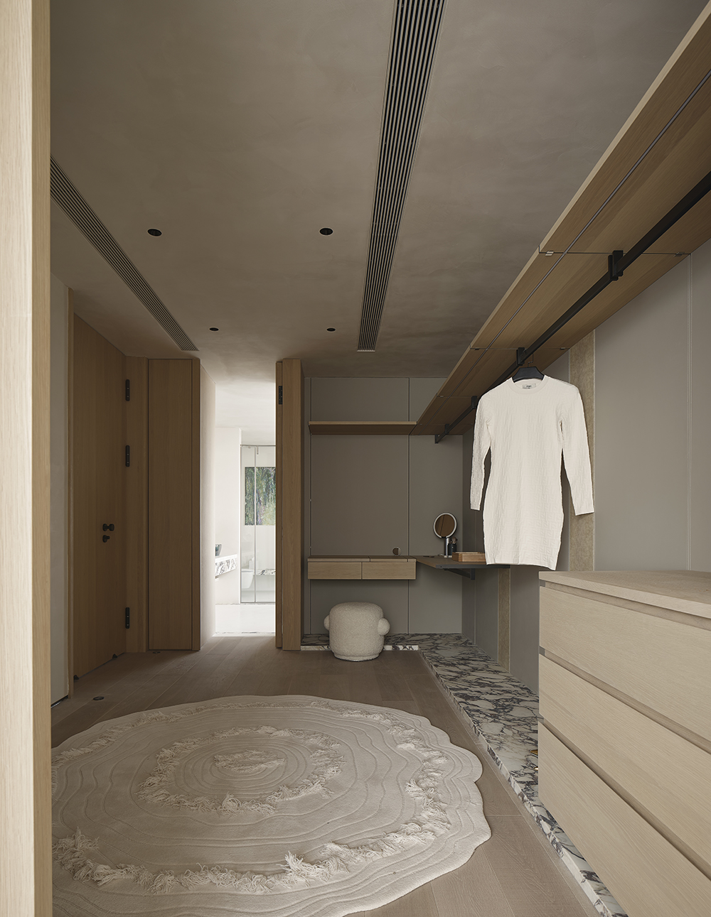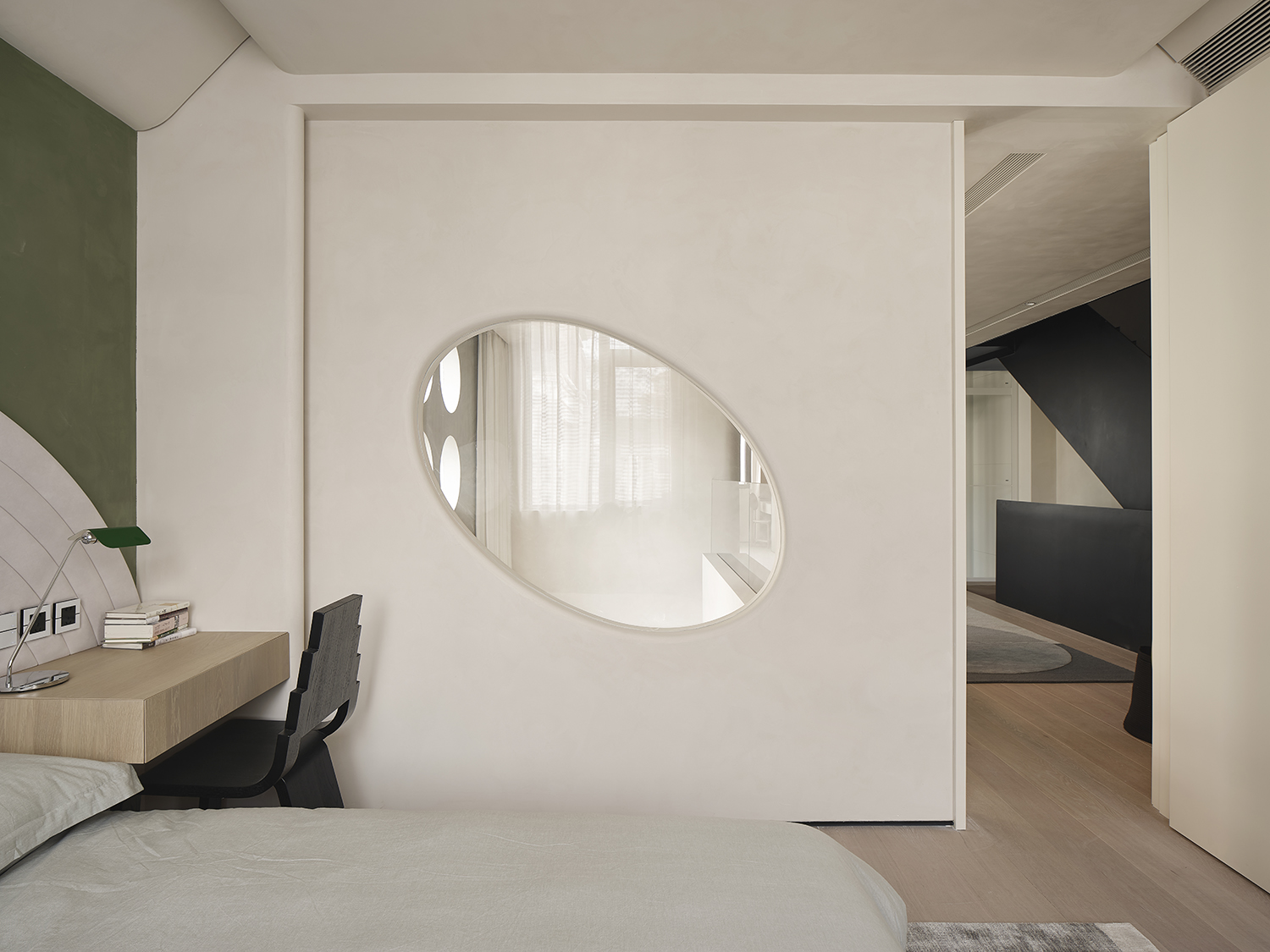墙体采用几何形态,辅以相同材质的触感,与光、窗、院等不同的视觉来组合造景。围合式、洄游式的交流空间,通过创造与互动,成为凝聚家人情感的能量场。