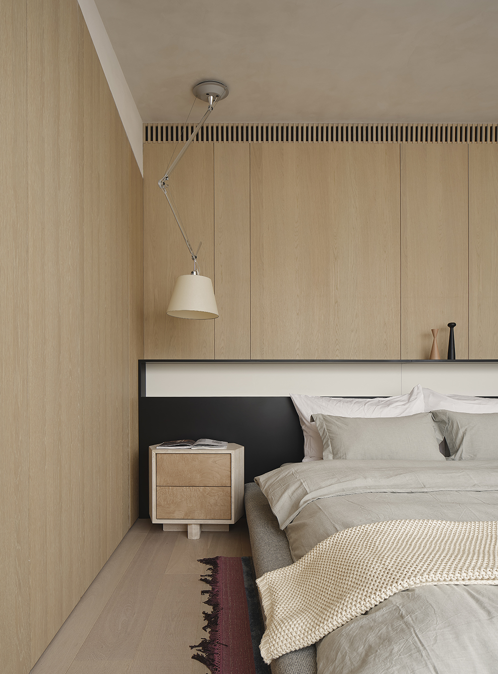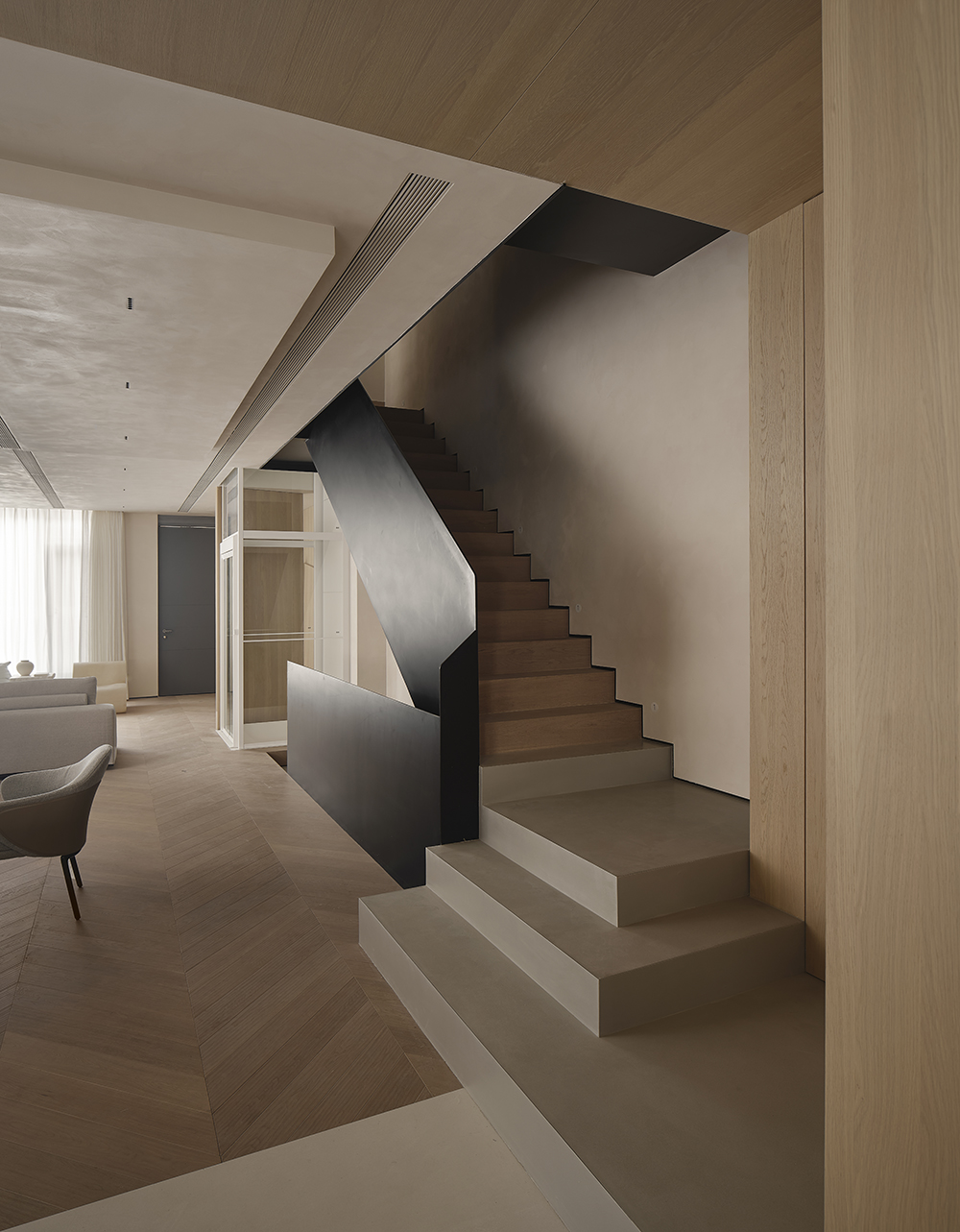 原始结构中,楼梯横占一半活动空间。改造后的一字型楼梯,最大化释放了空间,6mm极简钢板扶手,给予空间更极致的利落感。