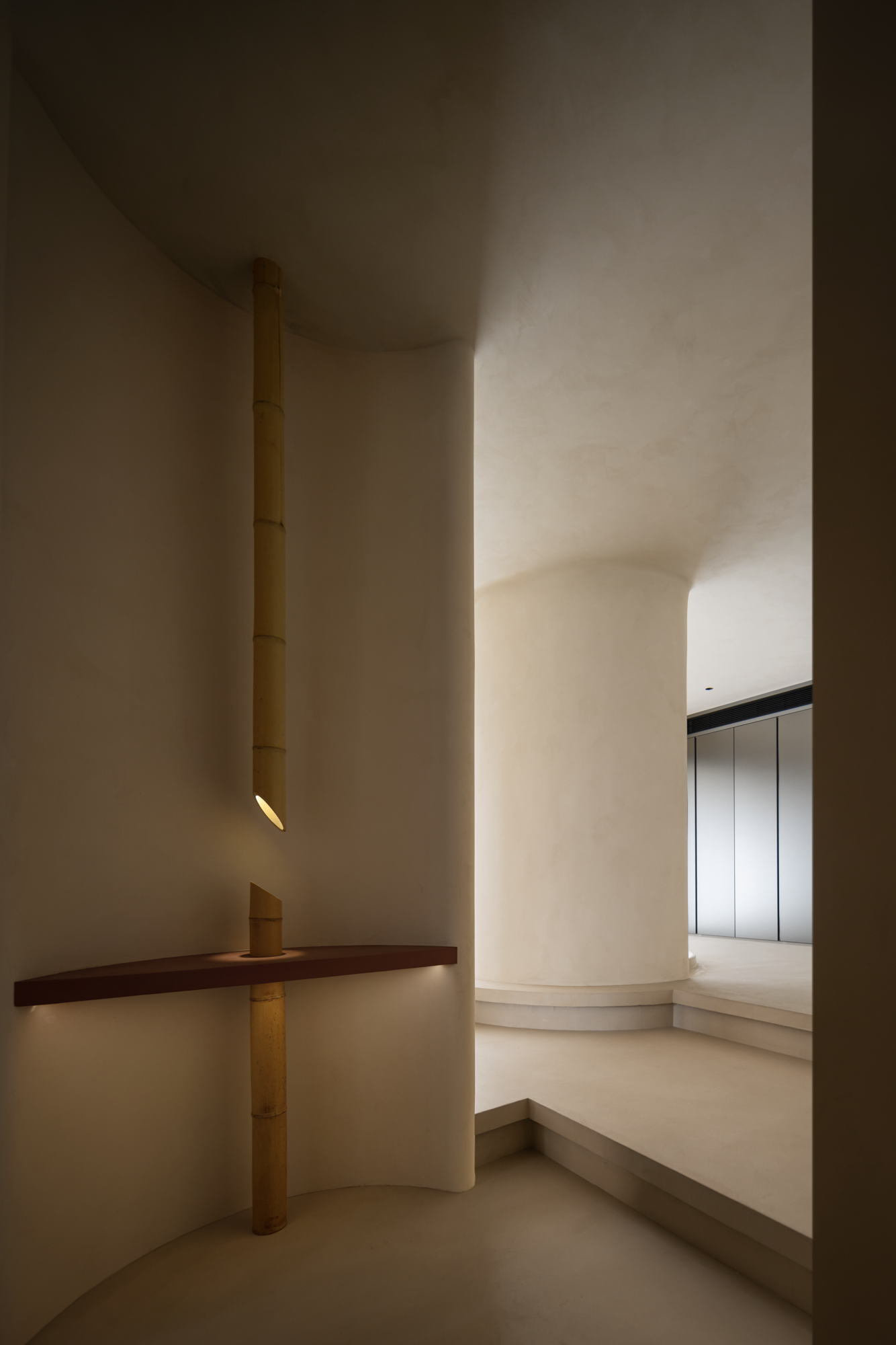 项目定位:以人文故事为主线,将《竹取物语》中的辉夜姬奔月的故事情节融入案例中,空间基底取自《沙丘》中的场景作为硬装背景,如山洞石,沙石,月球,砂岩等。灯光多以间接光照为主,灯光照度和色温及颜色选择智能可调,营造出不同心里需求的氛围感。