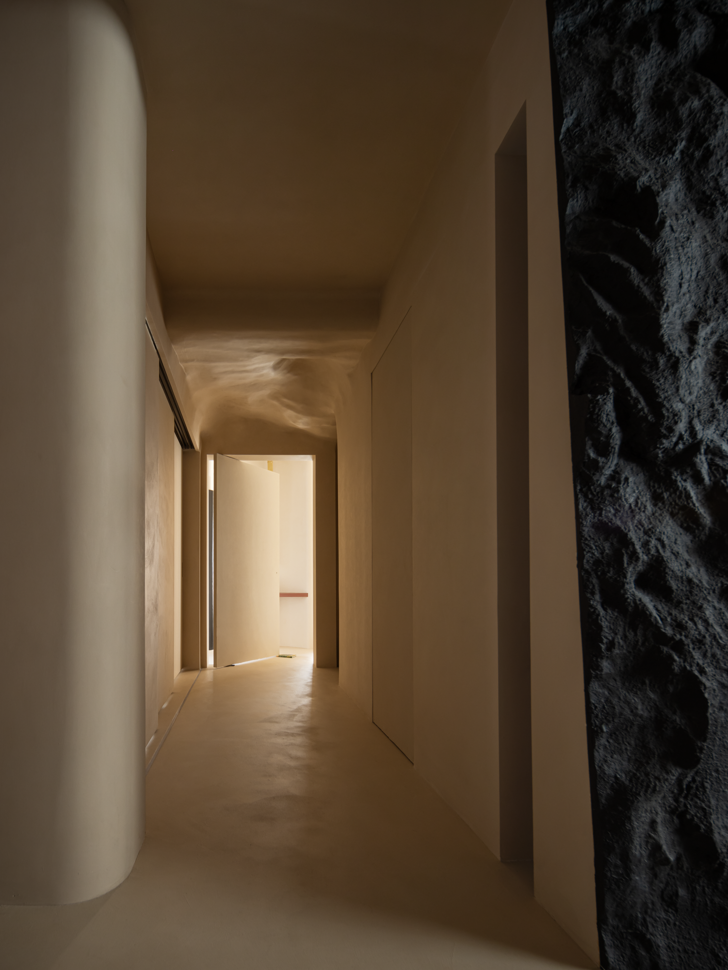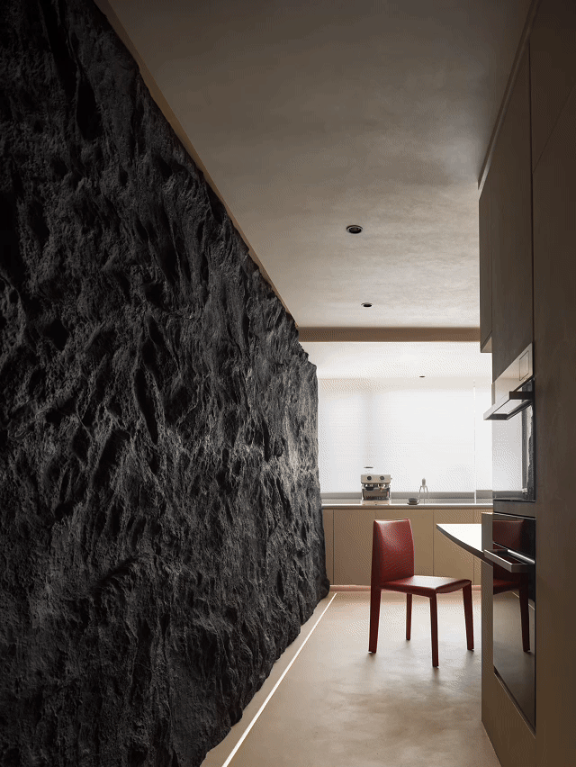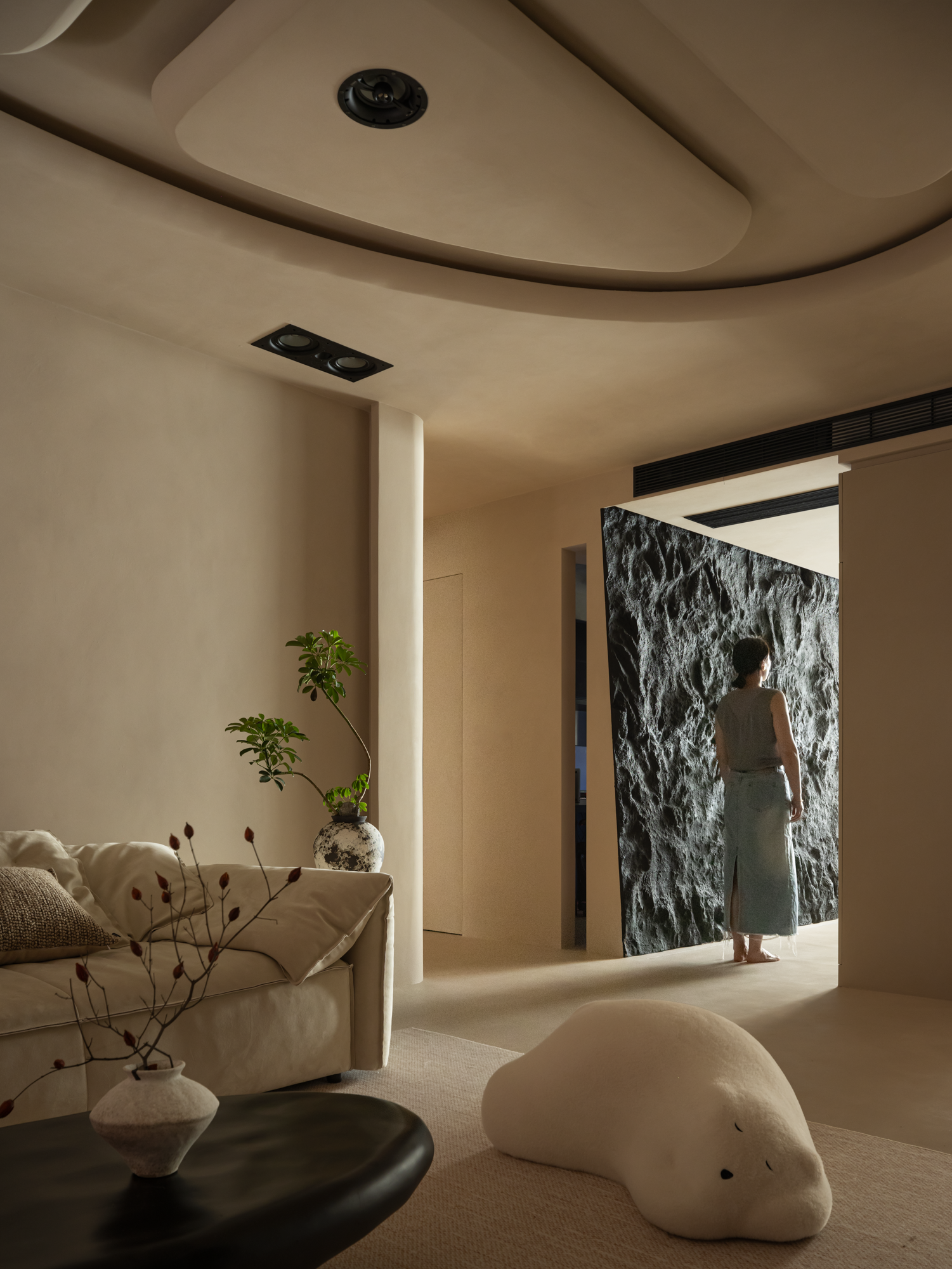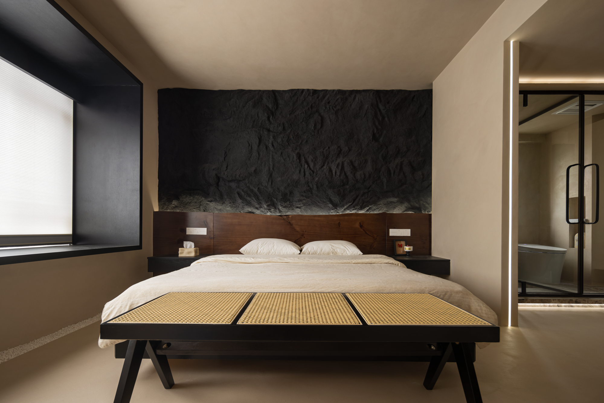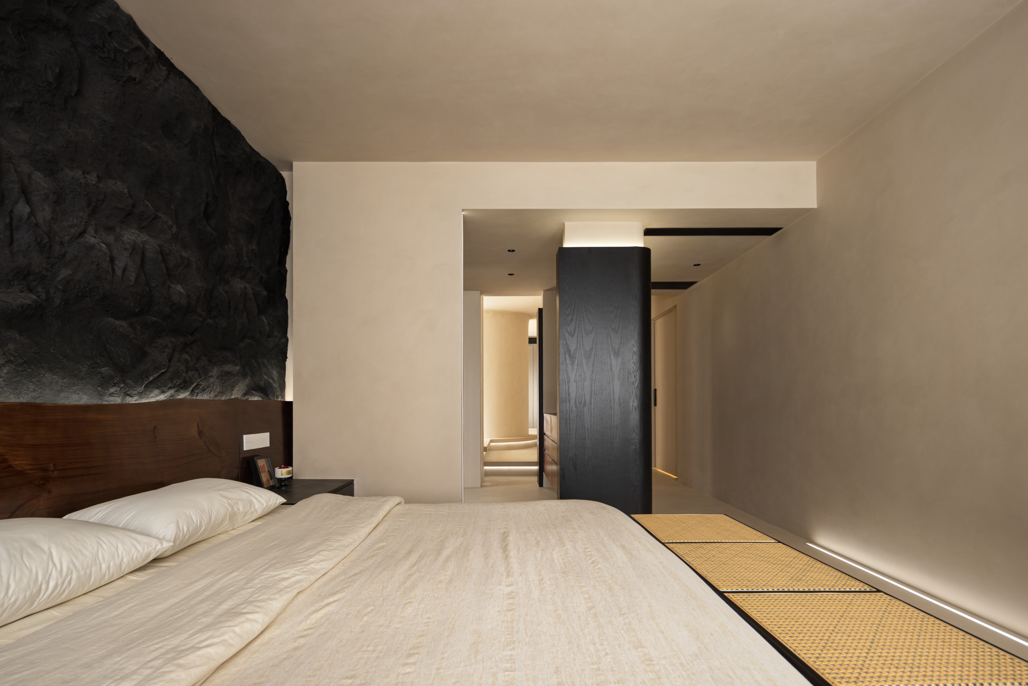 主卧采用偏轴门的形式,关上门时,整个区域天地墙完全一体,加上山洞一般的吊顶,让空间更有大自然的原始感