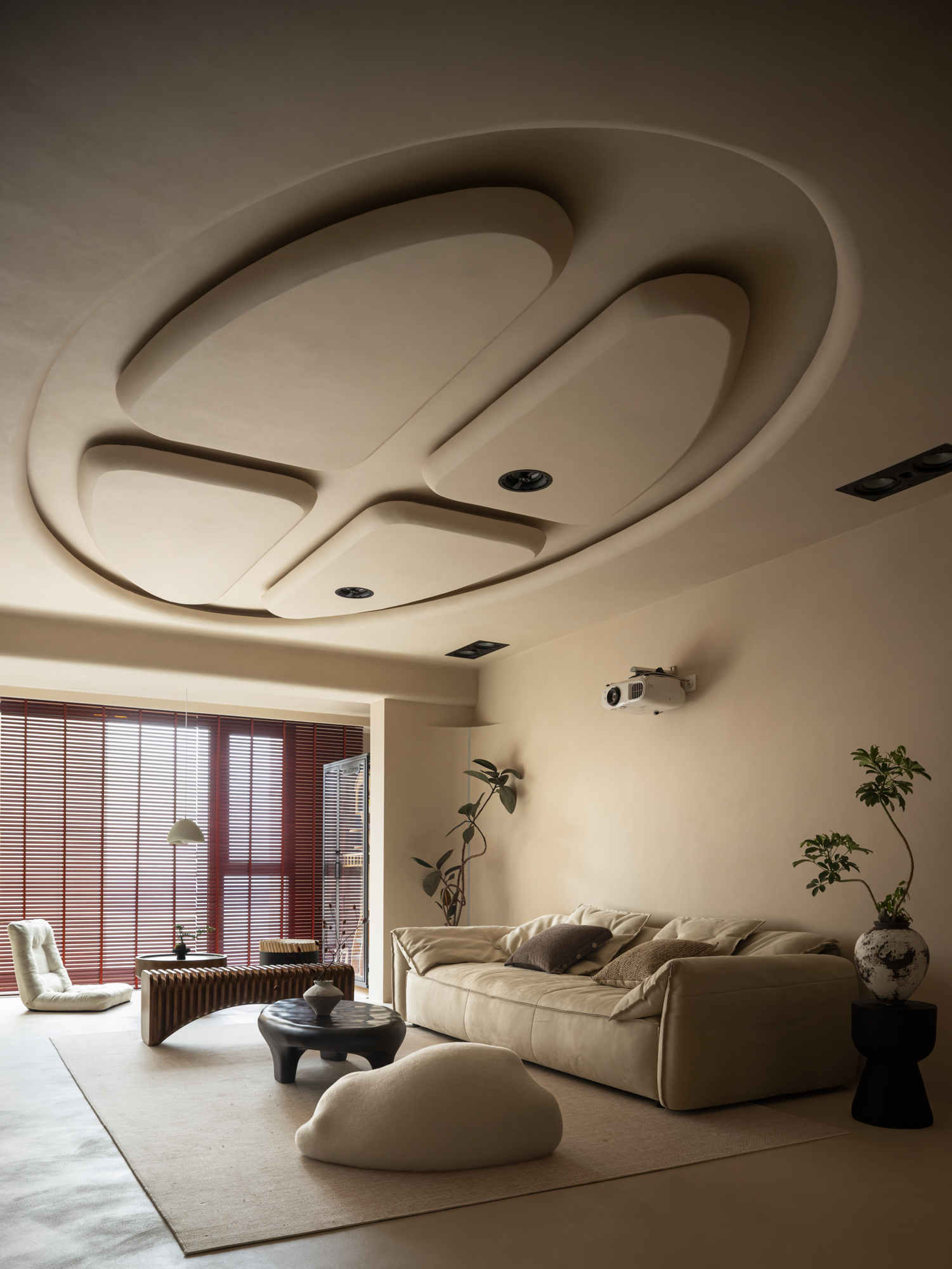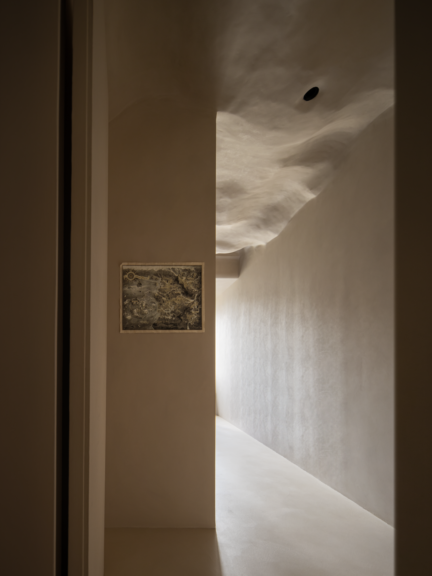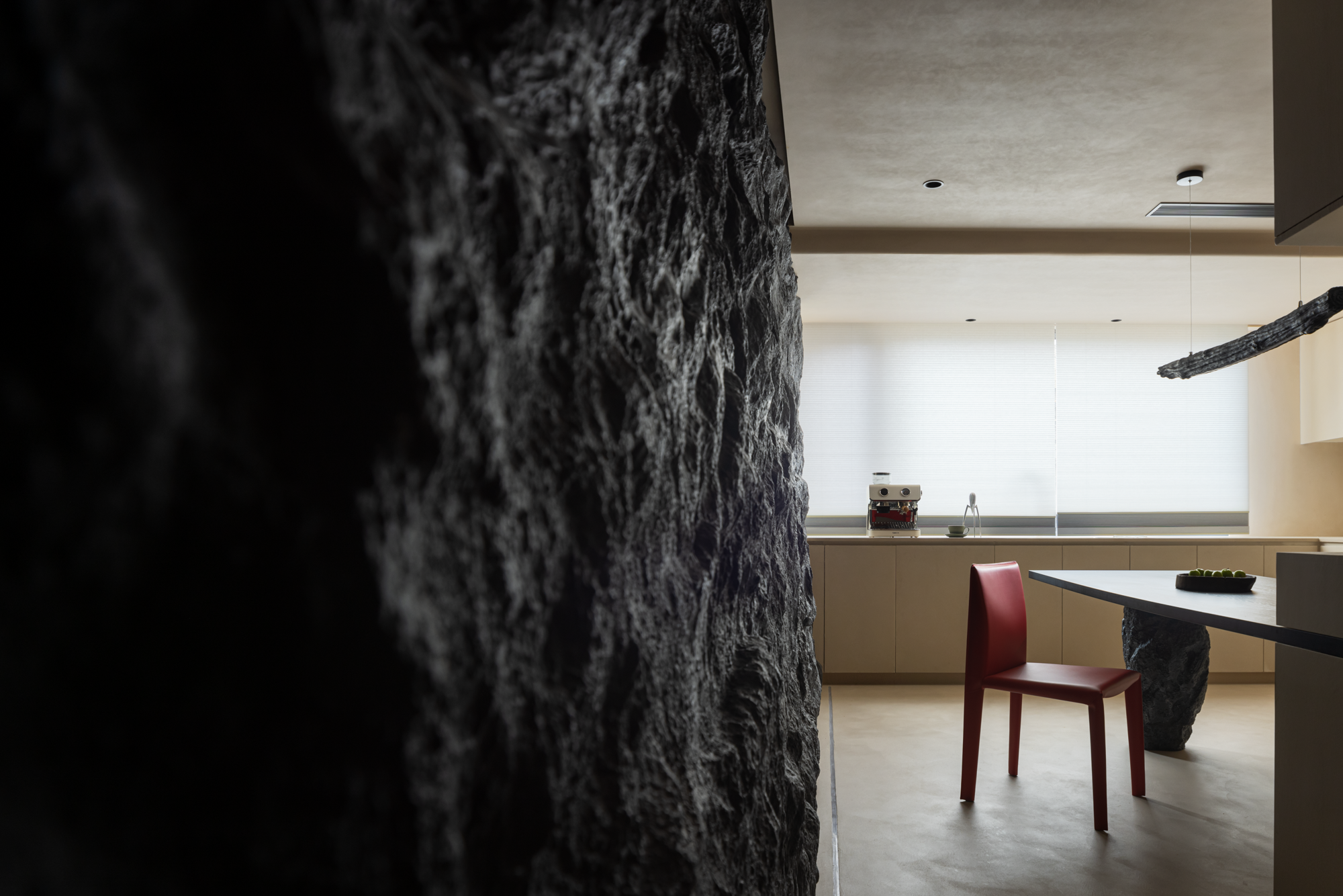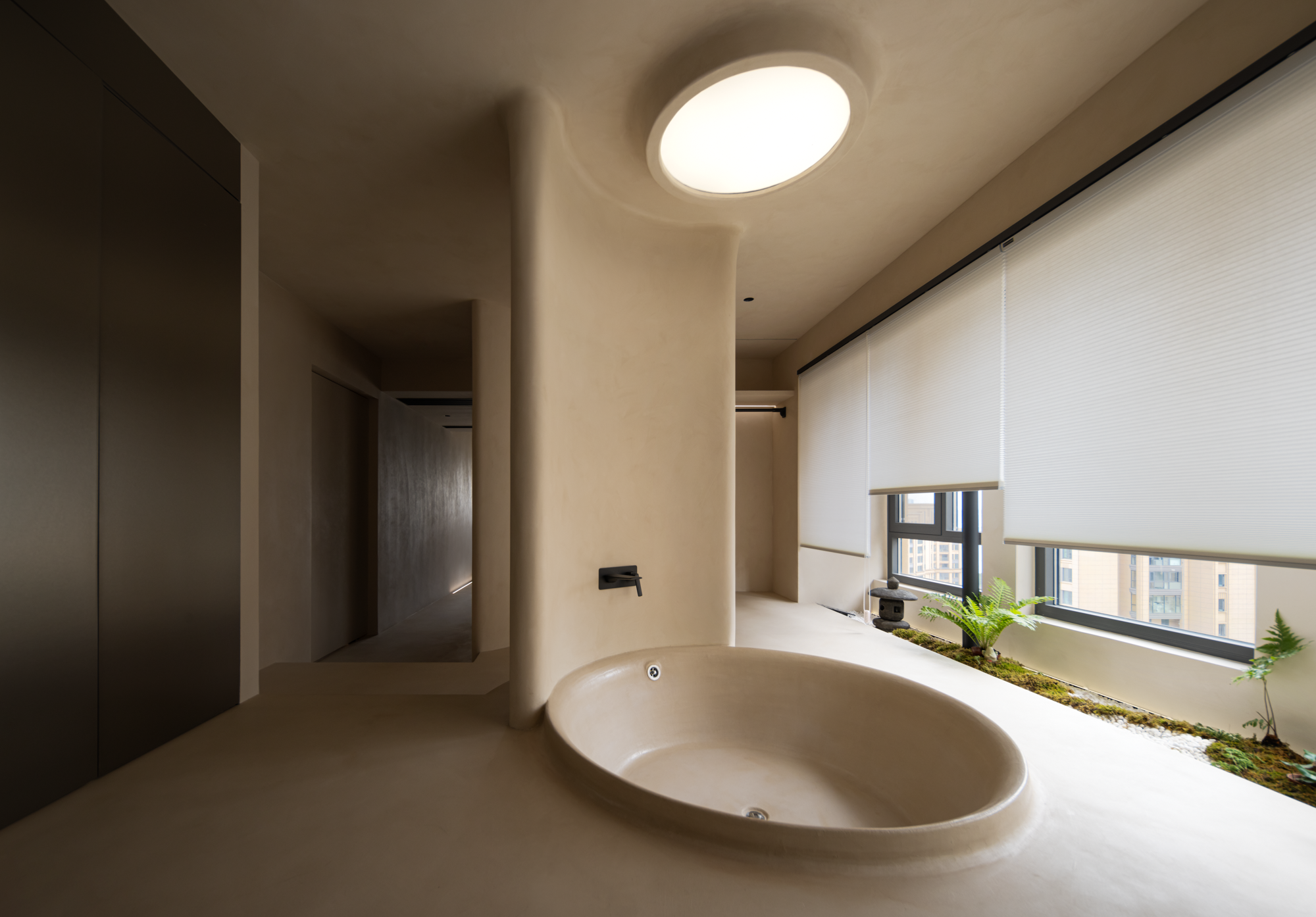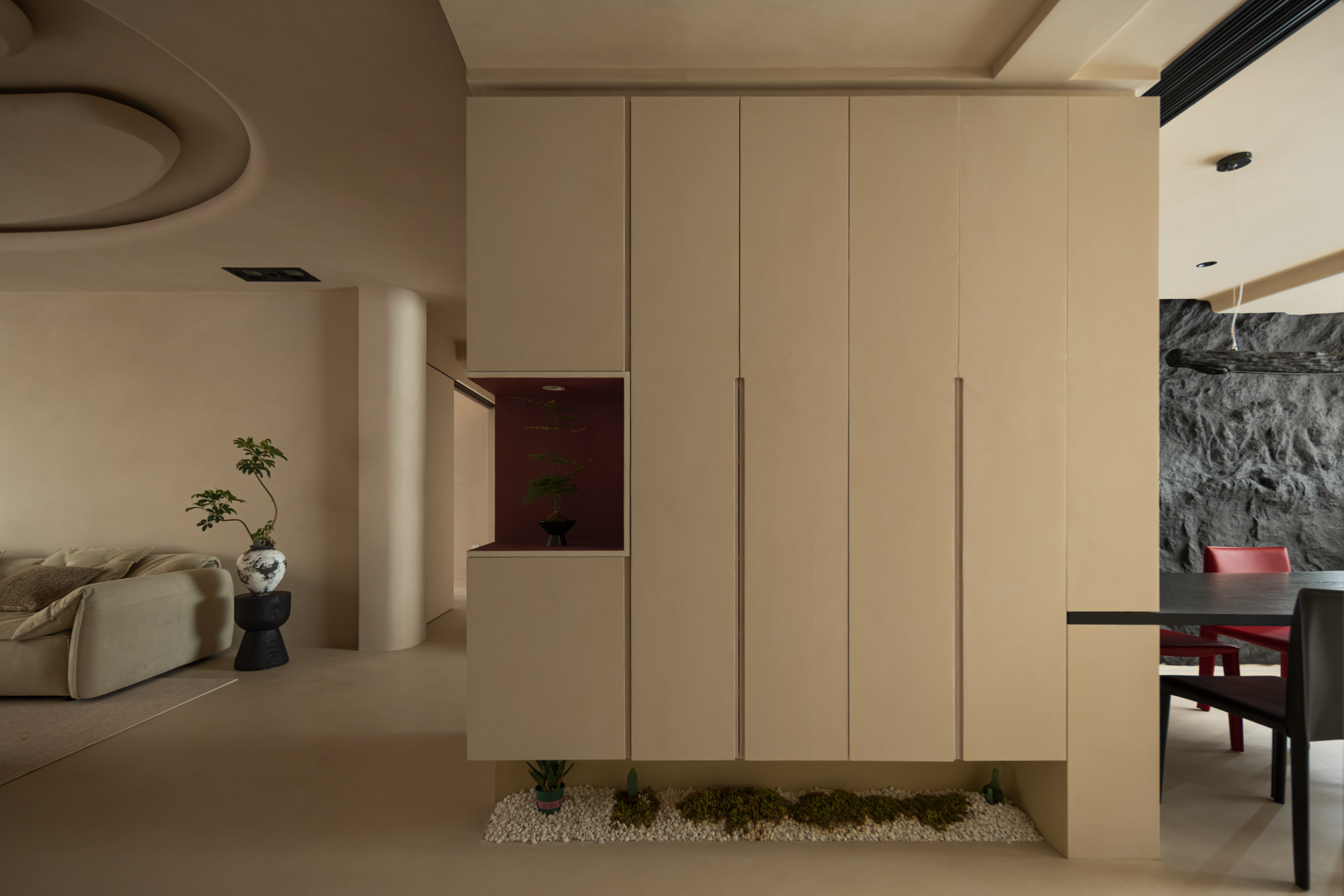 主卧采用偏轴门的形式,关上门时,整个区域天地墙完全一体,加上山洞一般的吊顶,让空间更有大自然的原始感
