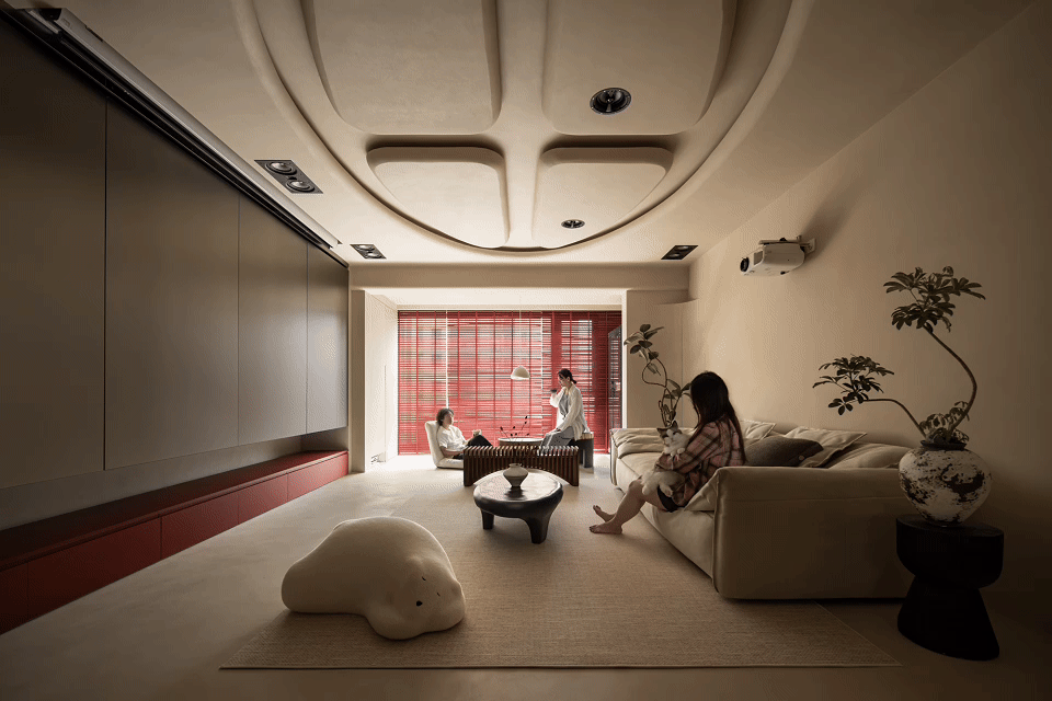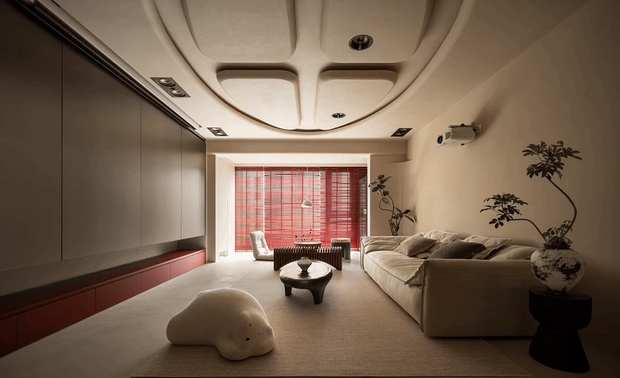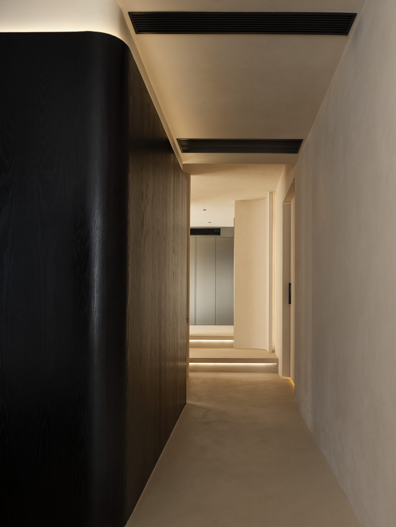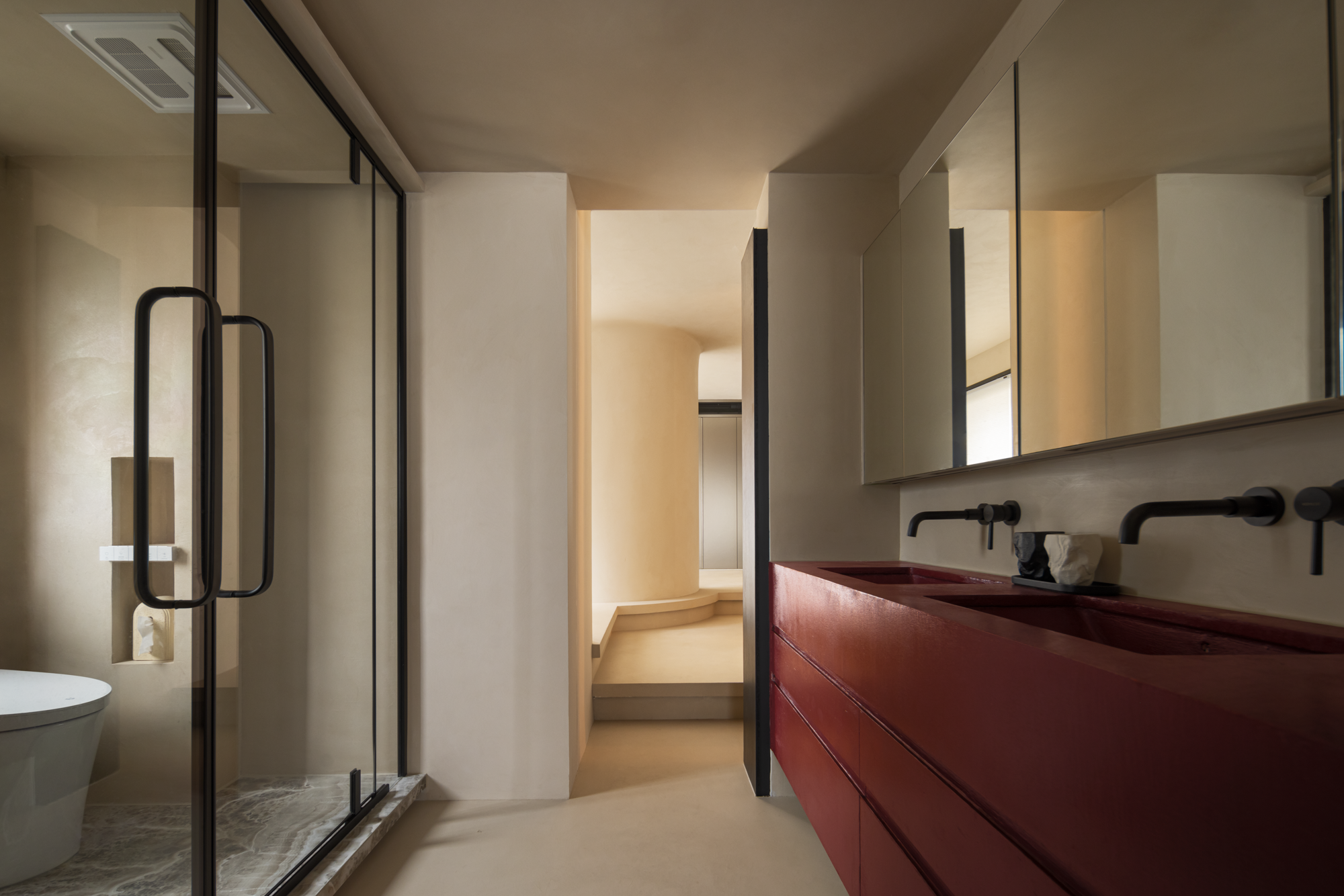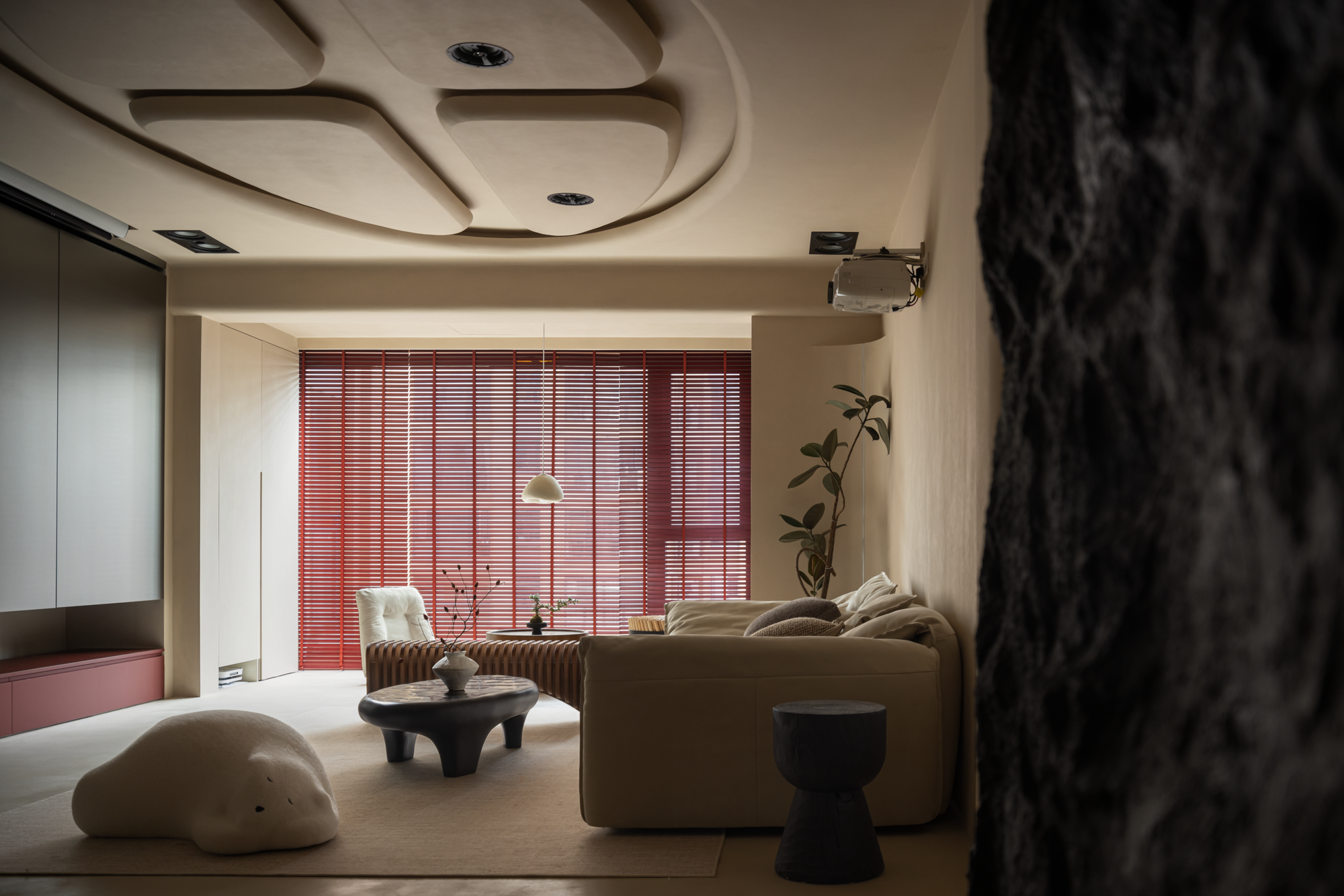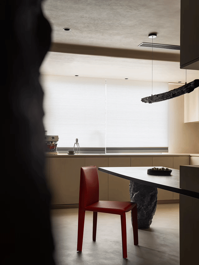 主卧采用偏轴门的形式,关上门时,整个区域天地墙完全一体,加上山洞一般的吊顶,让空间更有大自然的原始感