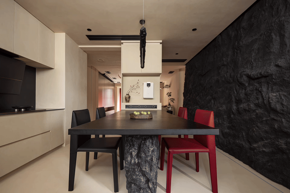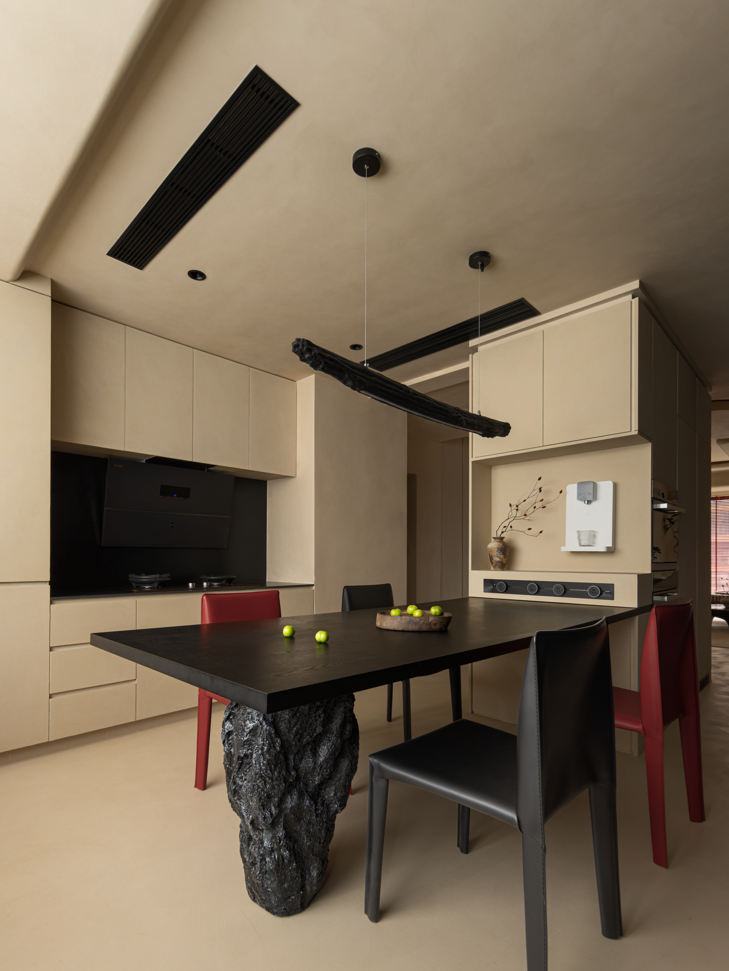 入户玄关柜与餐桌打造为一体,形成了一个非常开阔的洄游动线,玄关柜正面为端景及杂物柜,背面则将冰箱、蒸烤箱等嵌入柜体内