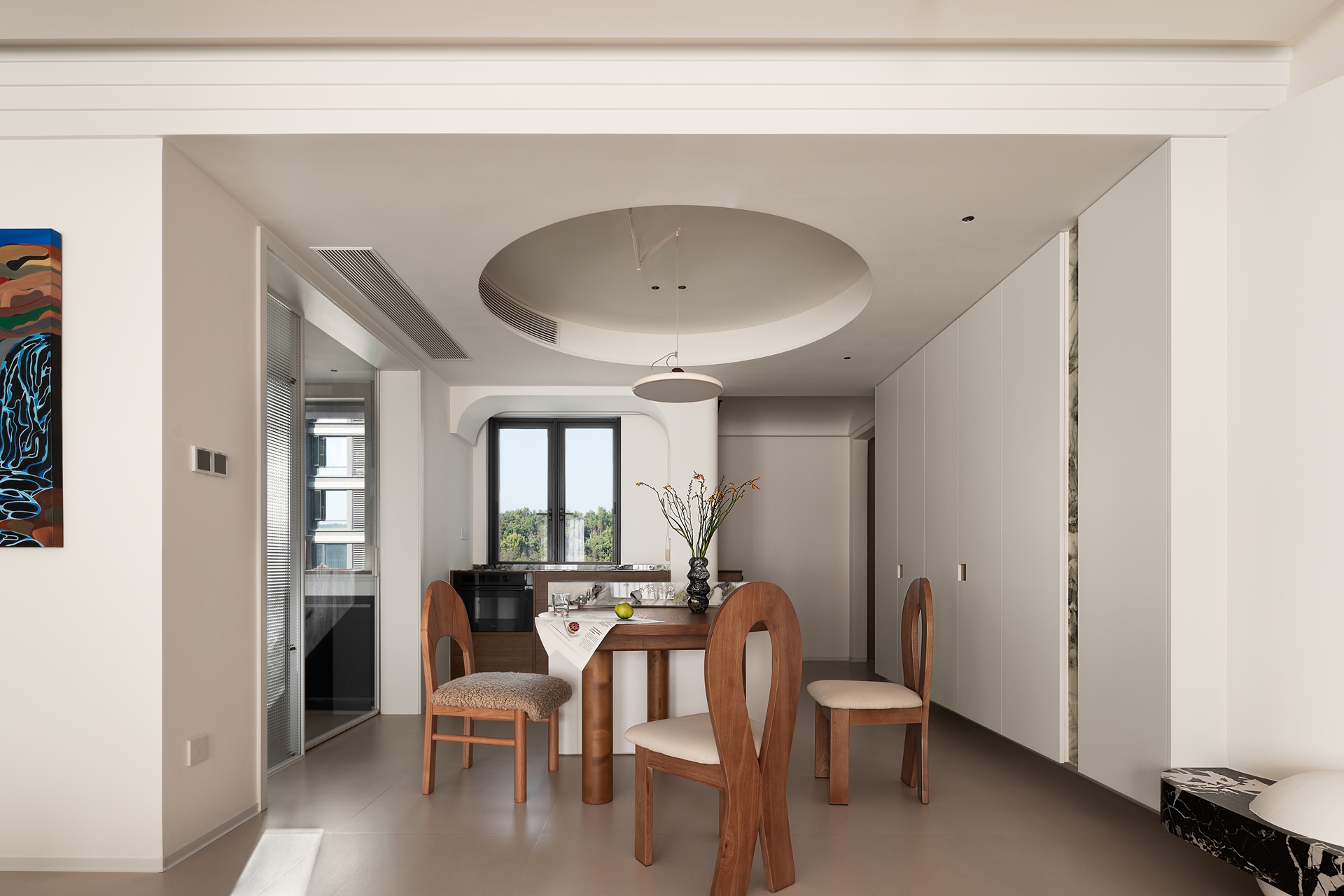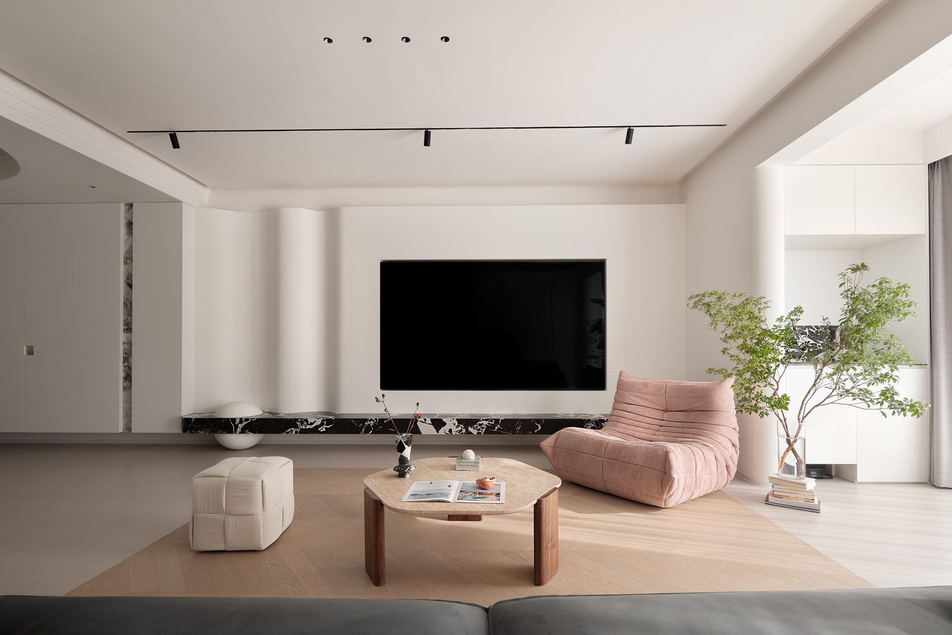 大通厅的布局,公共区域可以轻松容纳一家人的生活起居,在「流动的曲线」中感受生活的从容松弛。