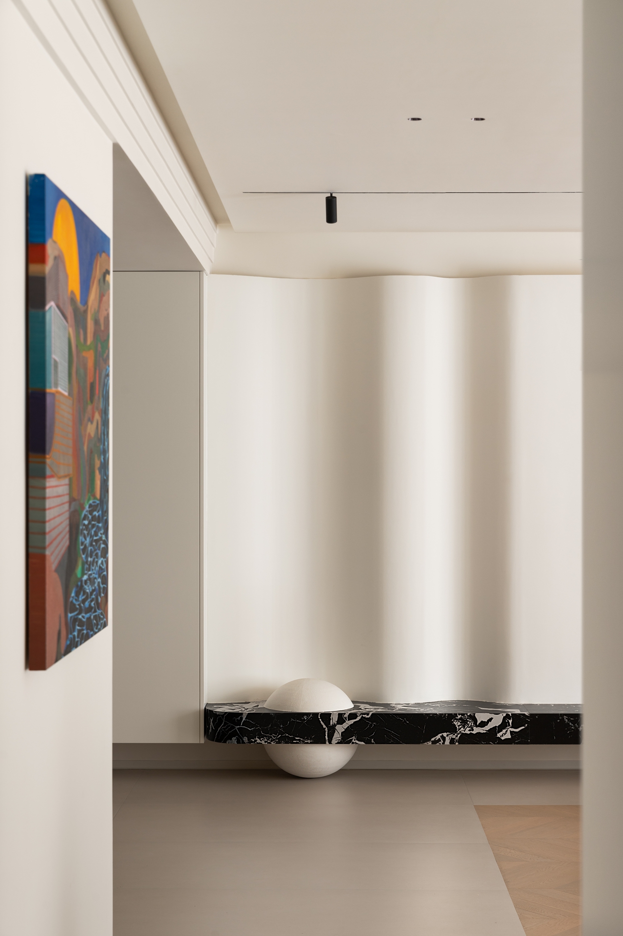 电视墙我们用GRG材料定制弧面造型,整体造型+柜体悬空打造轻盈的视觉效果,也方便日常更换收纳鞋子。穿插于台面的球体是点睛之笔,同样用GRG材料定制,让这种轻盈感多了一分踏实。