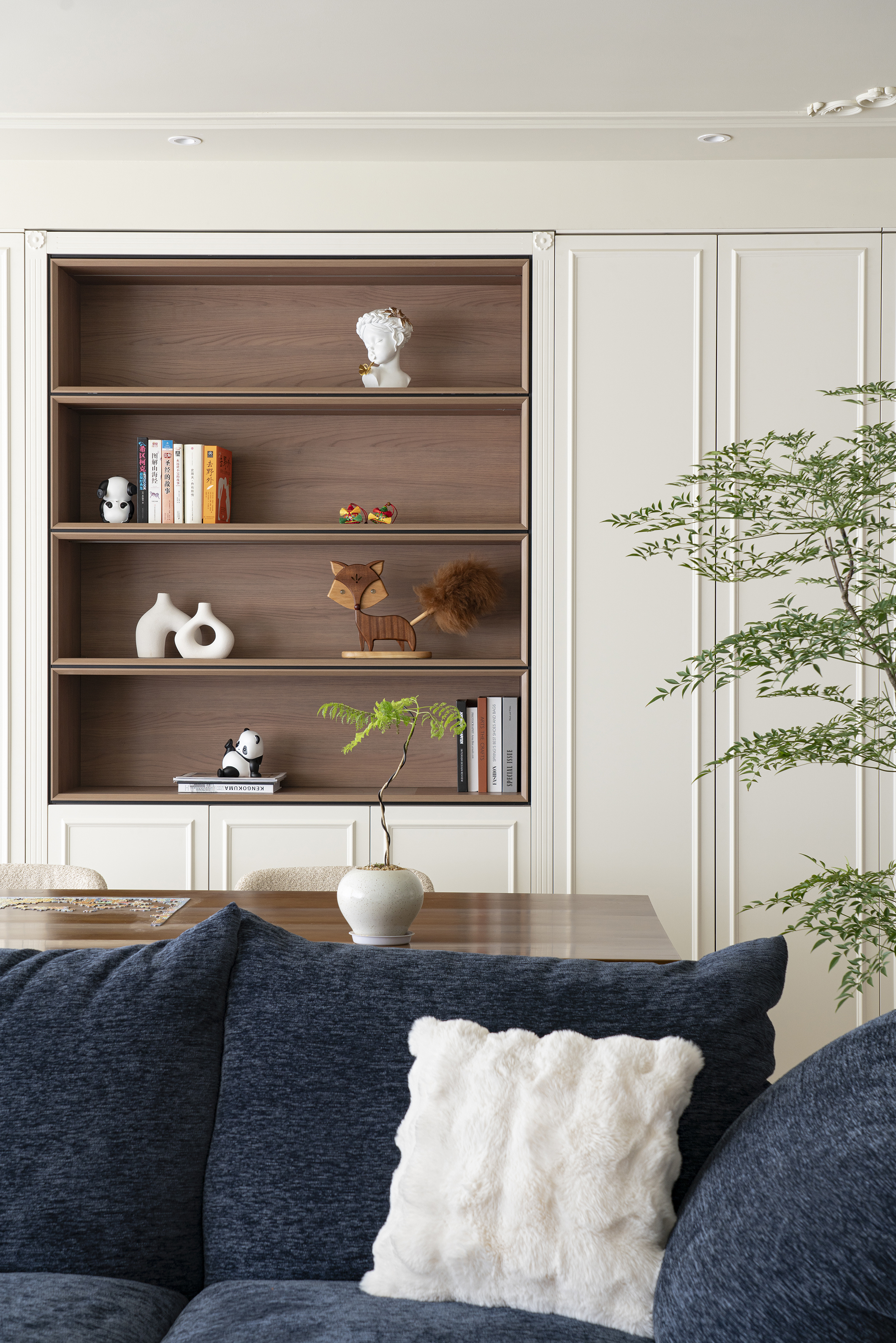 大理石材质天然的纹理和光泽,为空间增添一份高级的美感。沙发后侧的整面收纳柜和书架设计满足收纳功能,天然的纹理为整个空间增添了一抹温馨的自然气息。