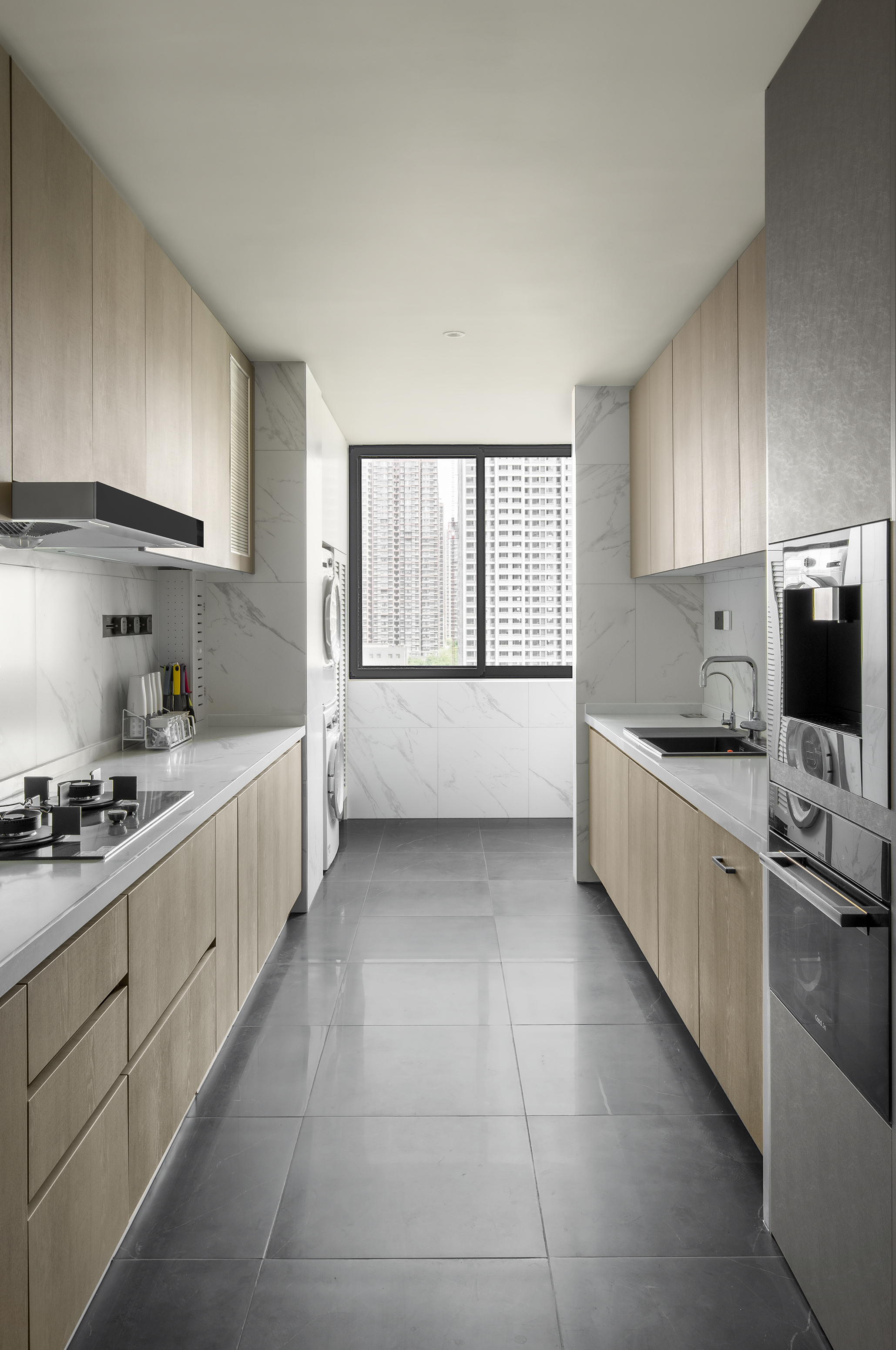 厨房选用了大量的木质饰面,地面为精装原地砖,整体空间清爽的气质相呼应,动线设计流畅,满足日常操作习惯。