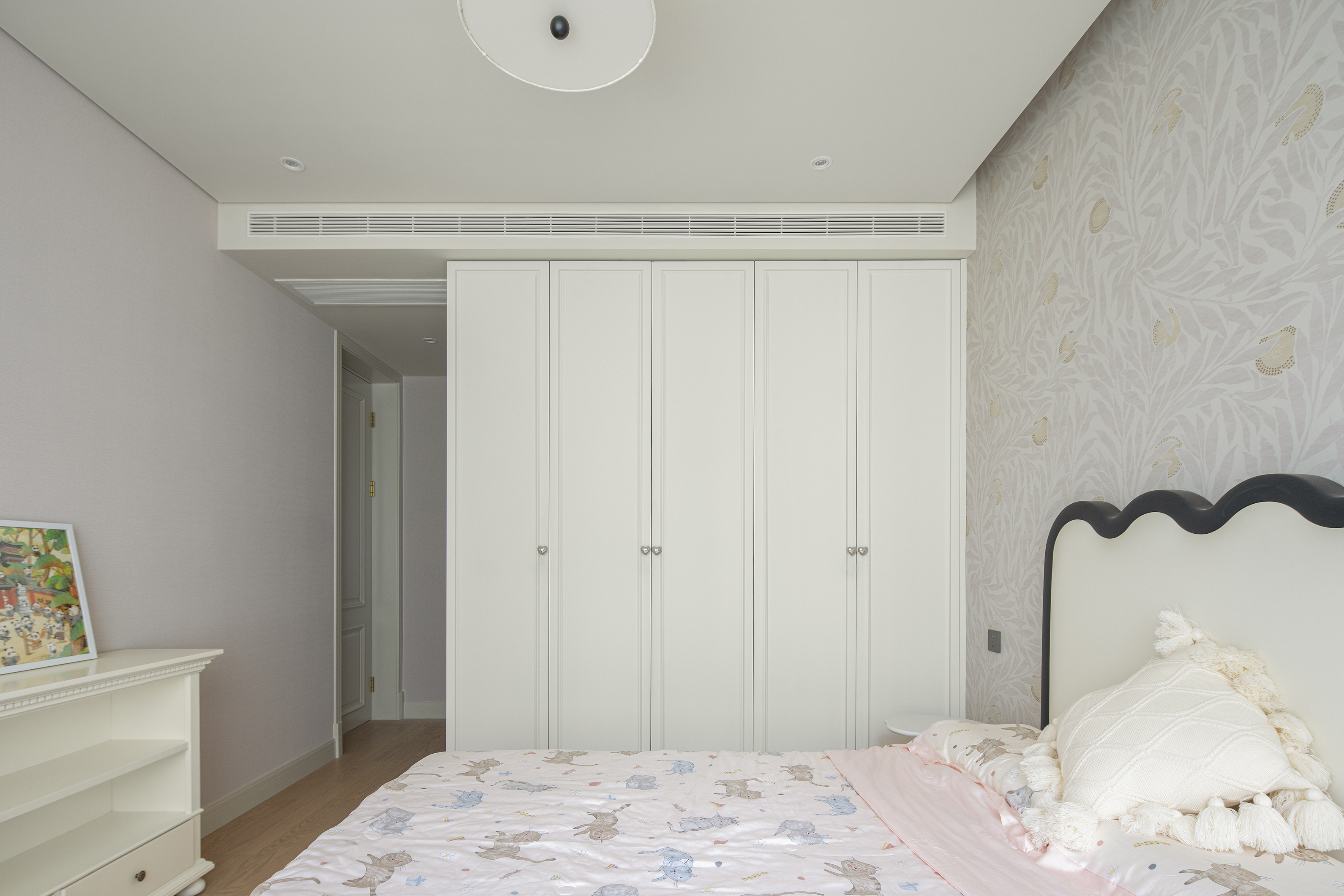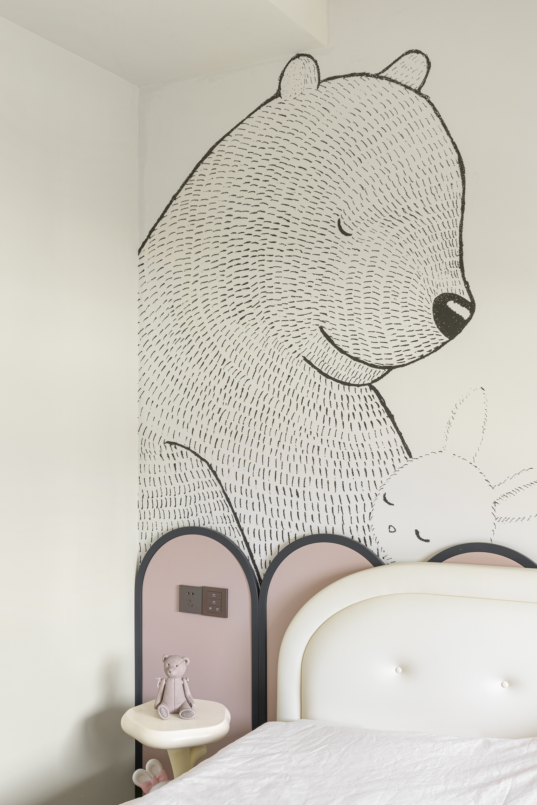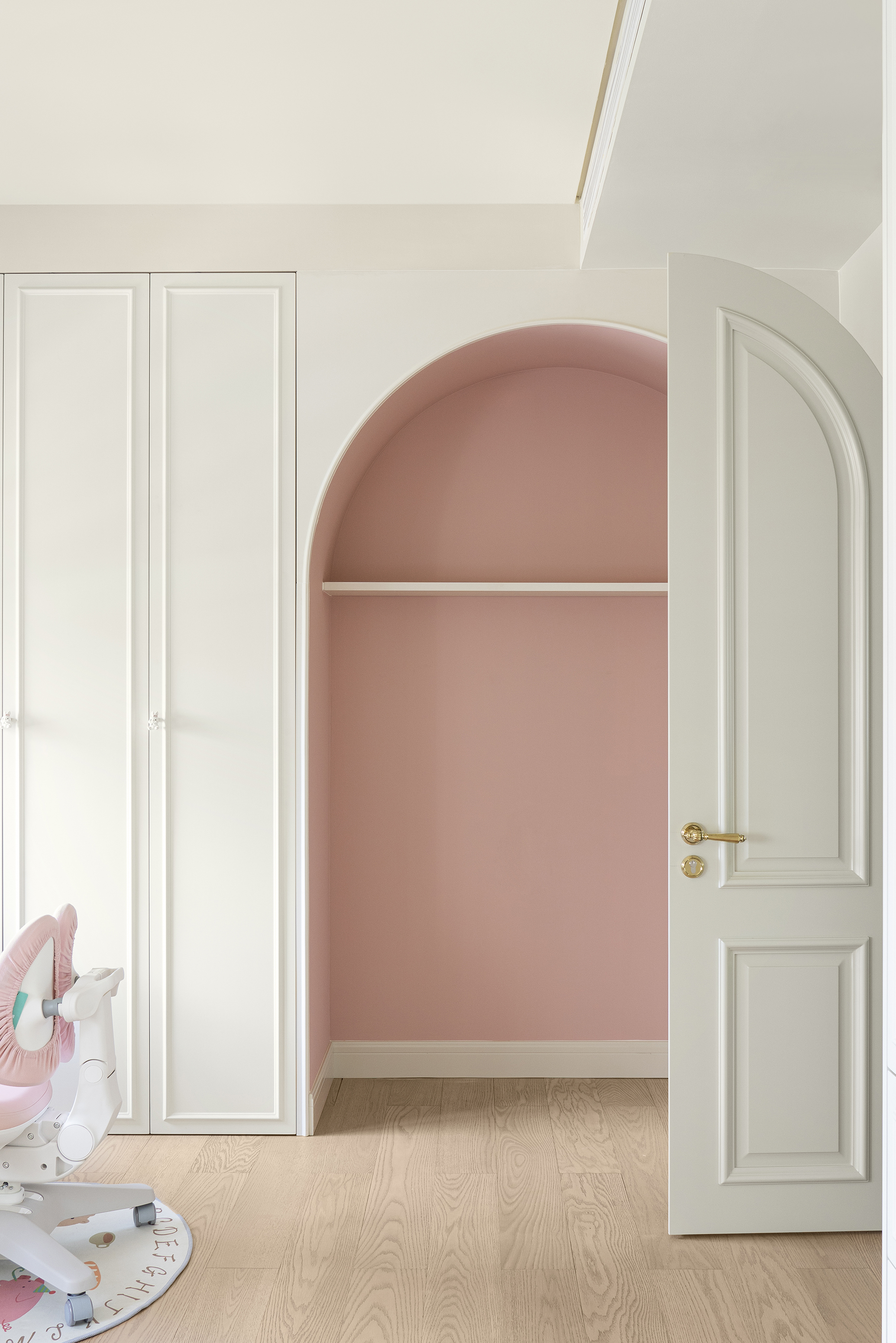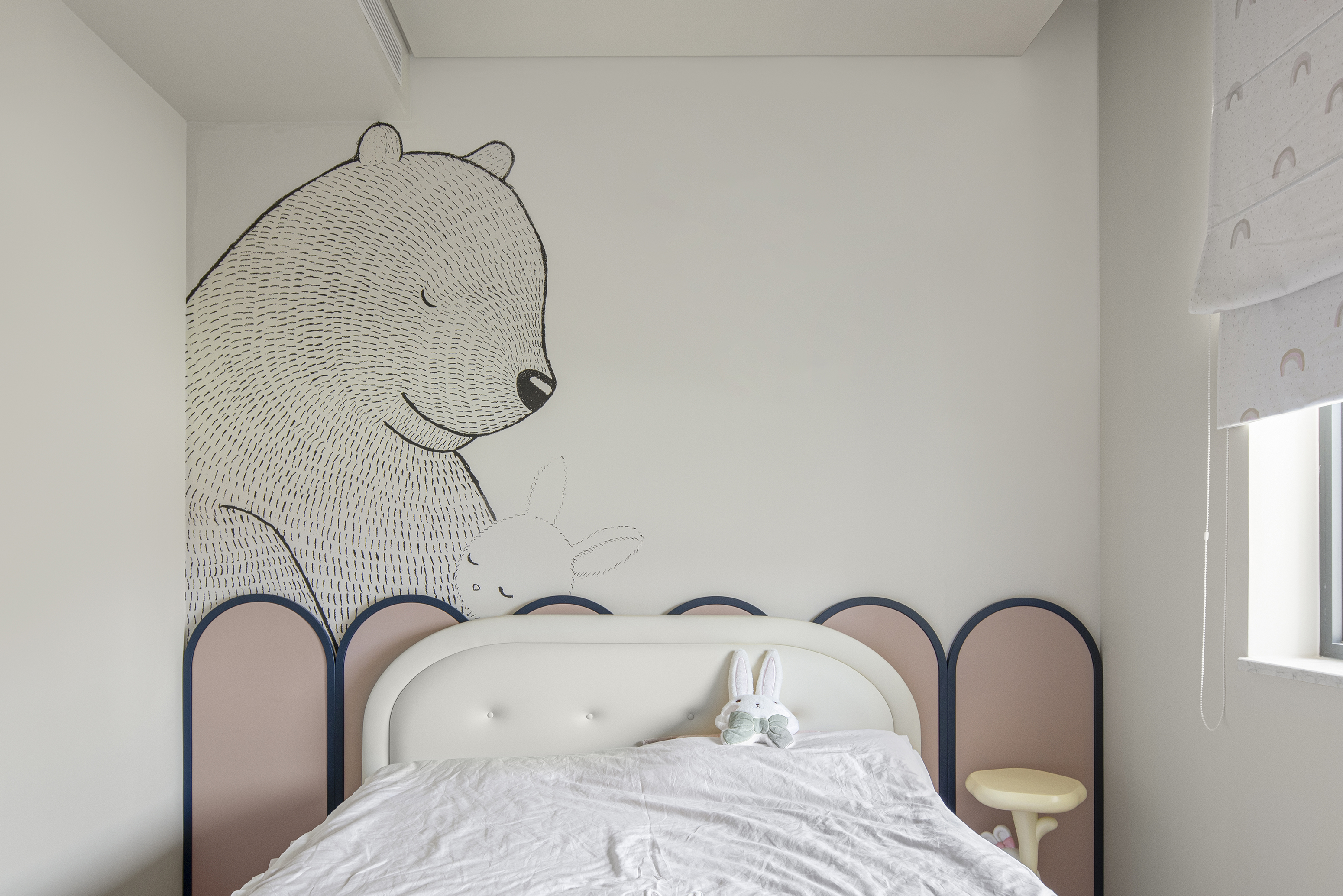 儿童房采用活力而富有少女感的粉色,搭配定制的壁画,让整体空间显得更加活泼灵动。由于原始空间面积较小,为尽可能满足孩子成长需要,大胆打破空间屏障,创造出休息、学习与练琴(弧形柜下方为钢琴区域)相结合的多功能空间。