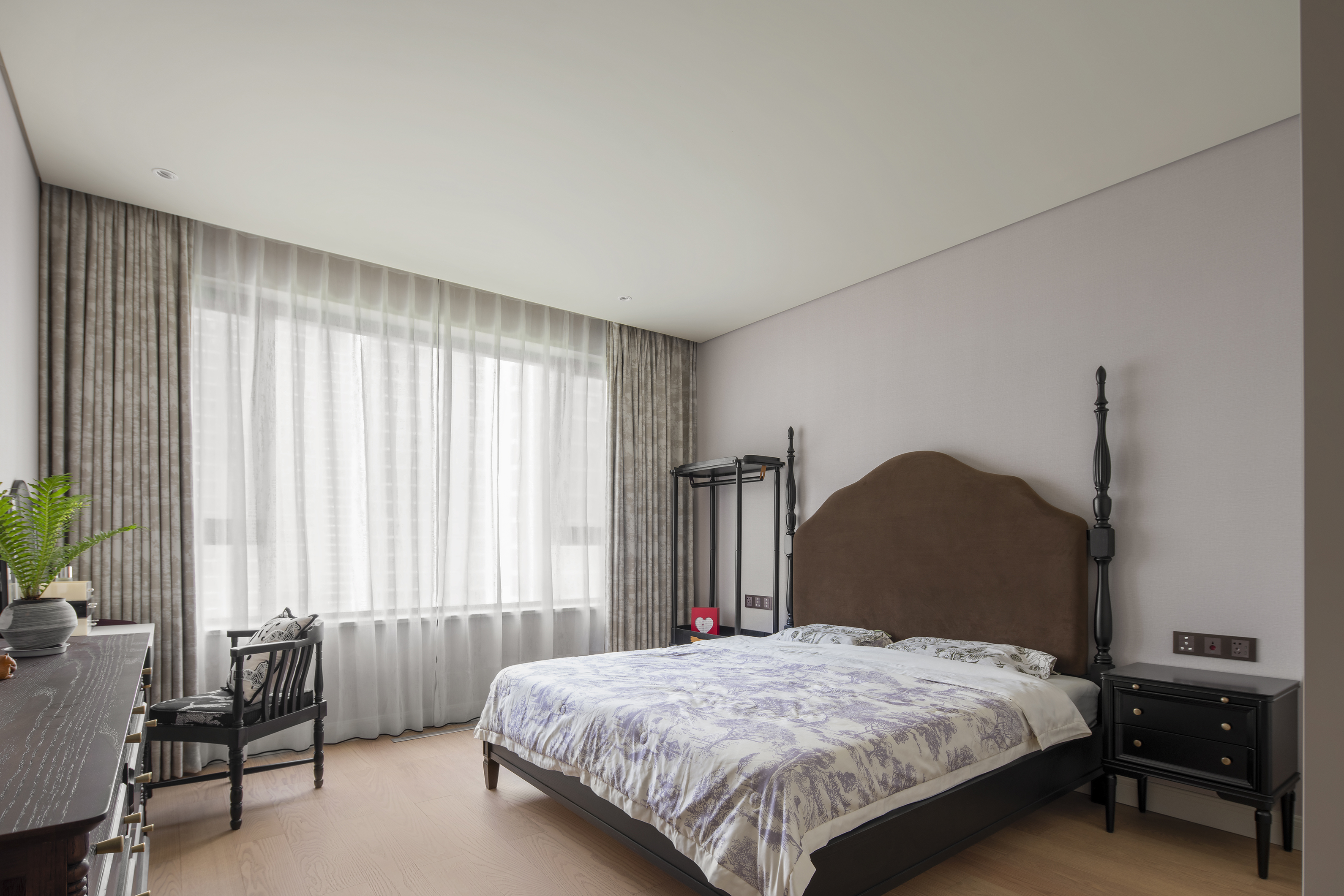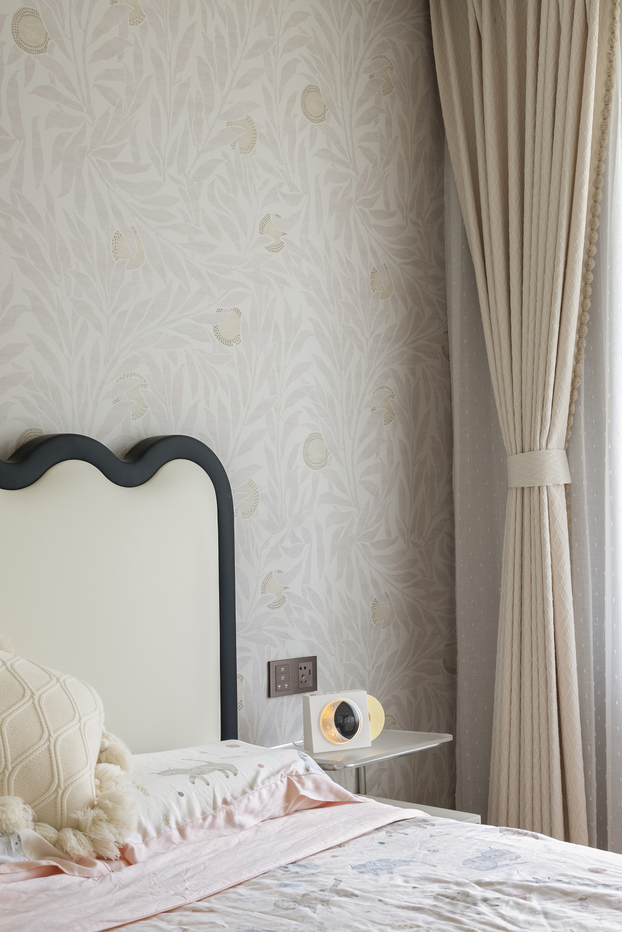 次卧设计保持法式风格的优雅姿态,复古墙纸搭配波浪床头,赋予空间流畅的动态美感。