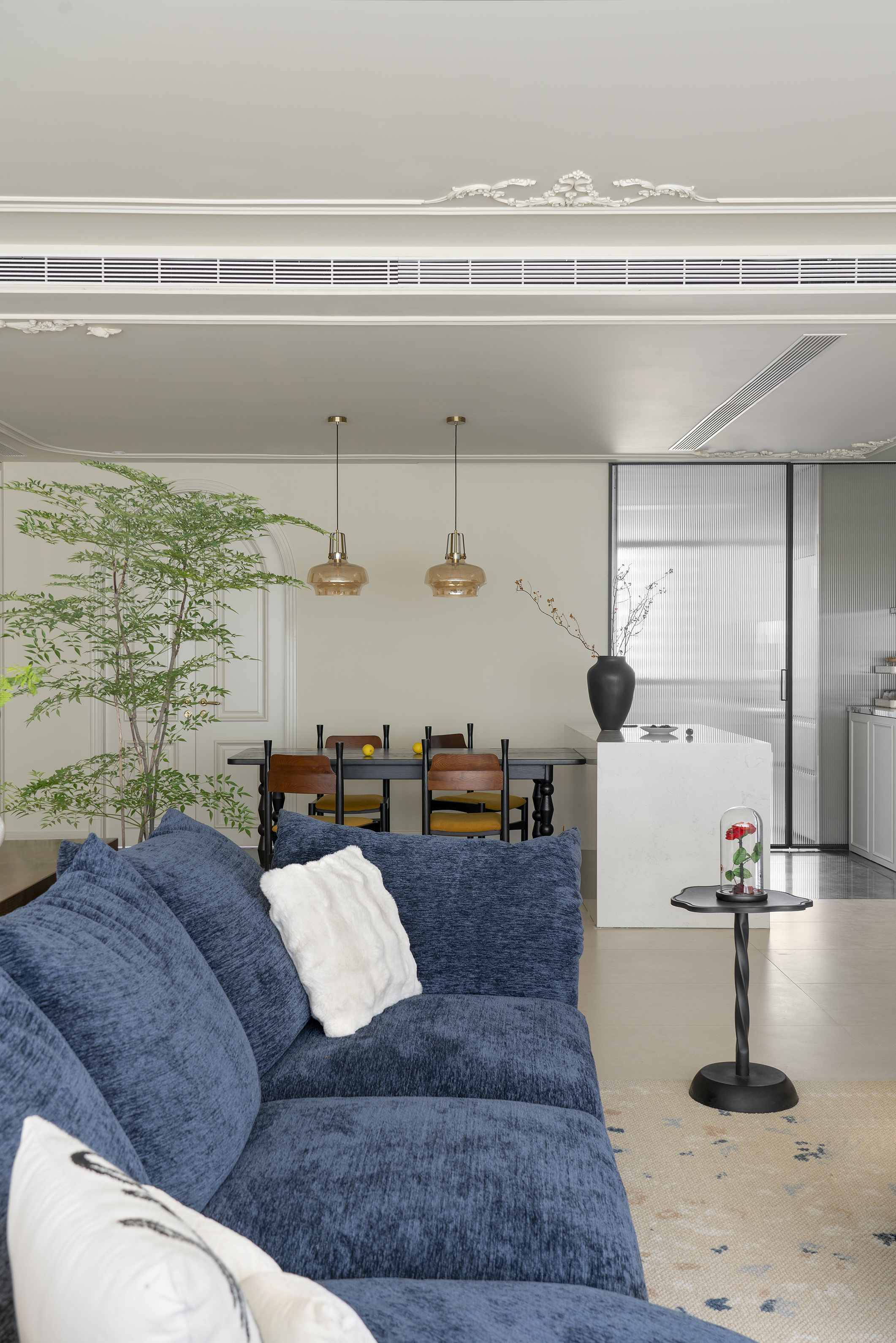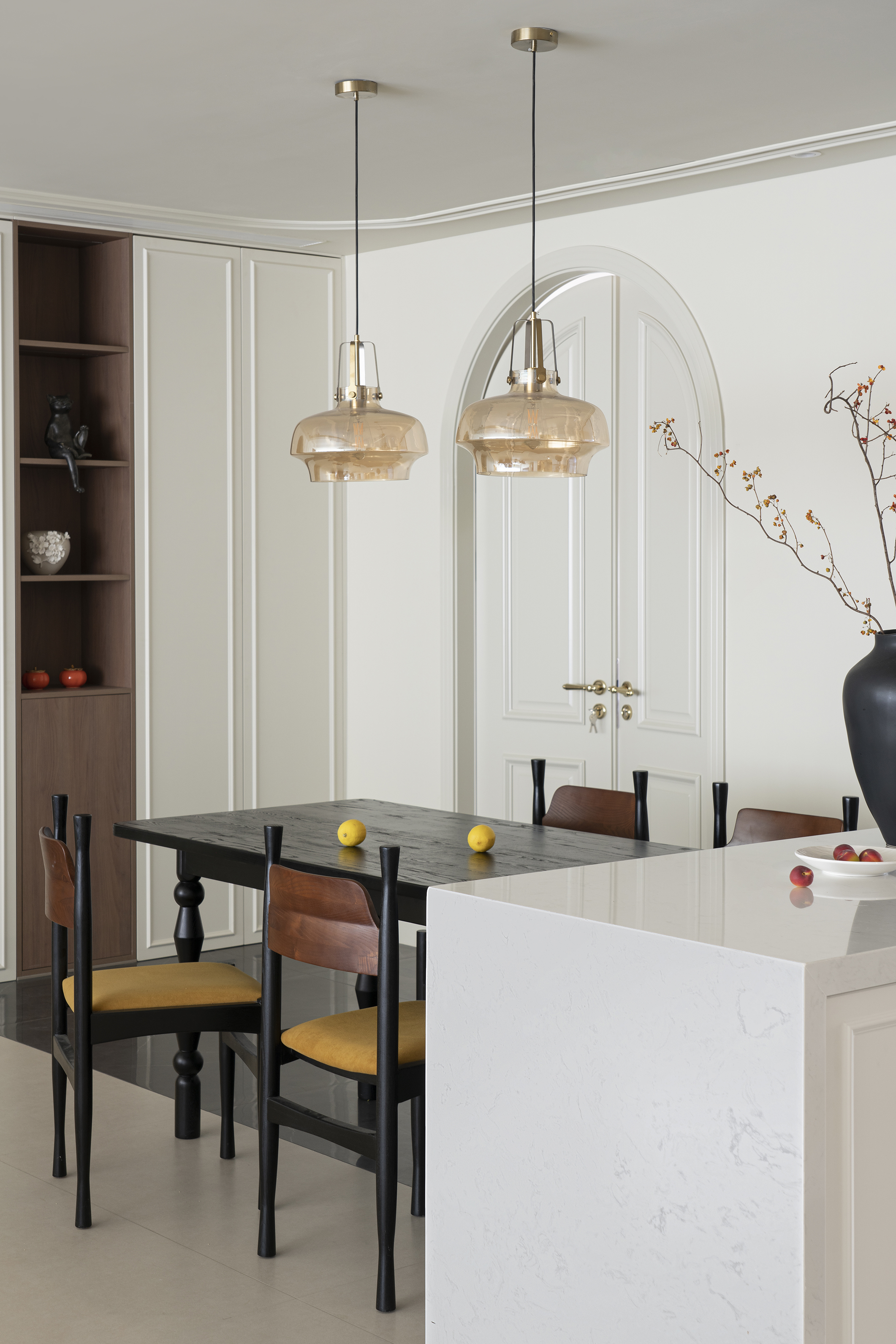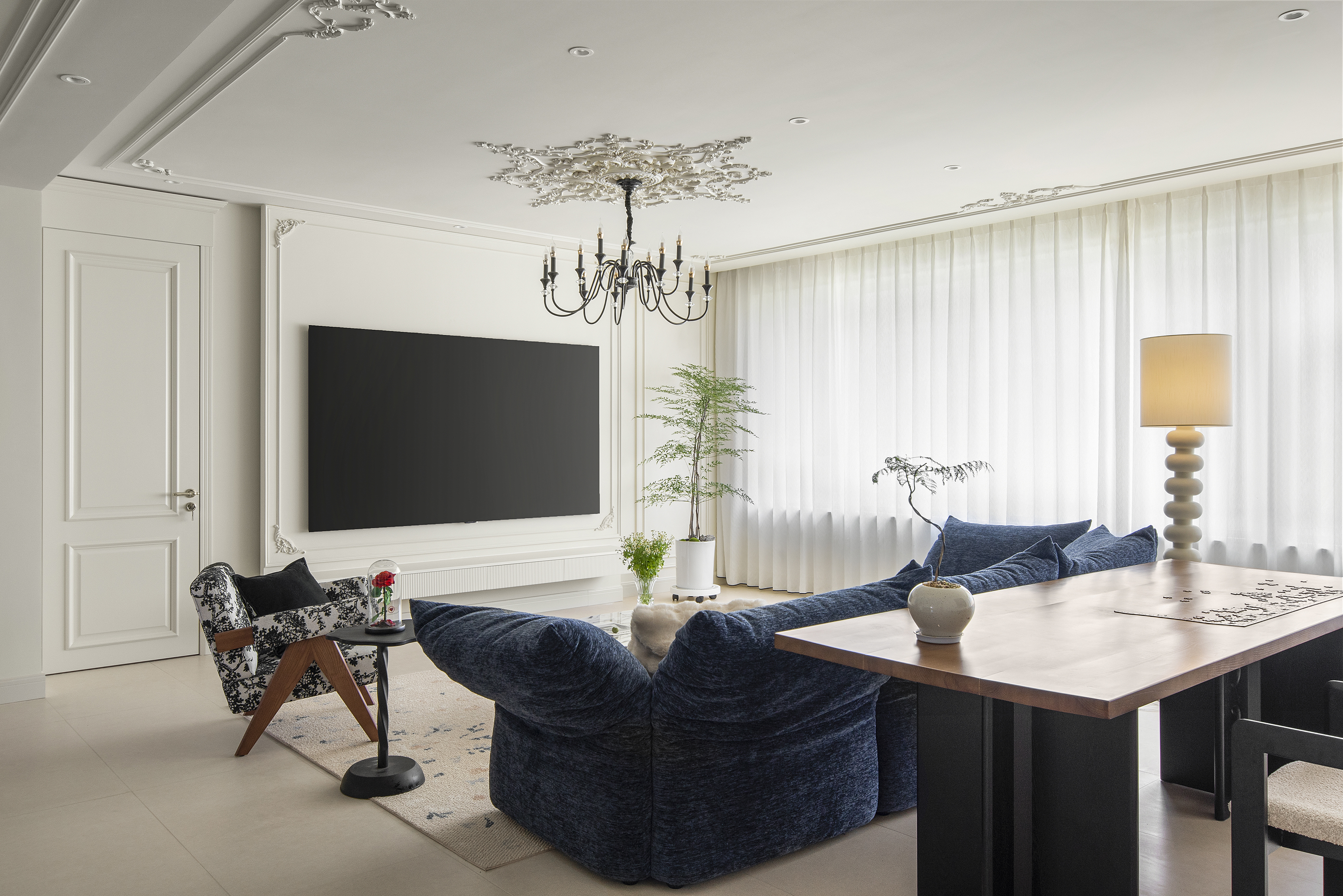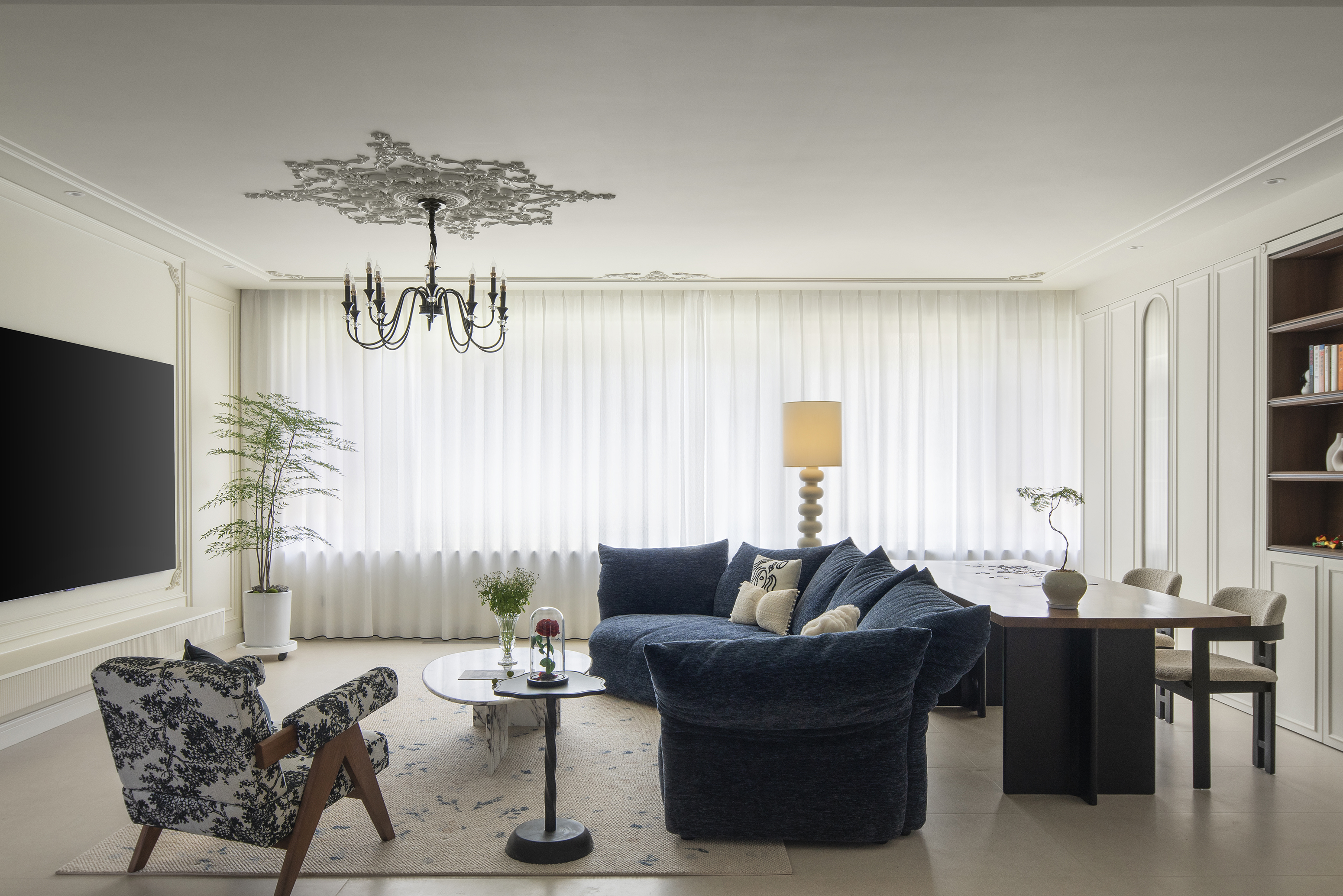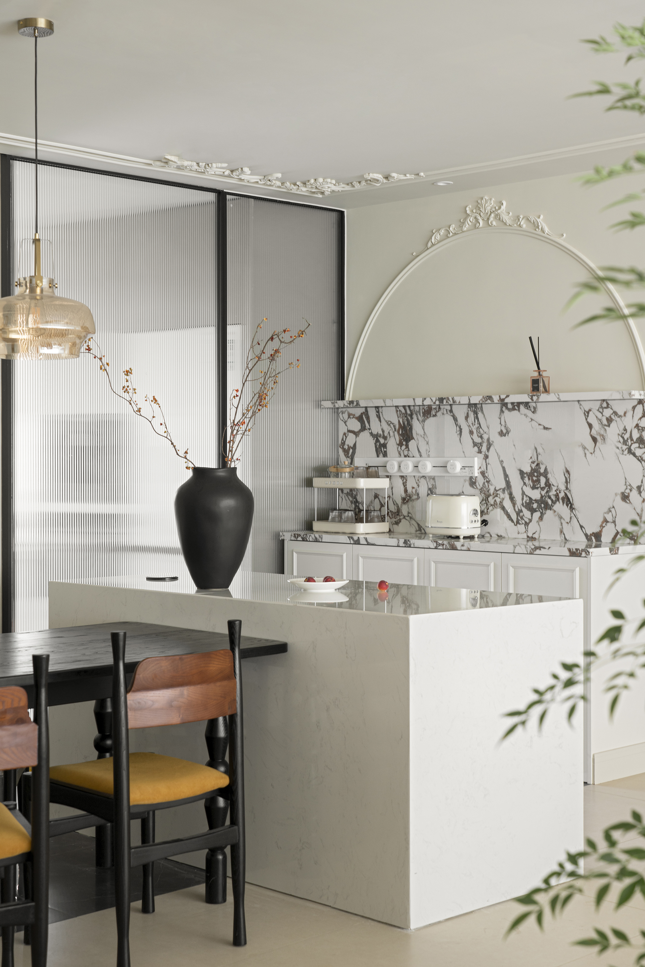 用餐区黑白配色的餐桌加岛台,搭配木质餐椅和中古吊灯,将整个餐厅的文艺电影感氛围拉满,搭配着精致的石膏线装饰,展现出优雅气质。