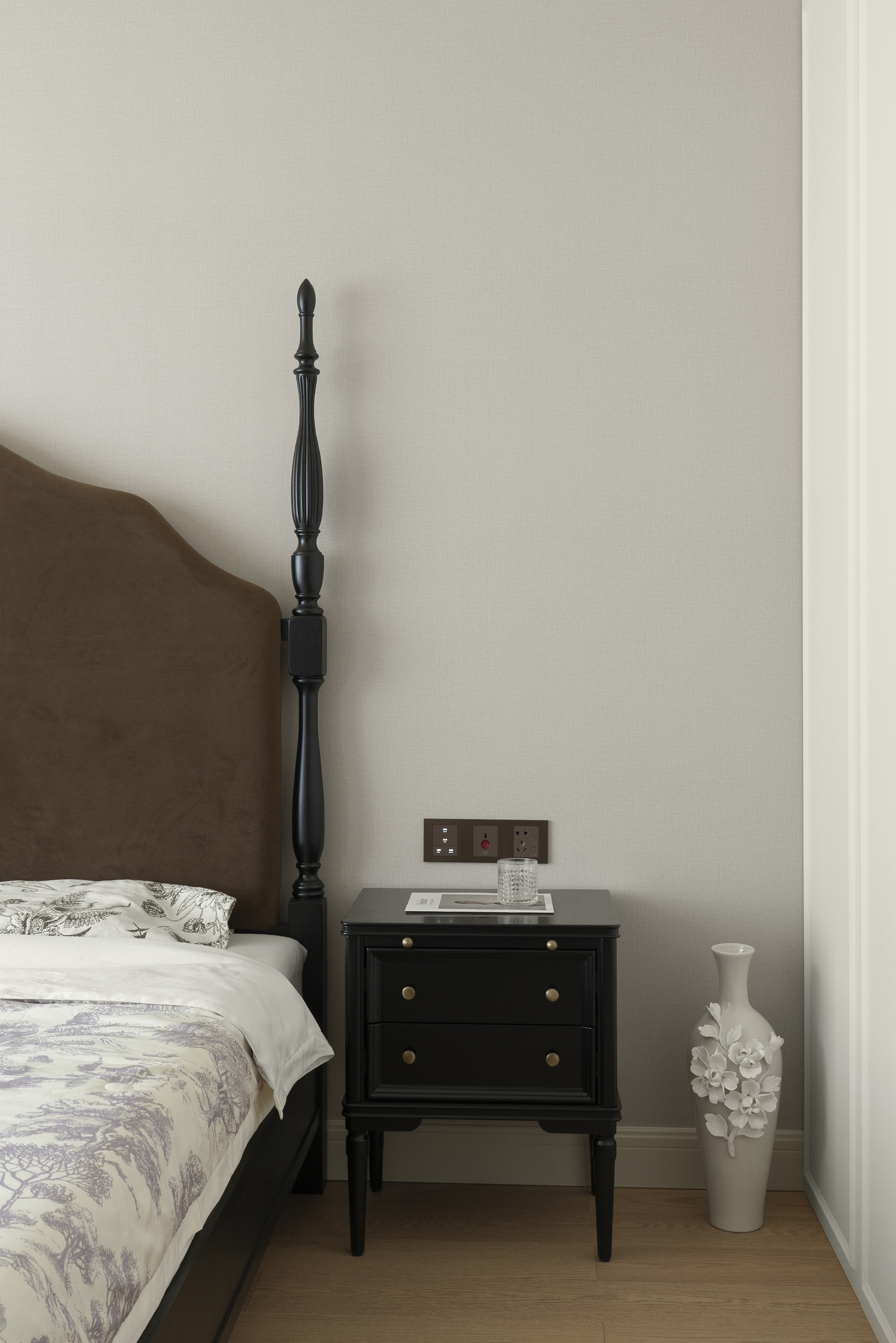 卧室保持纯粹的色调和自然舒适的氛围,富有装饰性的高床头与复古斗柜相对应,不趋于一般的对称性床头柜