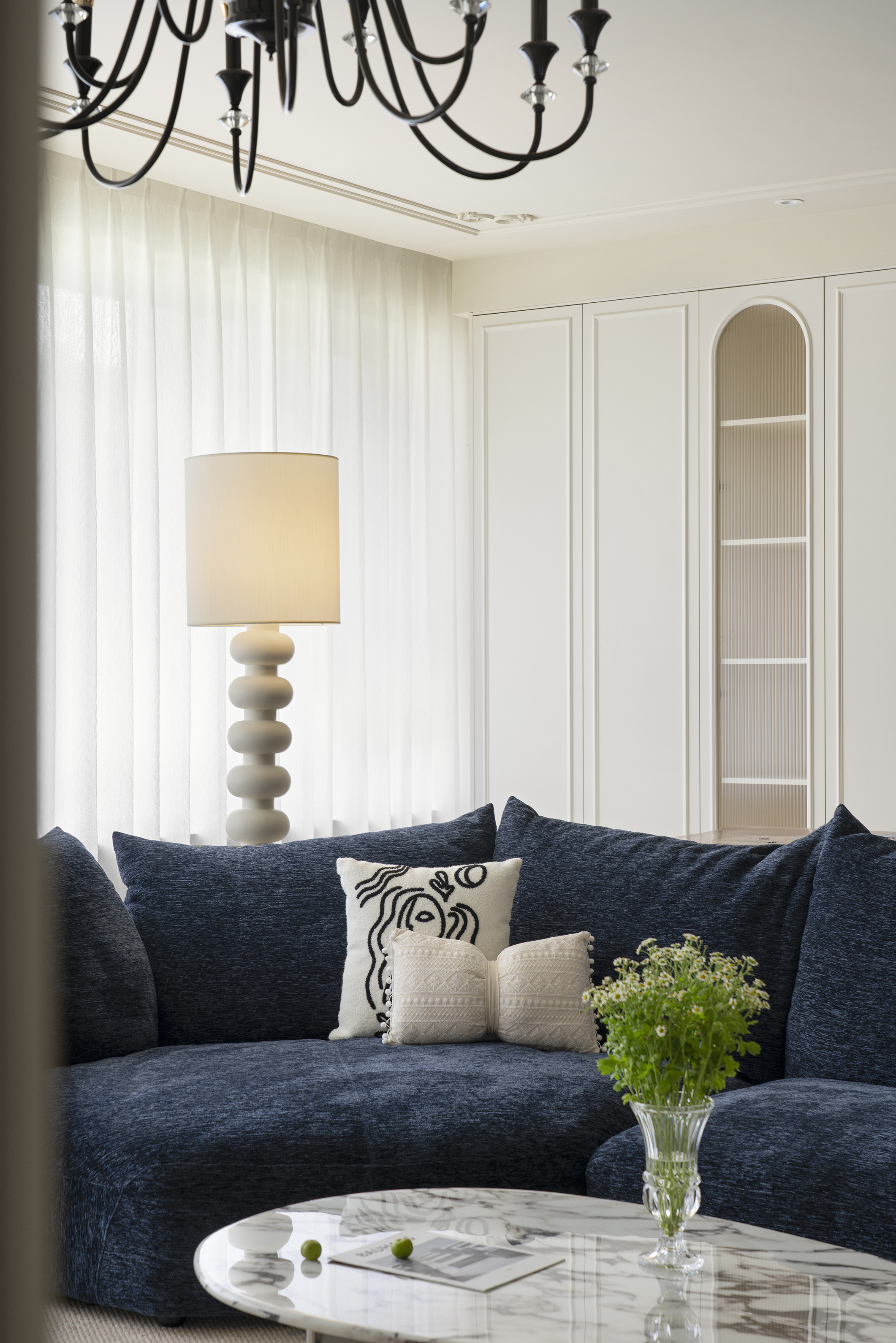 花瓣式沙发搭配刺绣印花单椅,复古的沉静与法式的慵懒搭配出恰到好处的舒适,毫不费力的体现出当下所追求的松弛感。