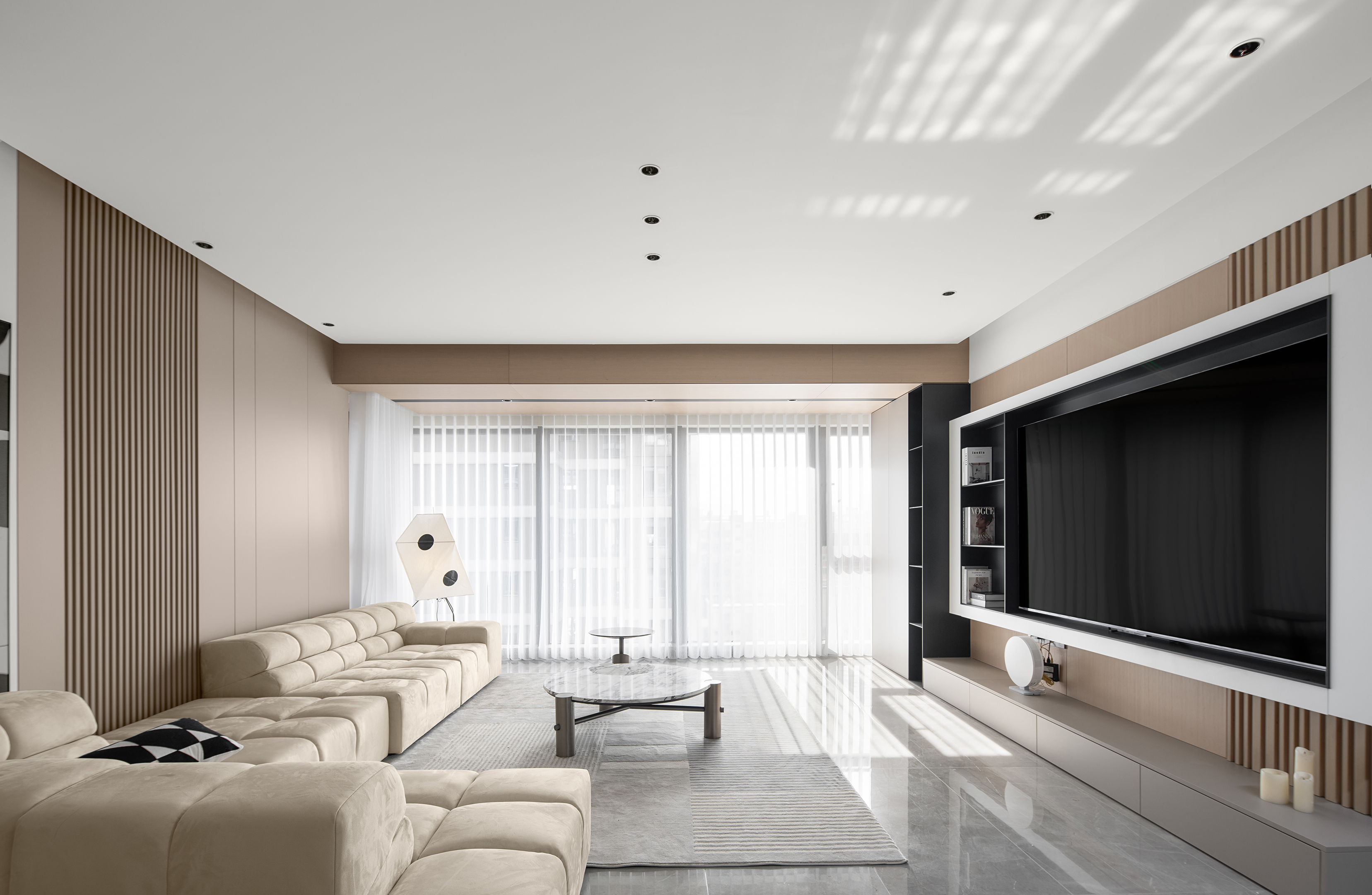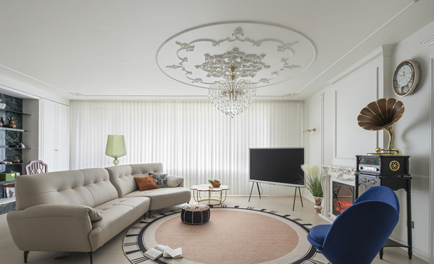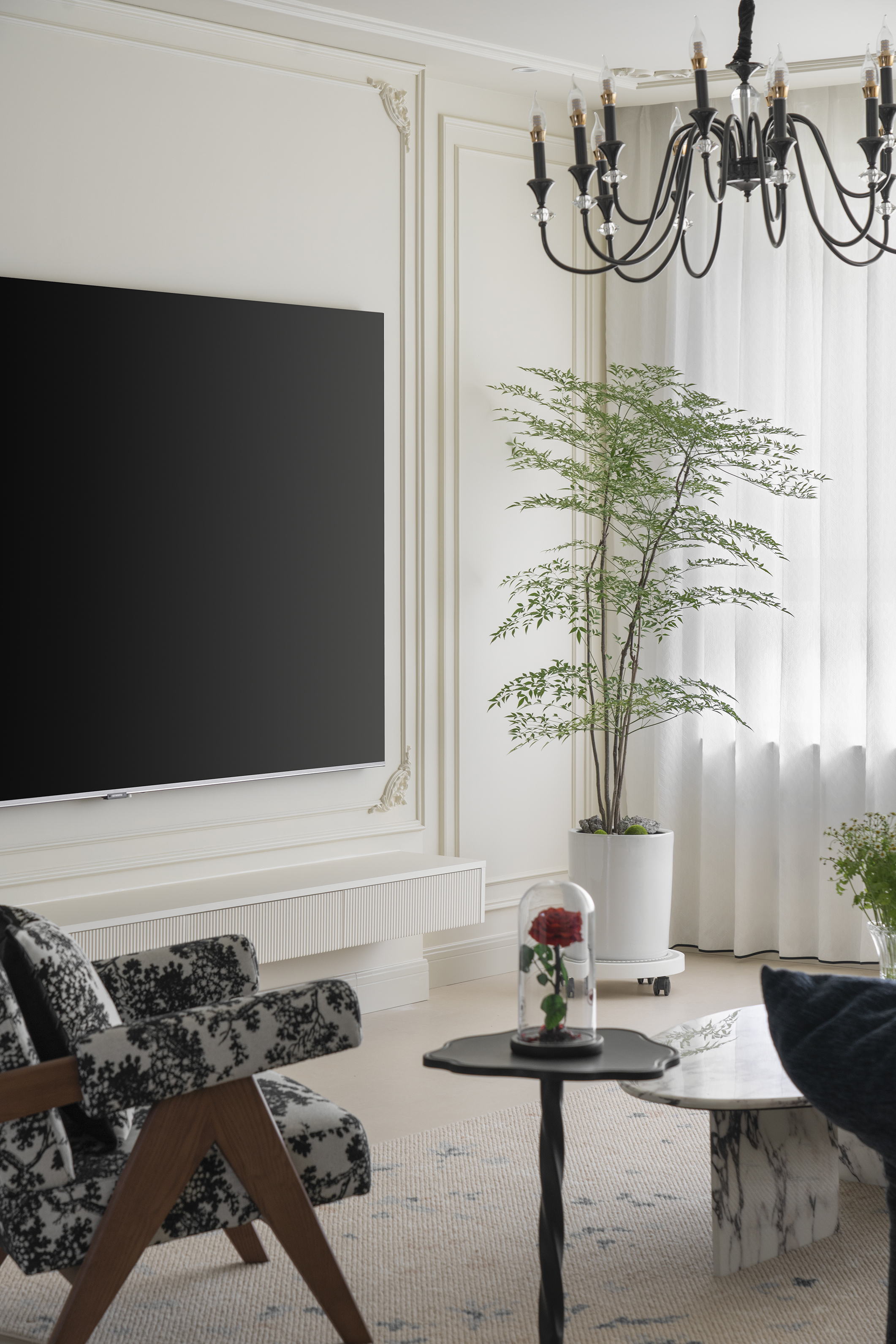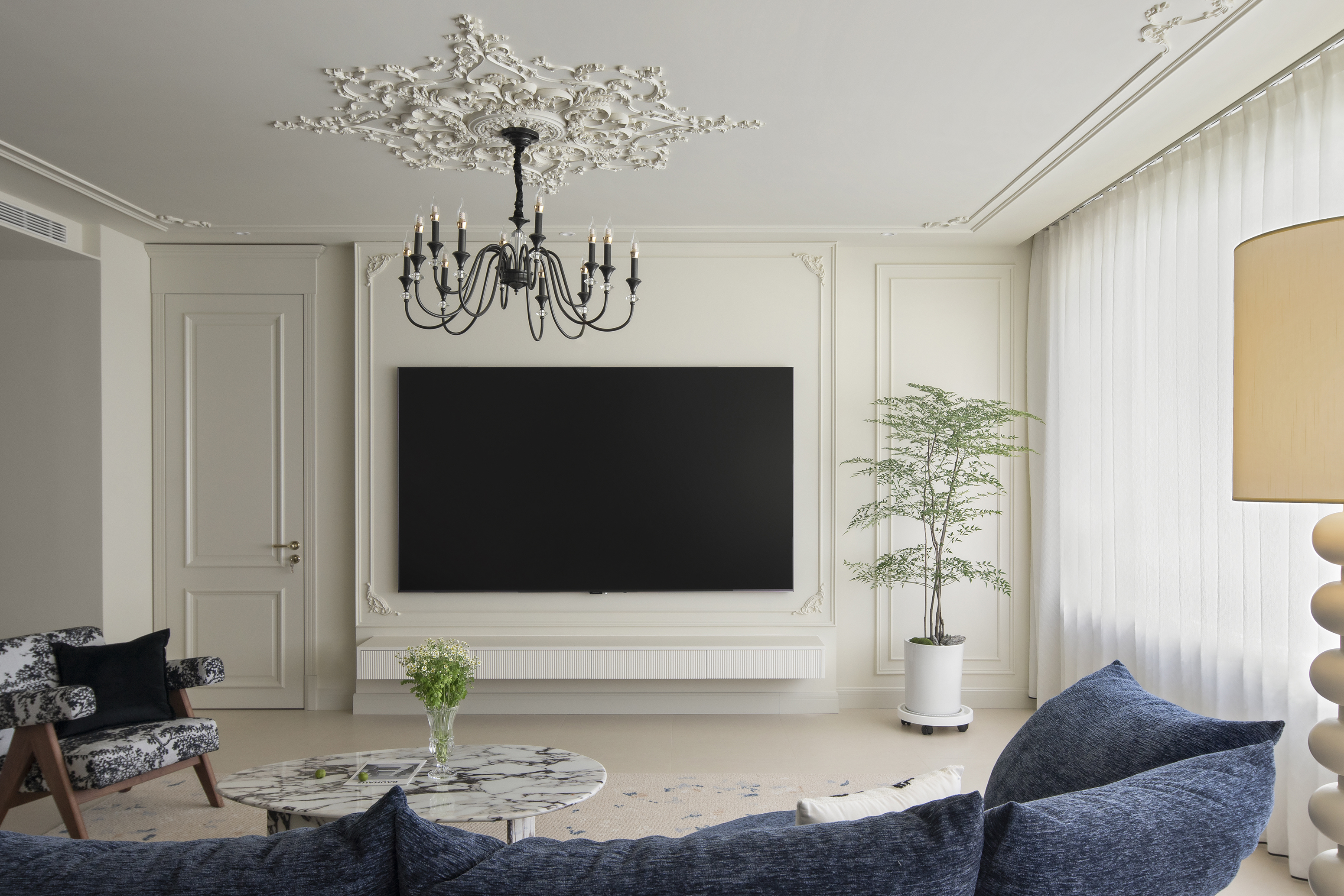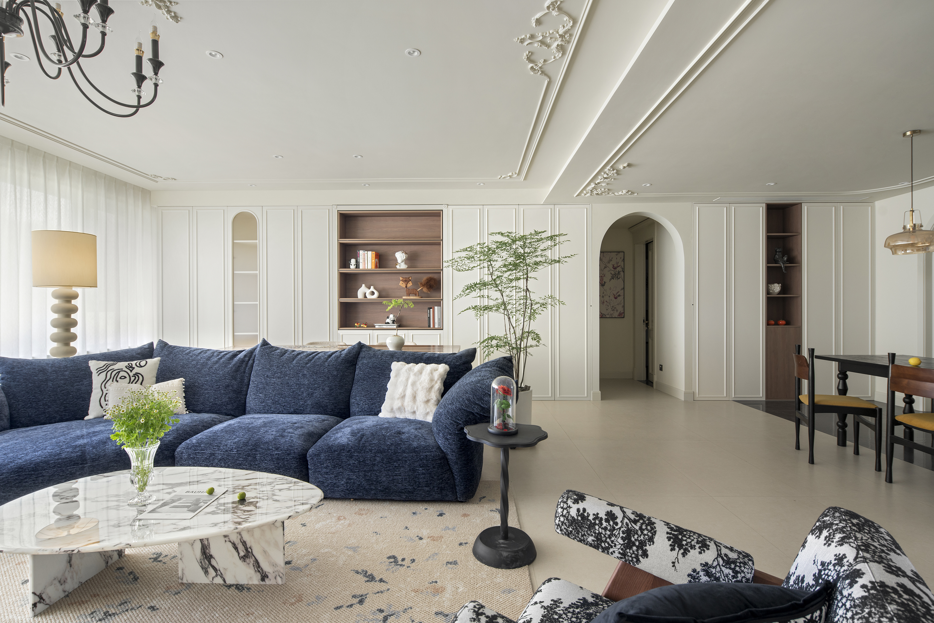 客厅以柔和的色调和自然的材质,营造出宁静而平和的氛围。墙面的石膏线彰显细腻和浪漫,线条在不同的空间内延伸,形成流畅的过渡效果,不仅增强了空间的连贯性,在视觉上更有层次感。