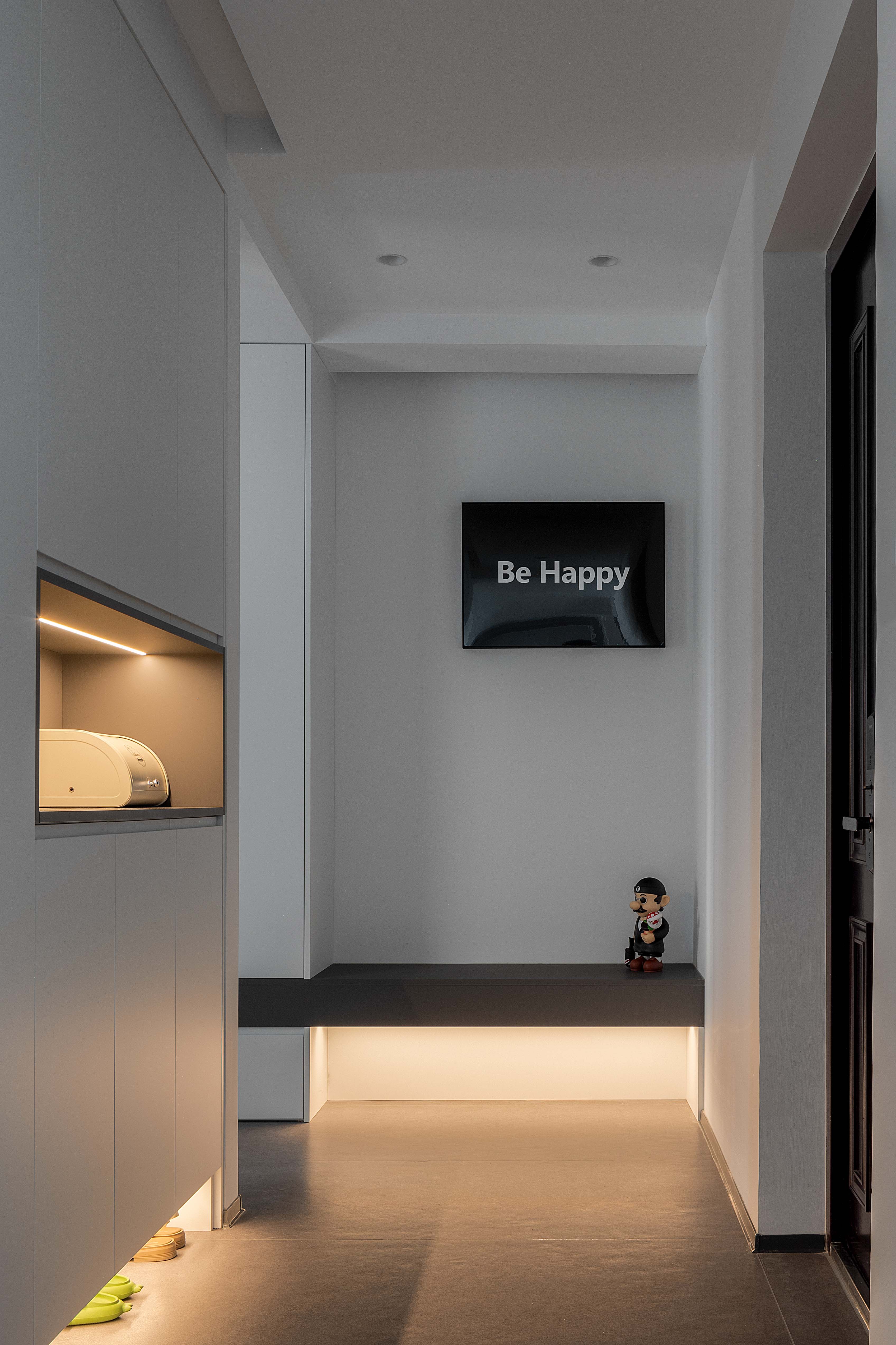 入户定制玄关收纳柜,悬浮设计营造出高级感,底部嵌入灯带,进门仪式感拉满。