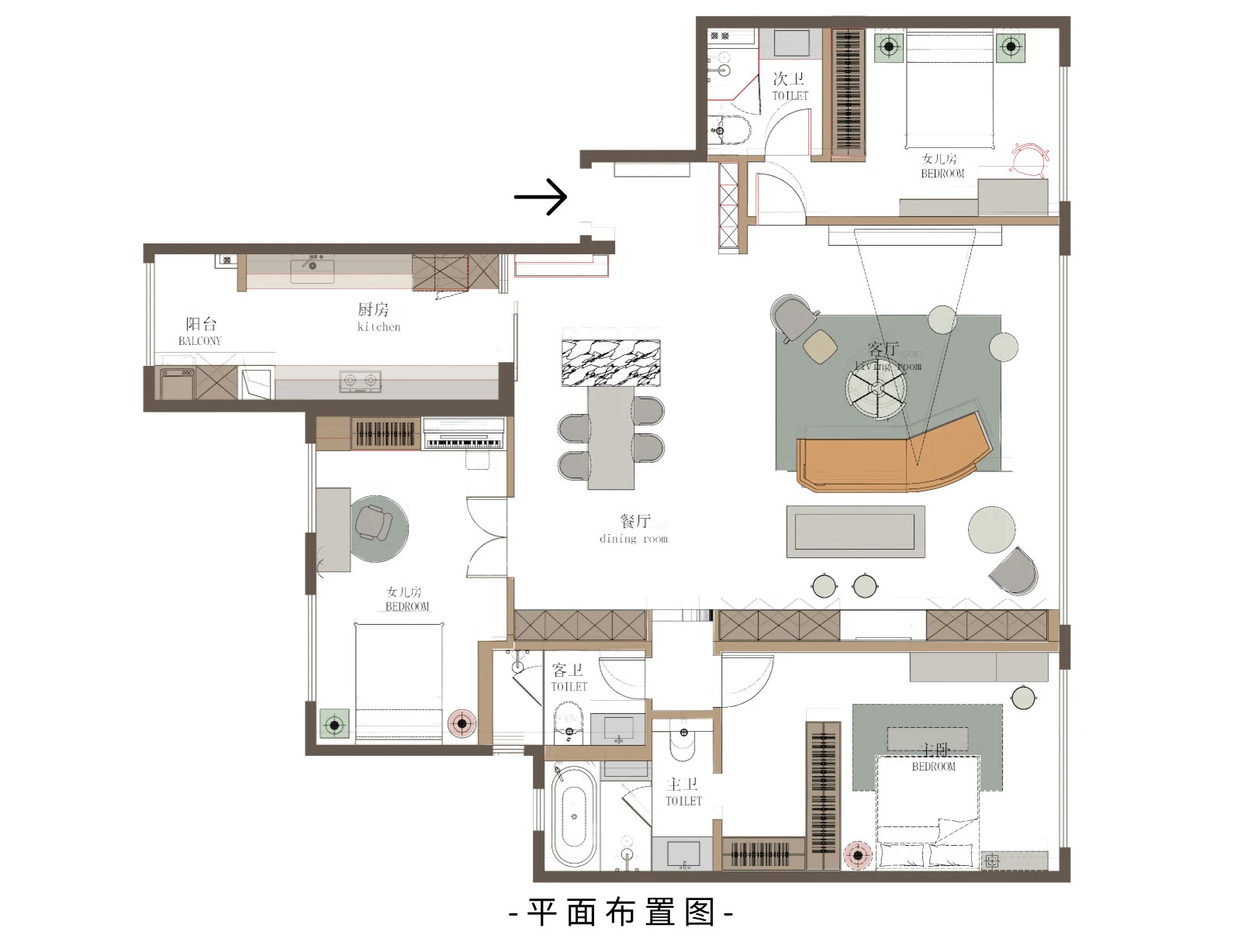 空间布局:客厅打造7米长收纳柜体;其次合并两个次卧改为双开门,满足儿童房多功能居住需求。