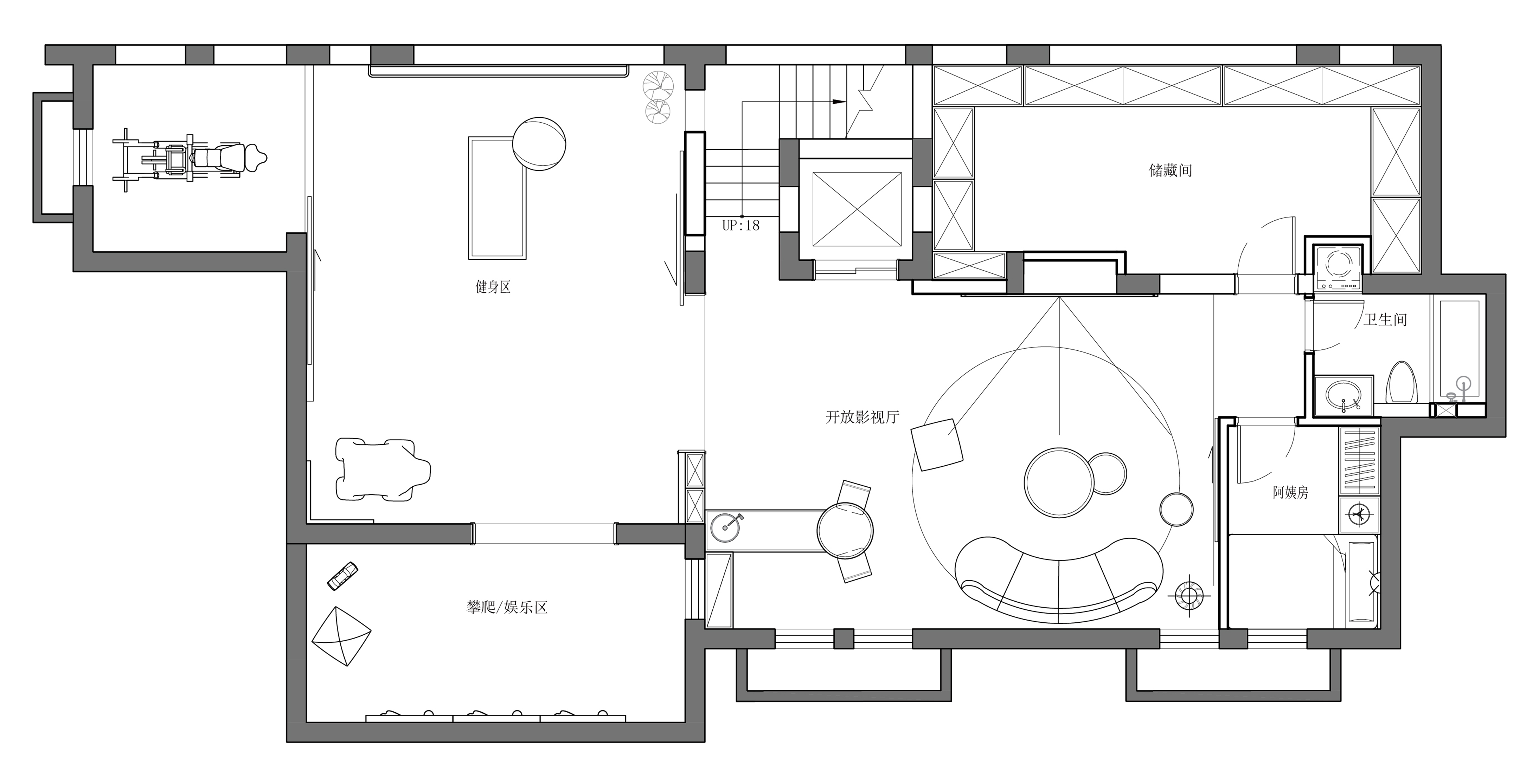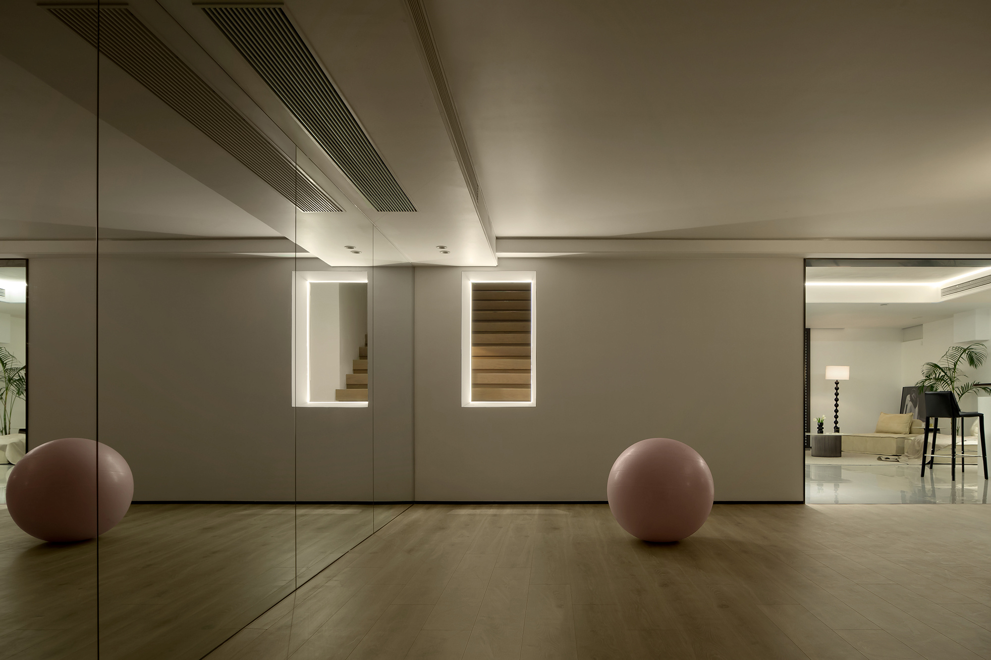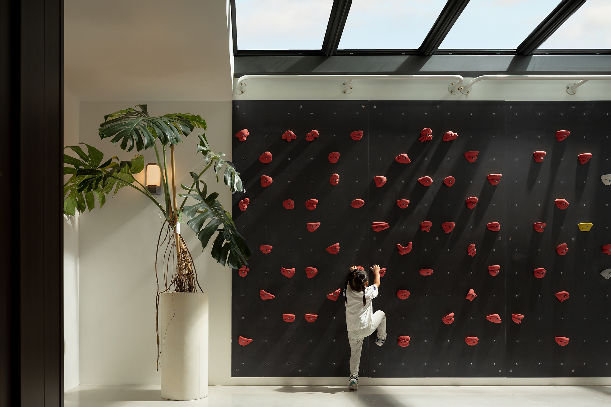 作为有娃家庭,家里两个宝宝的需求也是设计重点。地下一层原有的采光就比较暗,不适合隔开做功能分区,设计师将140平方米的地下室全部打通,作为宝宝们恣意奔跑的活动空间,大人们也可以在这里活动健身。天井还特别修筑了一面攀爬墙,给活泼好动的孩子们释放天性的“耗电”机会。