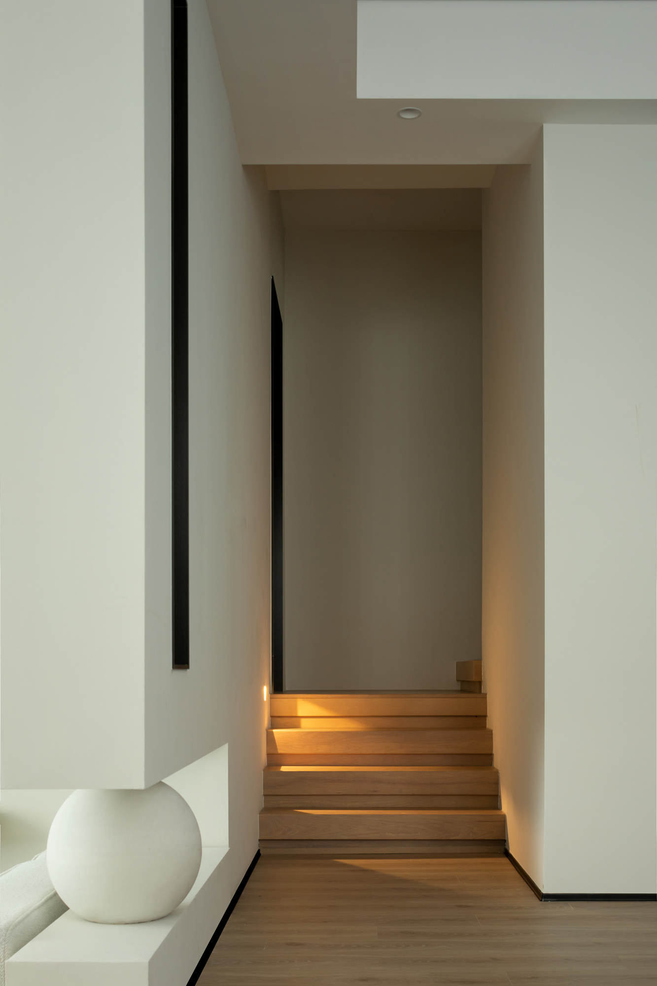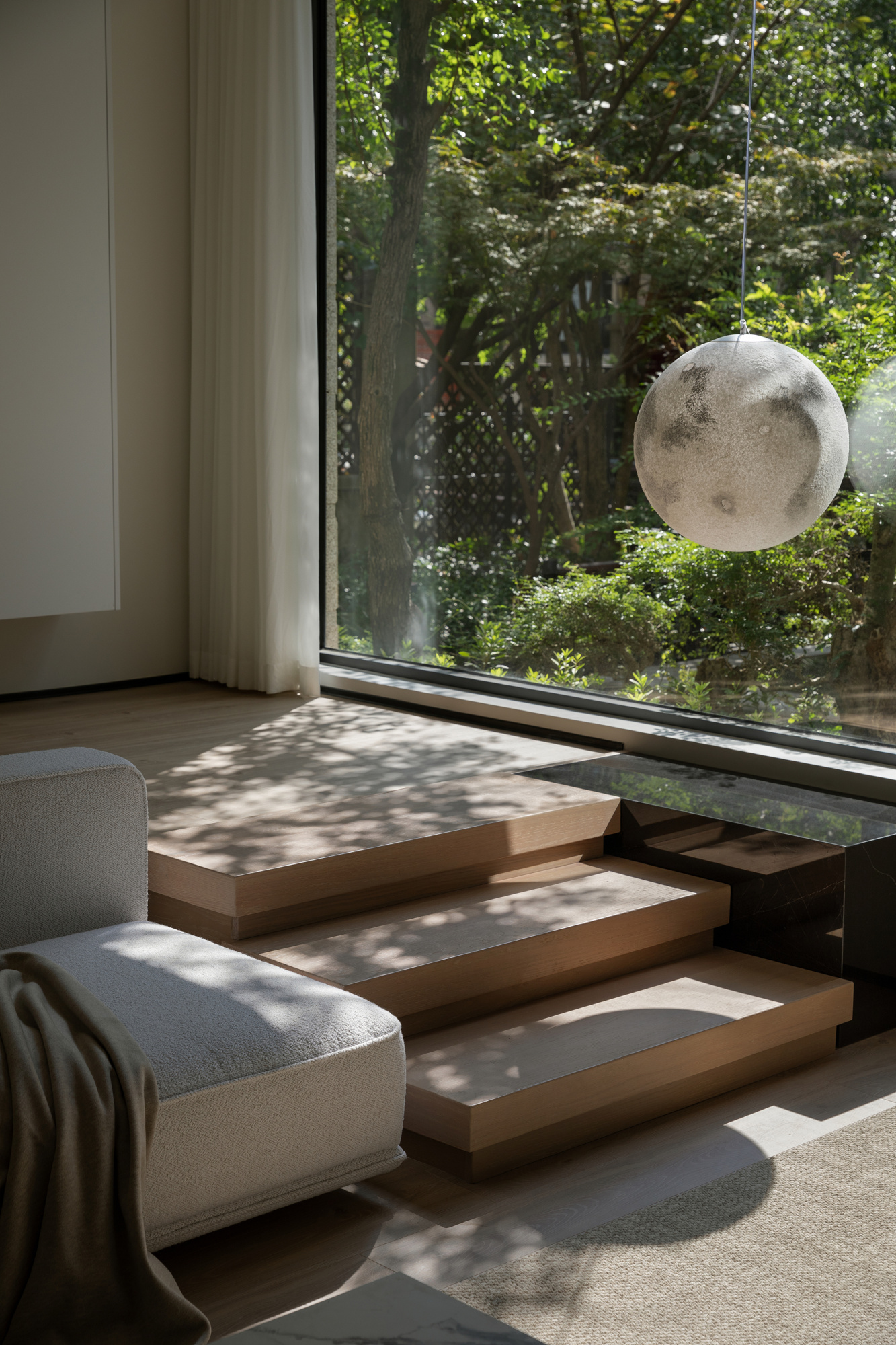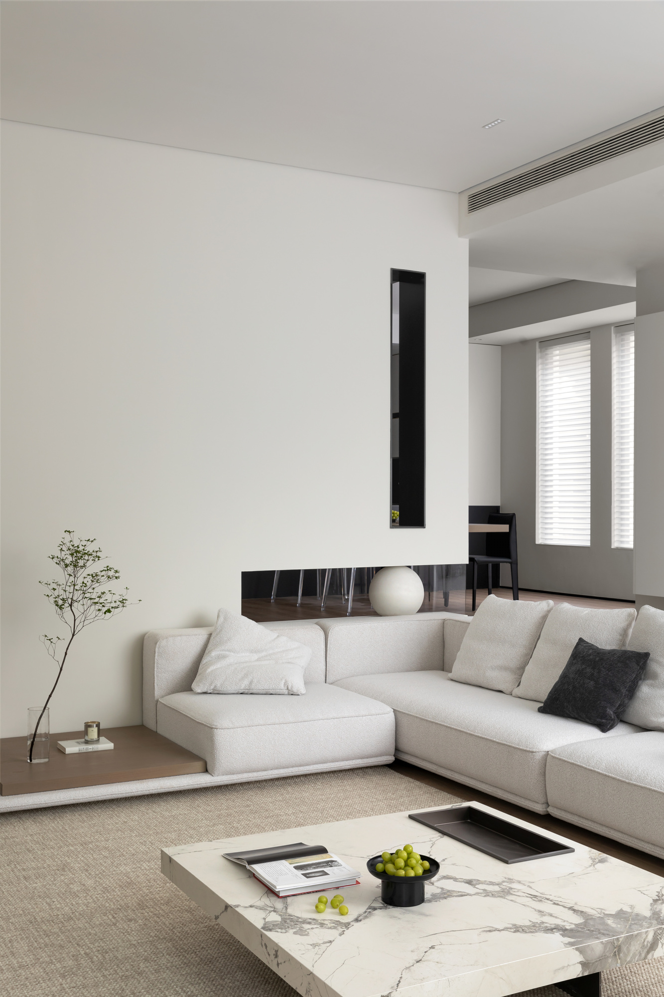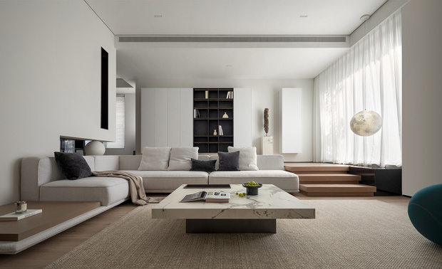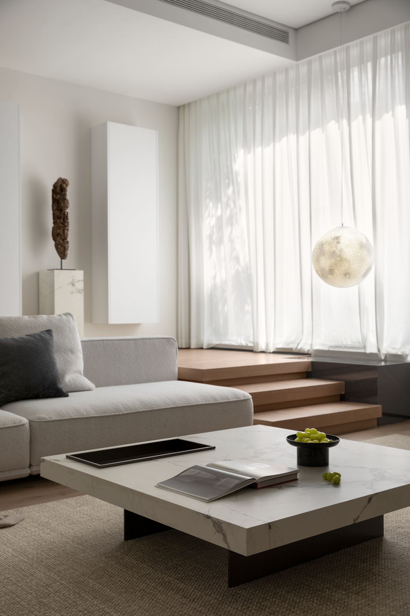 踏着三级木质台阶步入客厅,仪式感和归属感油然而生,令客厅这个强调交流属性的空间更具场景体验感。错落的高度差让素净的至简空间在视觉上更有层次感,避免平铺直叙的单调。