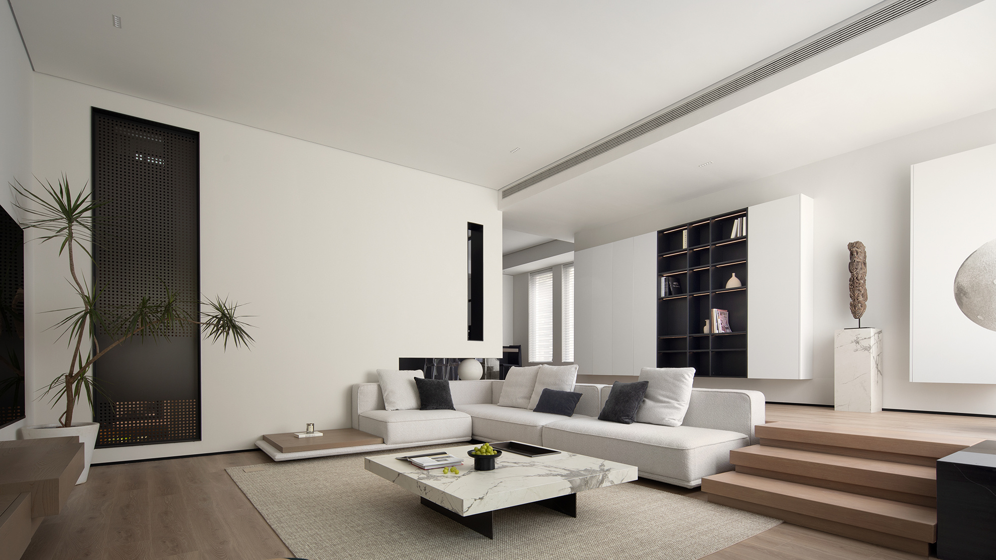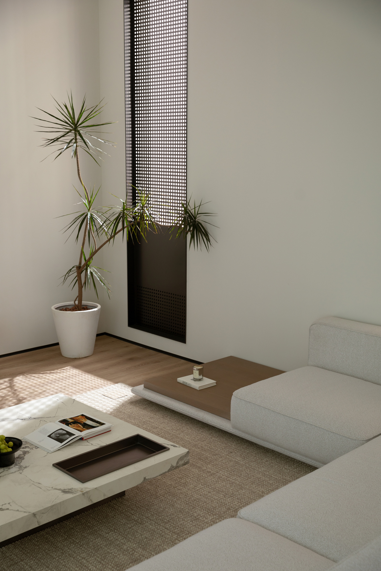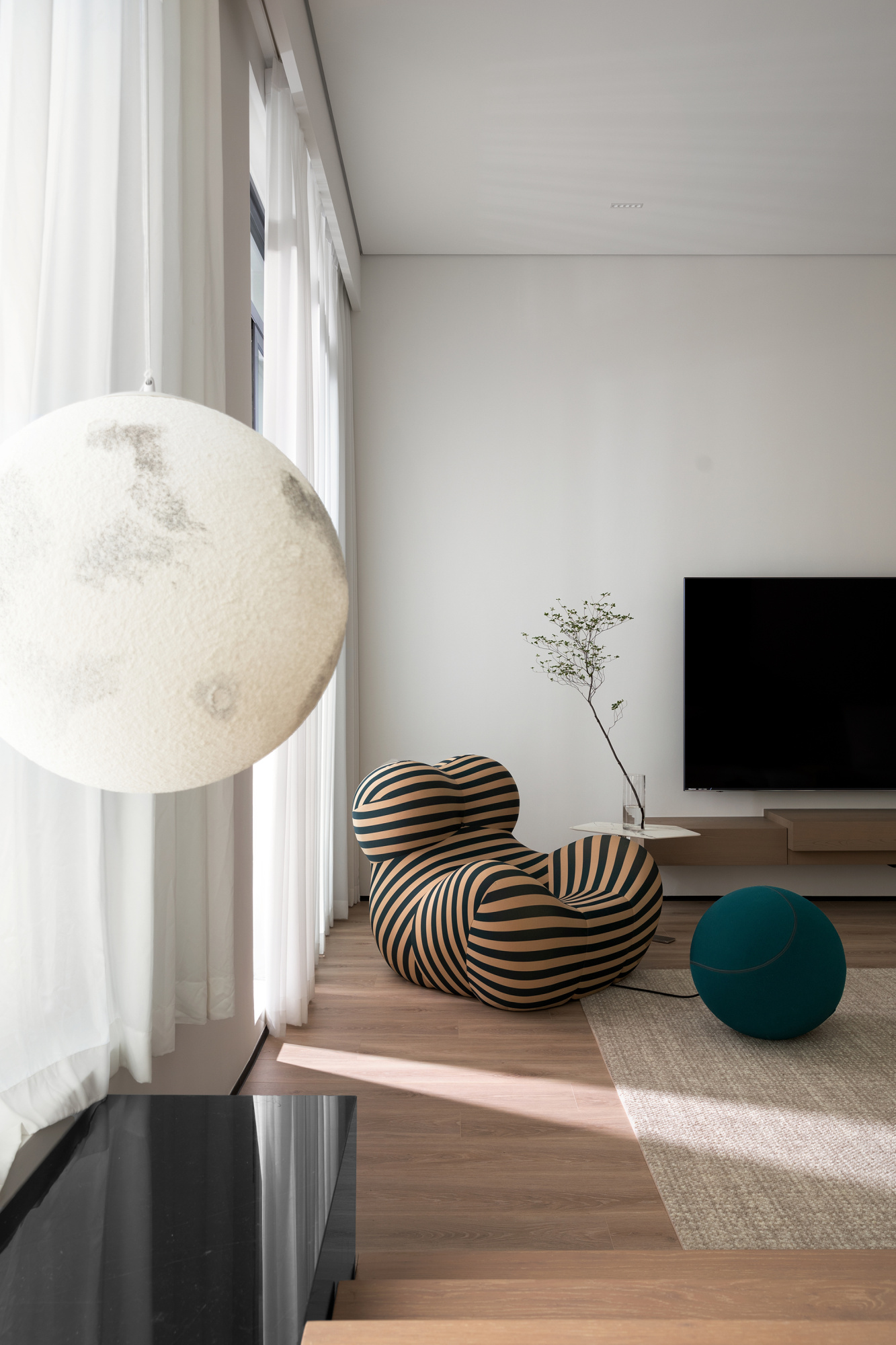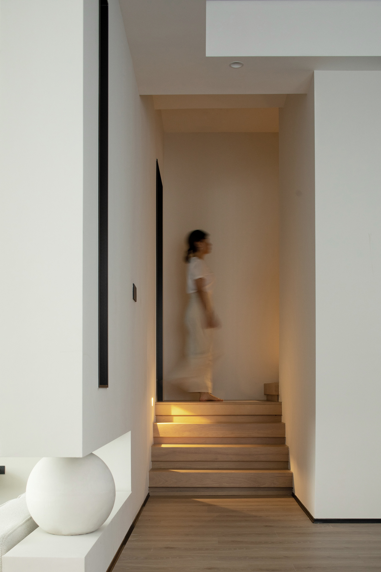 踏着三级木质台阶步入客厅,仪式感和归属感油然而生,令客厅这个强调交流属性的空间更具场景体验感。错落的高度差让素净的至简空间在视觉上更有层次感,避免平铺直叙的单调。