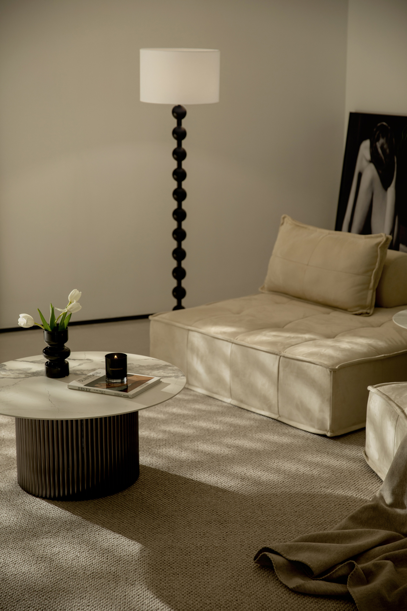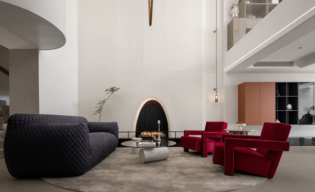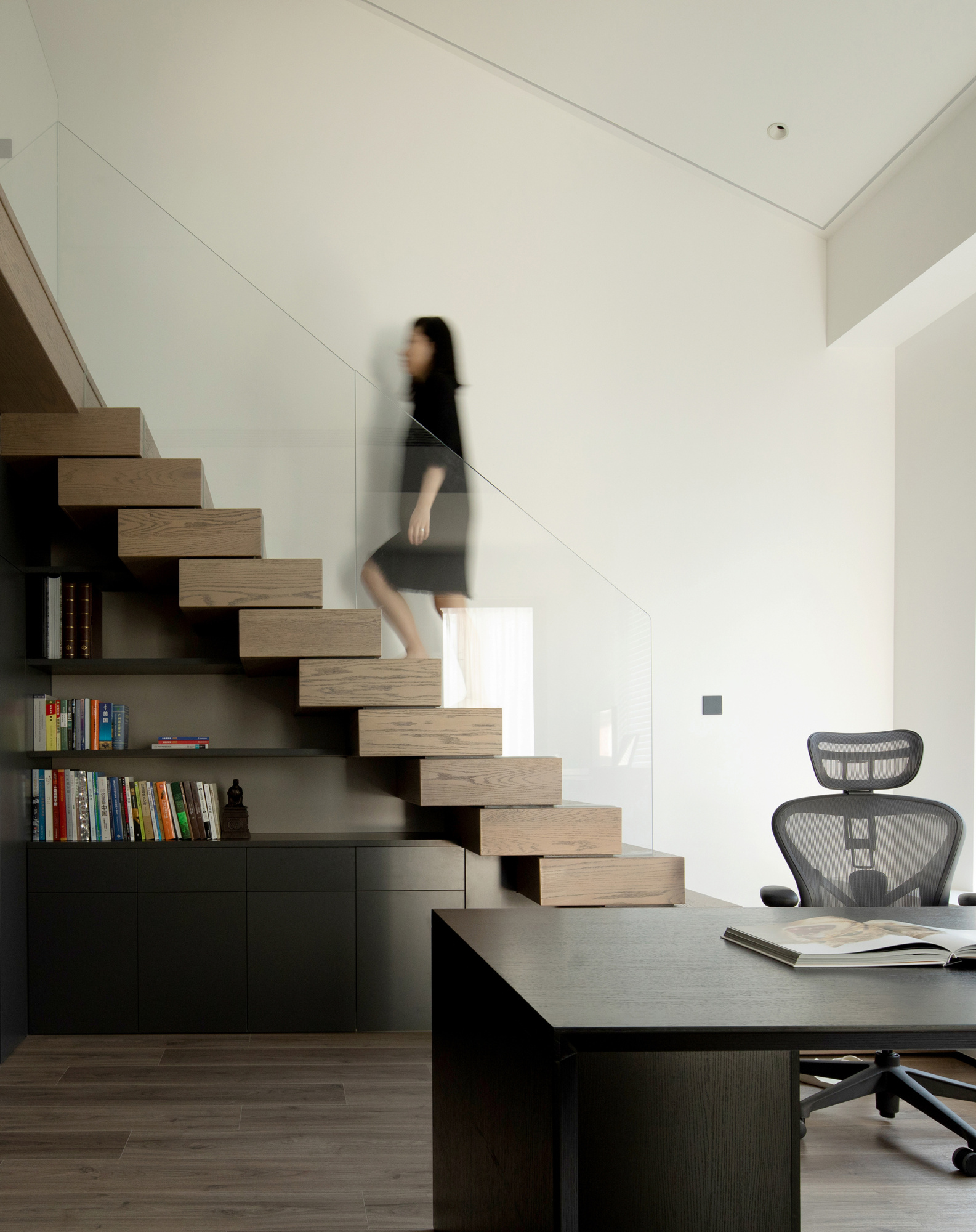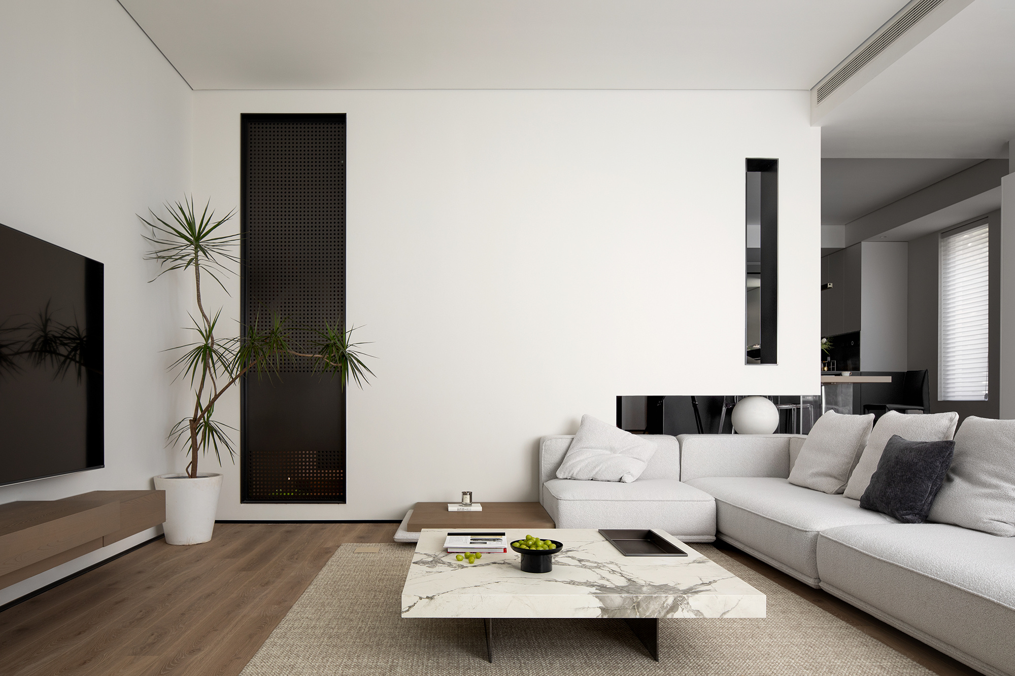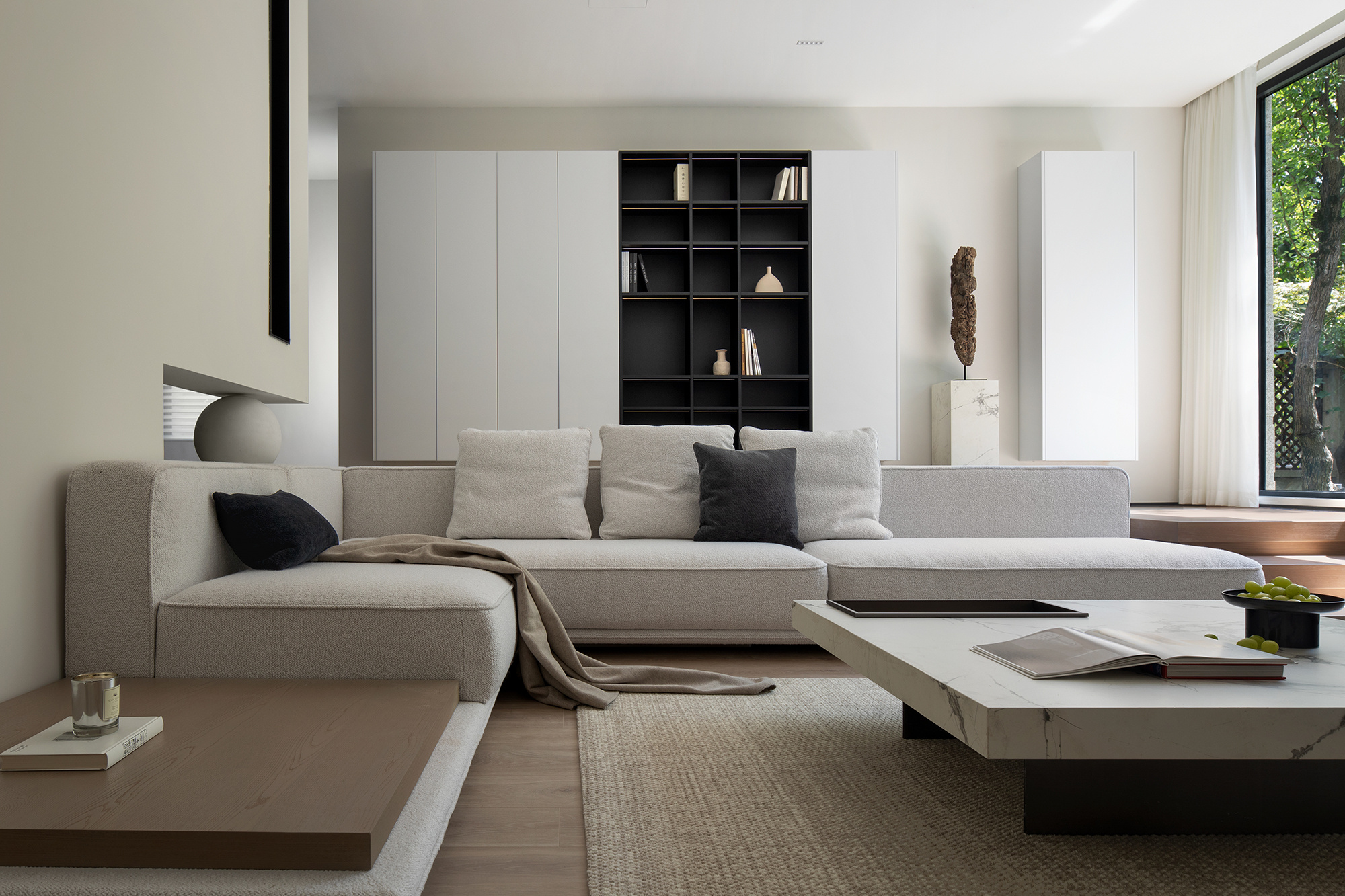 踏着三级木质台阶步入客厅,仪式感和归属感油然而生,令客厅这个强调交流属性的空间更具场景体验感。错落的高度差让素净的至简空间在视觉上更有层次感,避免平铺直叙的单调。