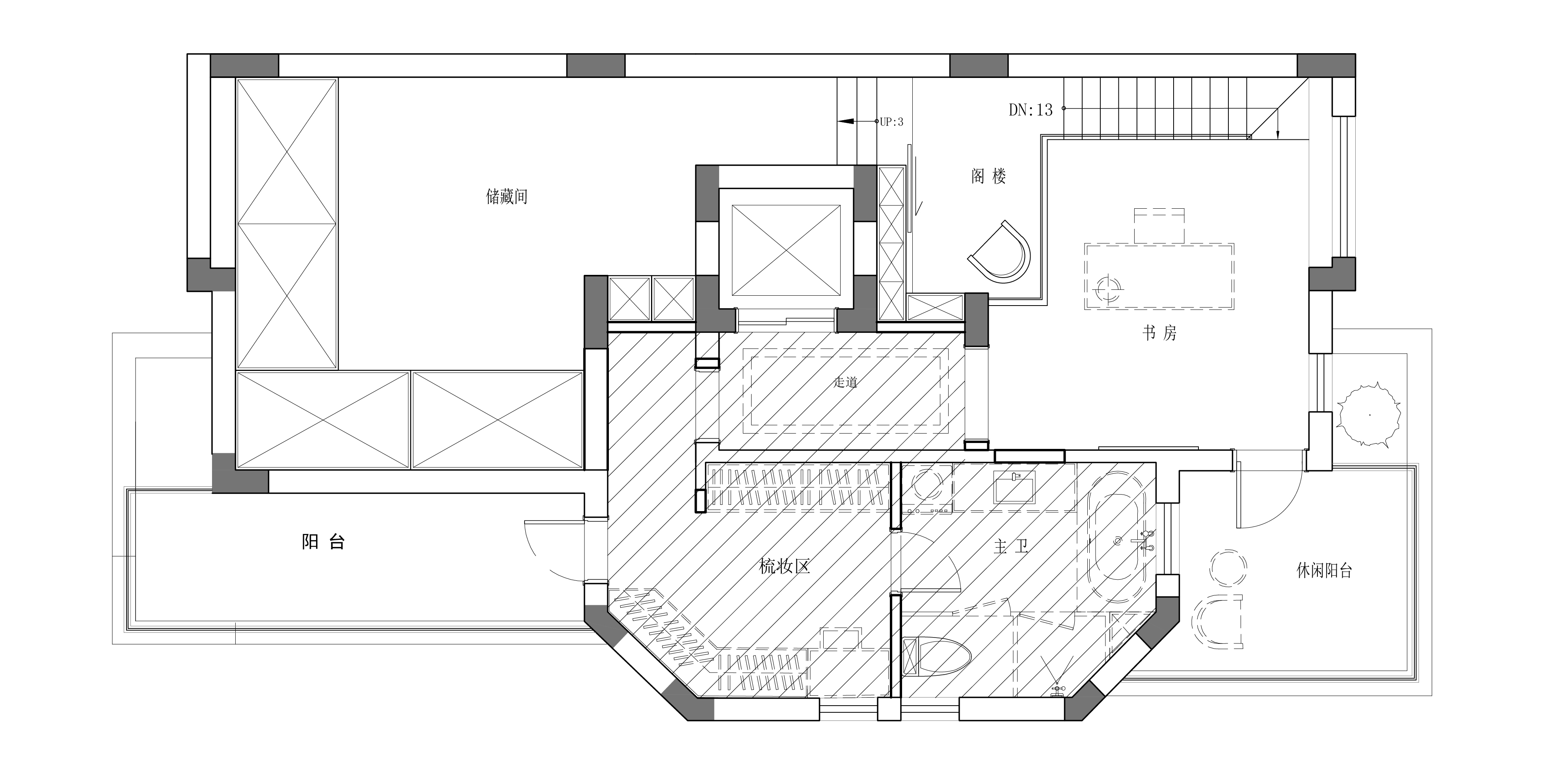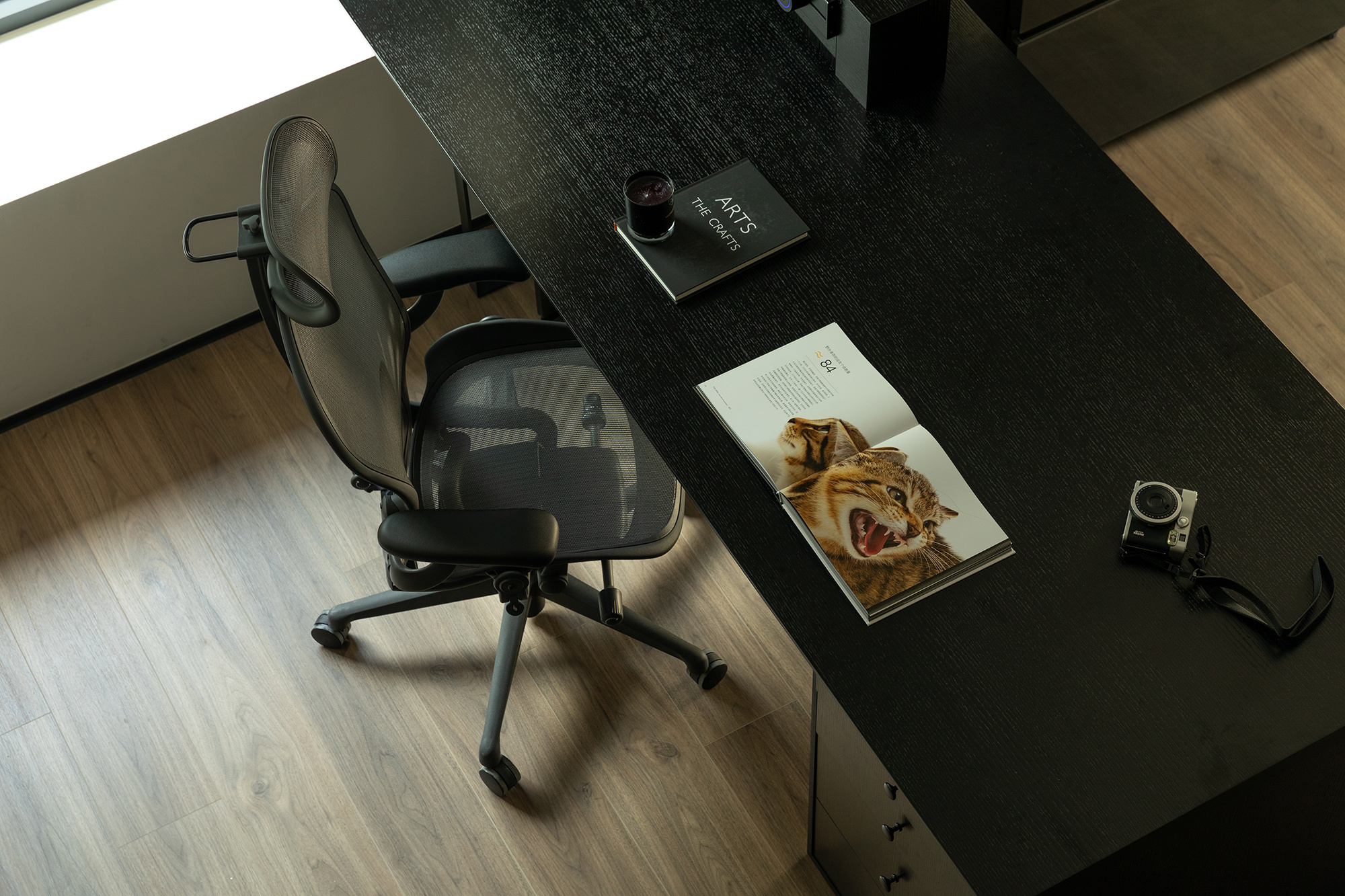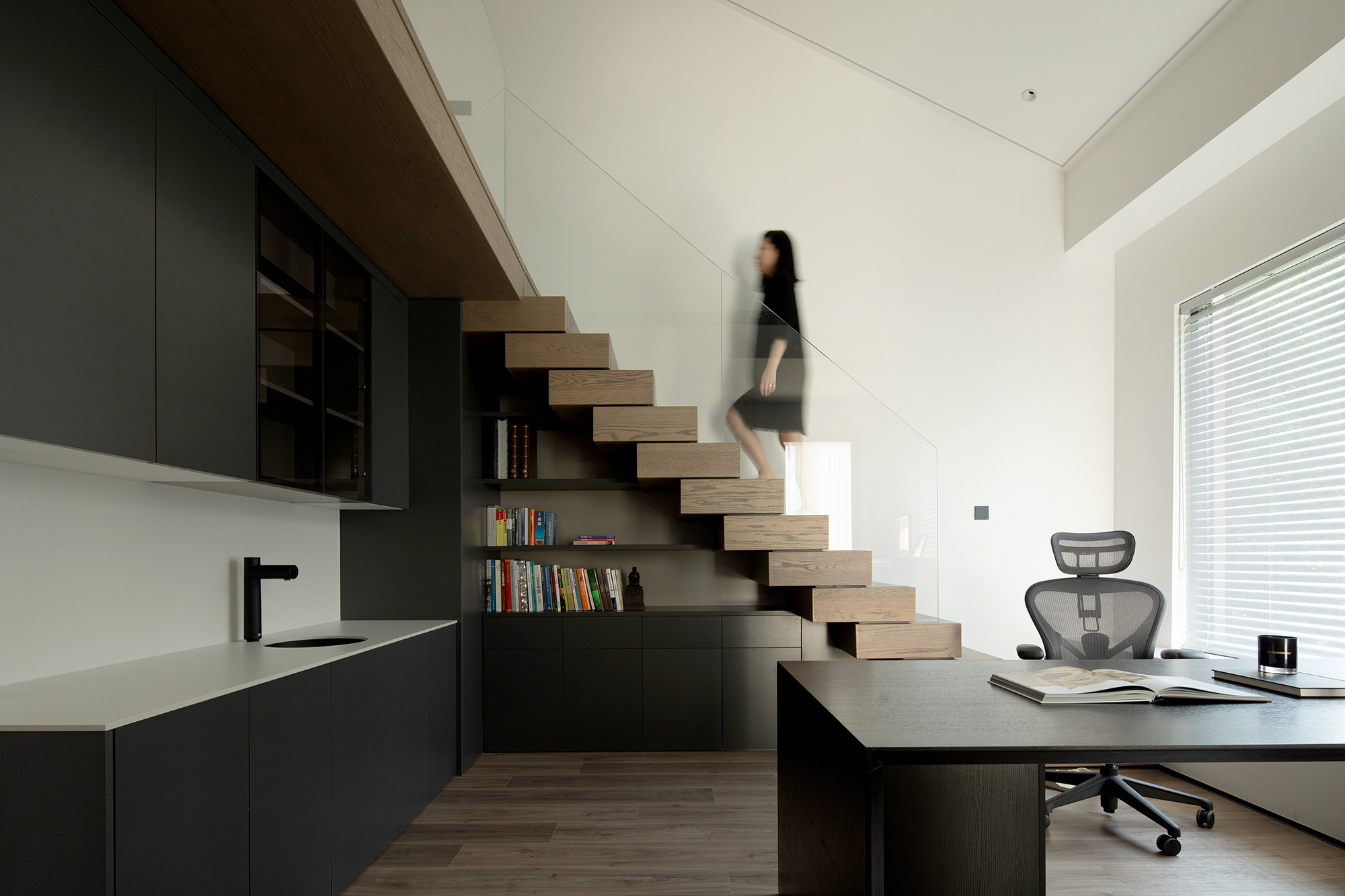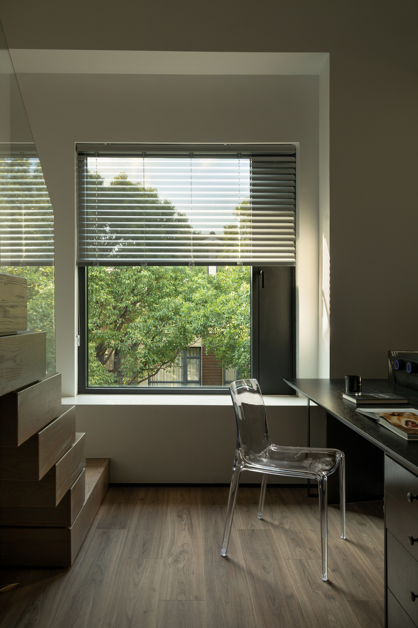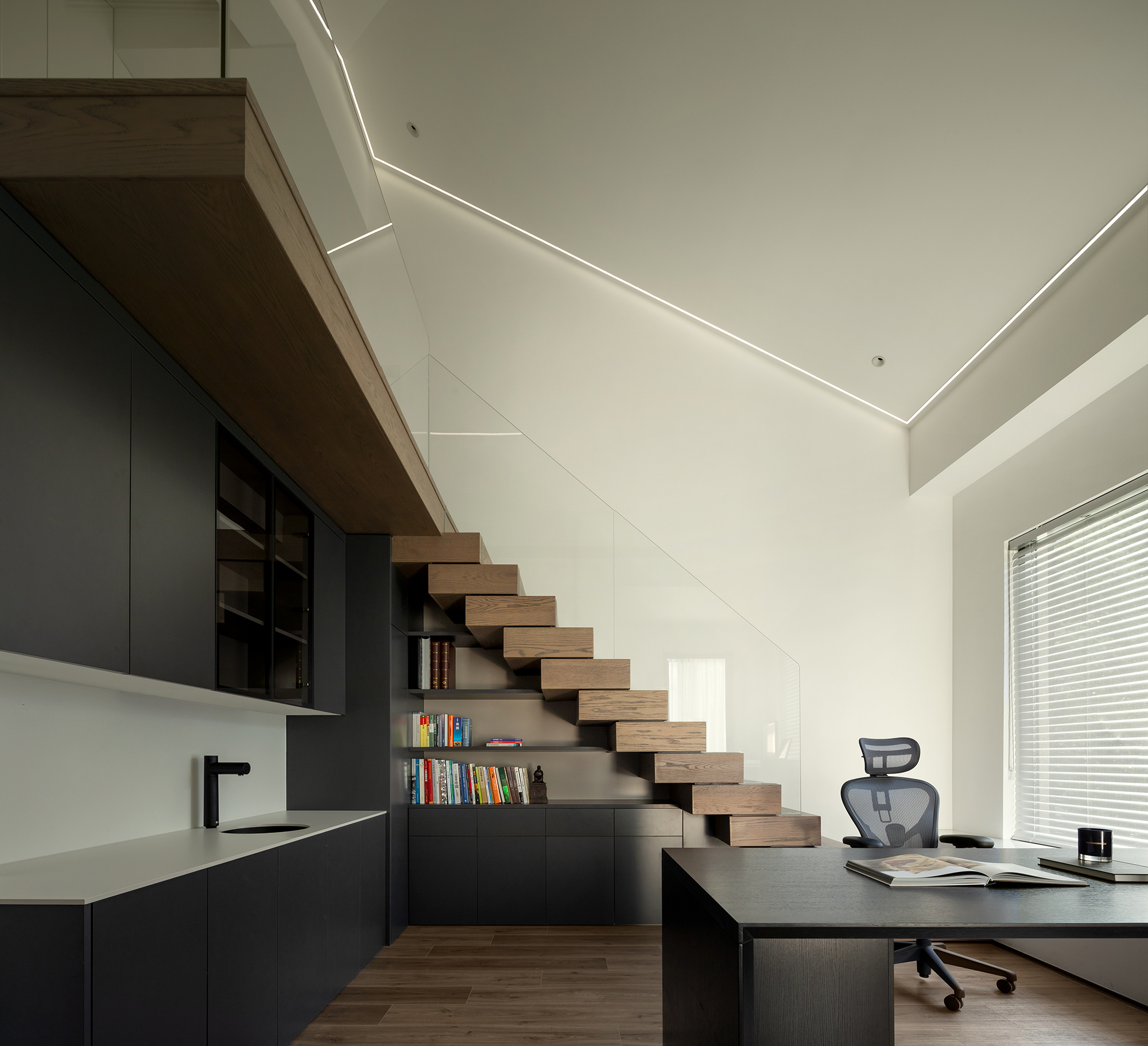 狄先生的精神角落是位于三楼的书房。设计师利用房屋原有的高度优势,通过楼梯连接阁楼,形成楼中楼式的Loft空间,释放了阁楼的收纳功能,也纵向拓展了书房的视觉空间。阁楼书房的体验更具艺术感和隐秘性,契合狄先生的需求。