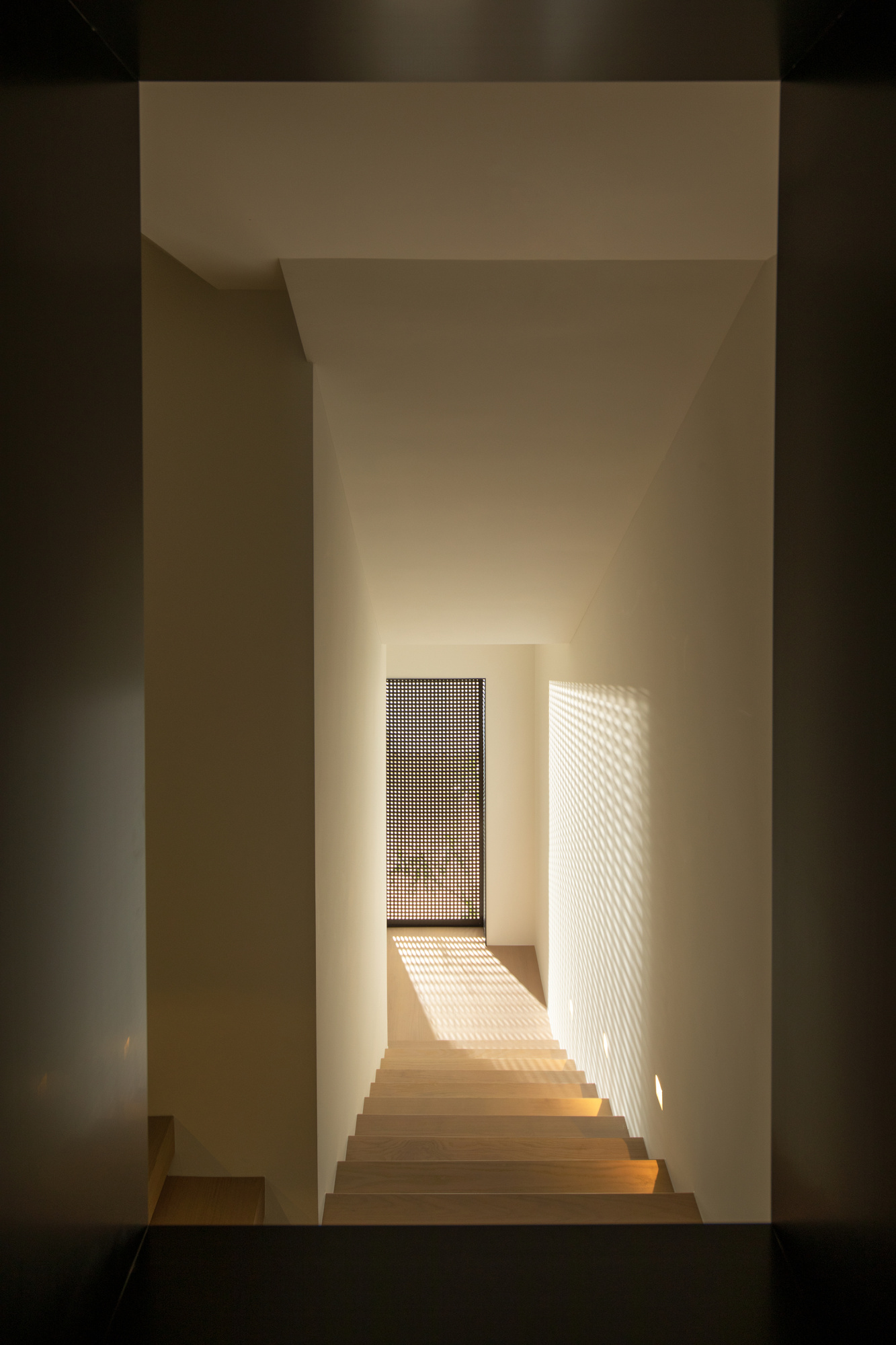 窗外的光影全凭自然的时节美景,而室内的光影考验设计的巧思。在客厅有一面长方形的金属镂空透光墙,原本只是想为楼道借光,然而当阳光透过金属圆孔洒向墙面时,金属的冷感与阳光的暖意、原木楼梯的温润相互交织,形成极富治愈感的视觉画面。