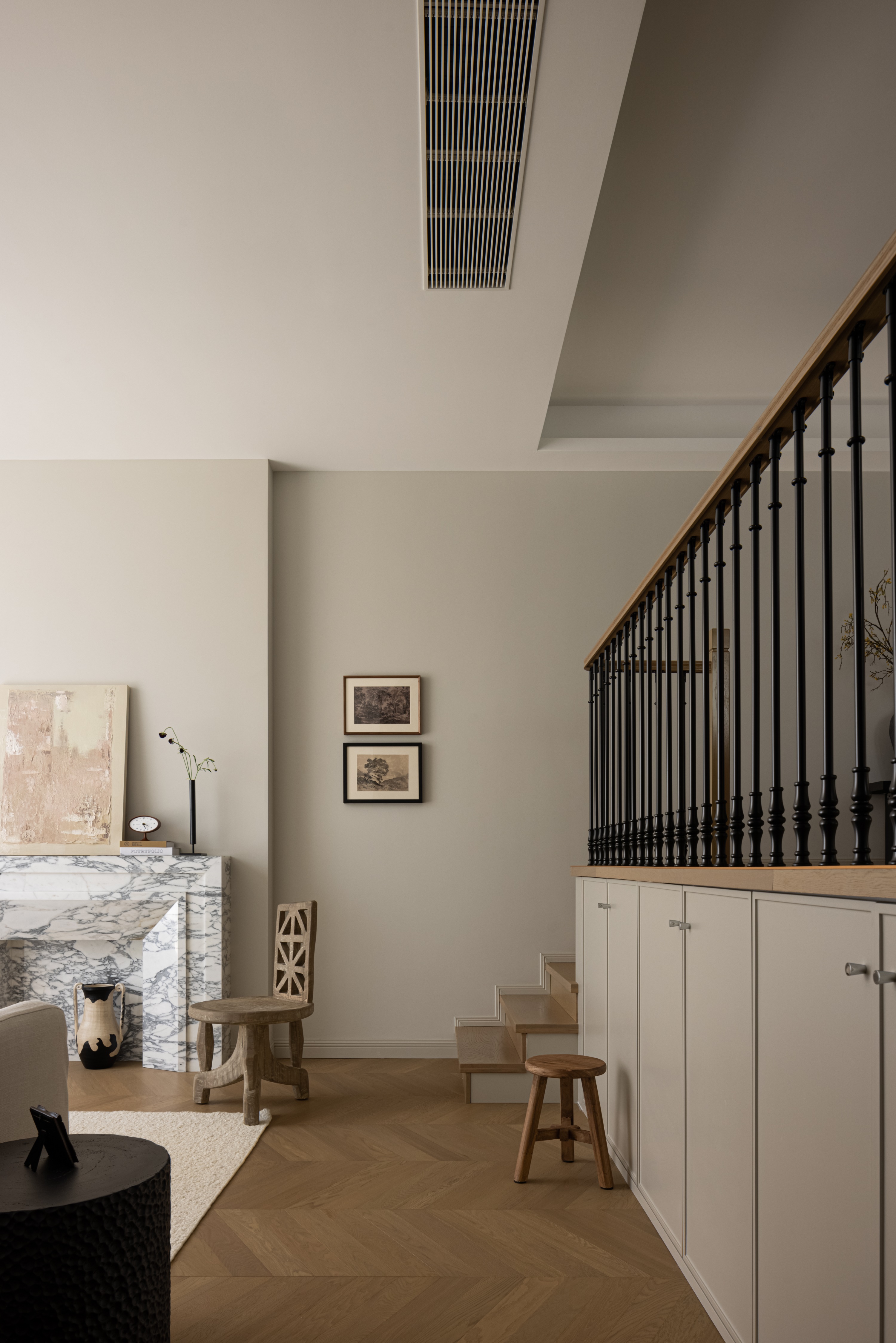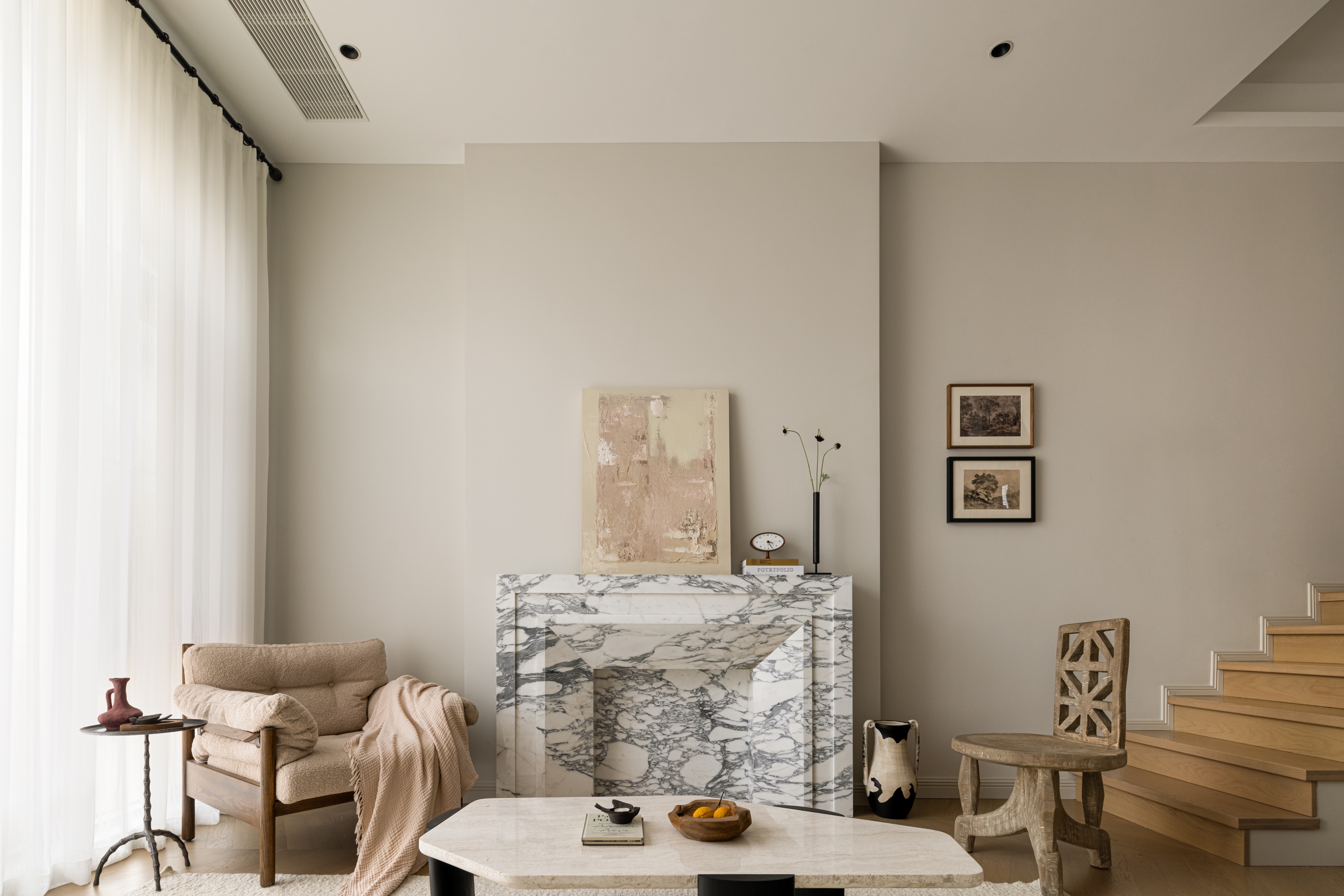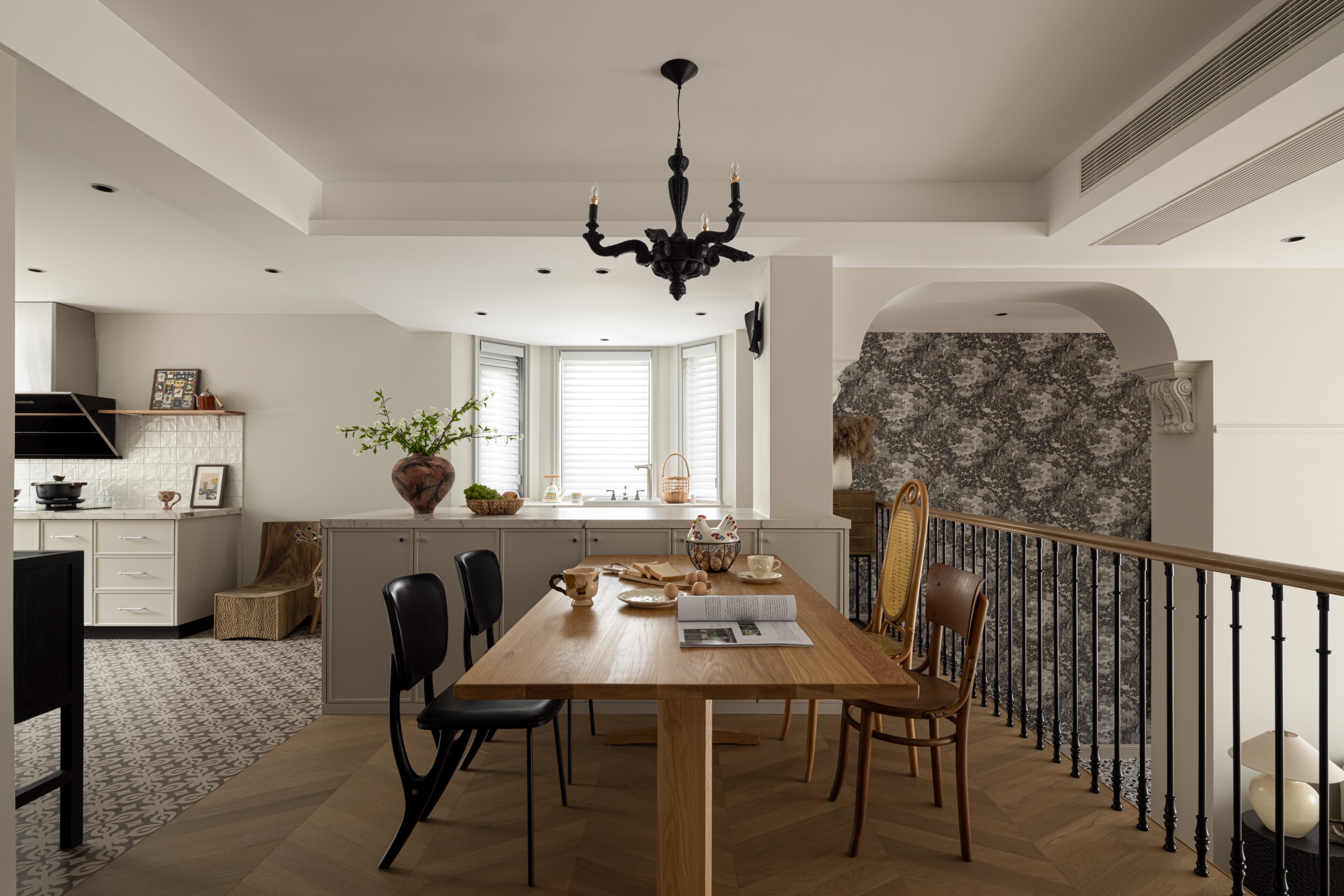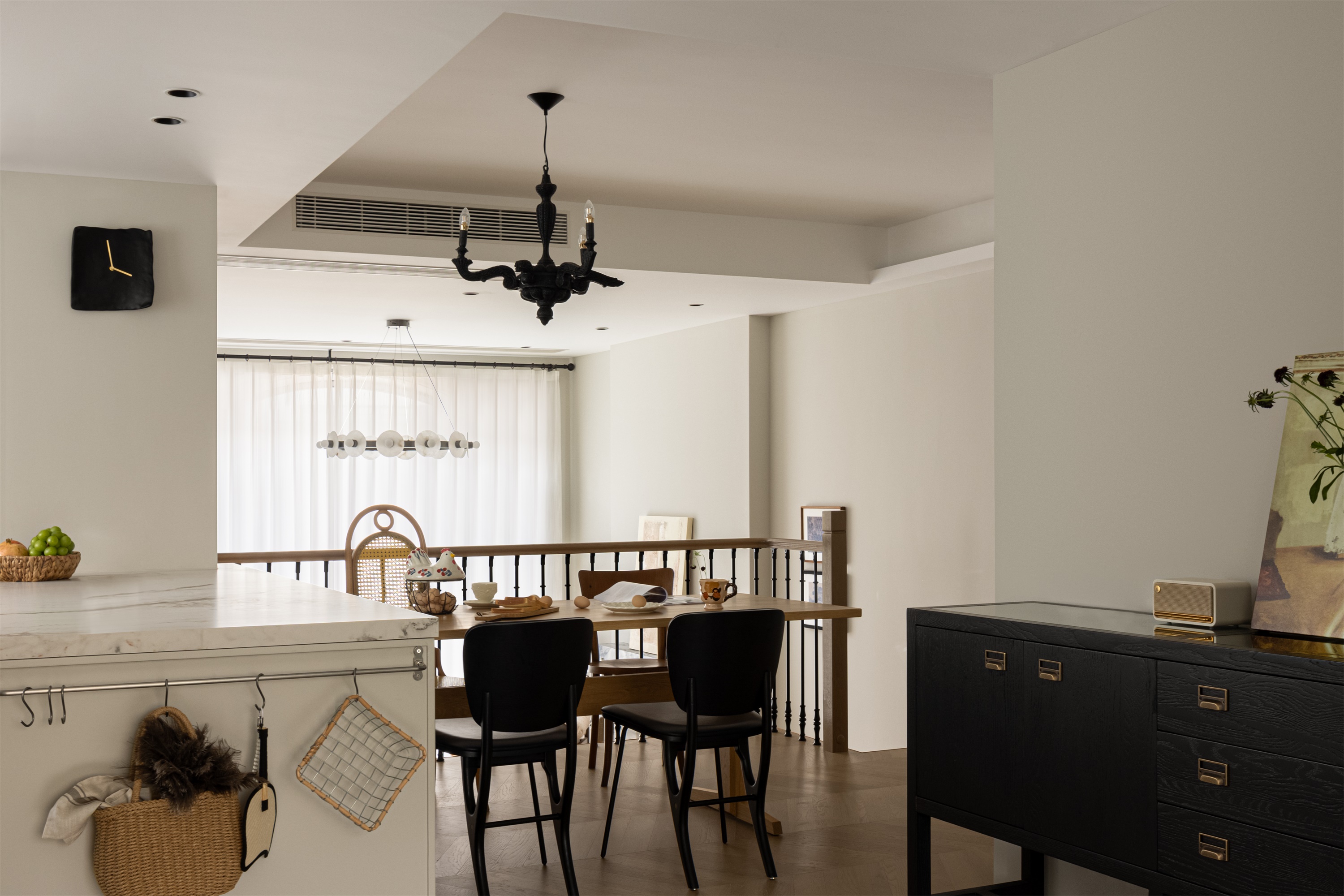 空间意境:作品在环境风格上的创新点在于其“度假”氛围的打造和自然元素的巧妙融合。设计师通过精心挑选的复古气质镂空栏杆、淘来的中古矮柜、手工实木单椅等家具,营造出一种田园风情的自然宁静感,符合“假期”主题。客餐厅区域没有电视,而是通过大理石壁炉、主人喜欢的艺术画作和精致的摆件,营造出一种放松且富有艺术氛围的空间。在材料上,棉麻、实木、大理石等天然纹理和材质的结合,不仅体现了环境的自然质感,也让空间更加和谐、温馨。此外,开放式厨房与餐厅区域通过三面开窗的设计,打破传统封闭的空间感,最大限度地引入自然光,让整个空间充满了轻松的度假感。