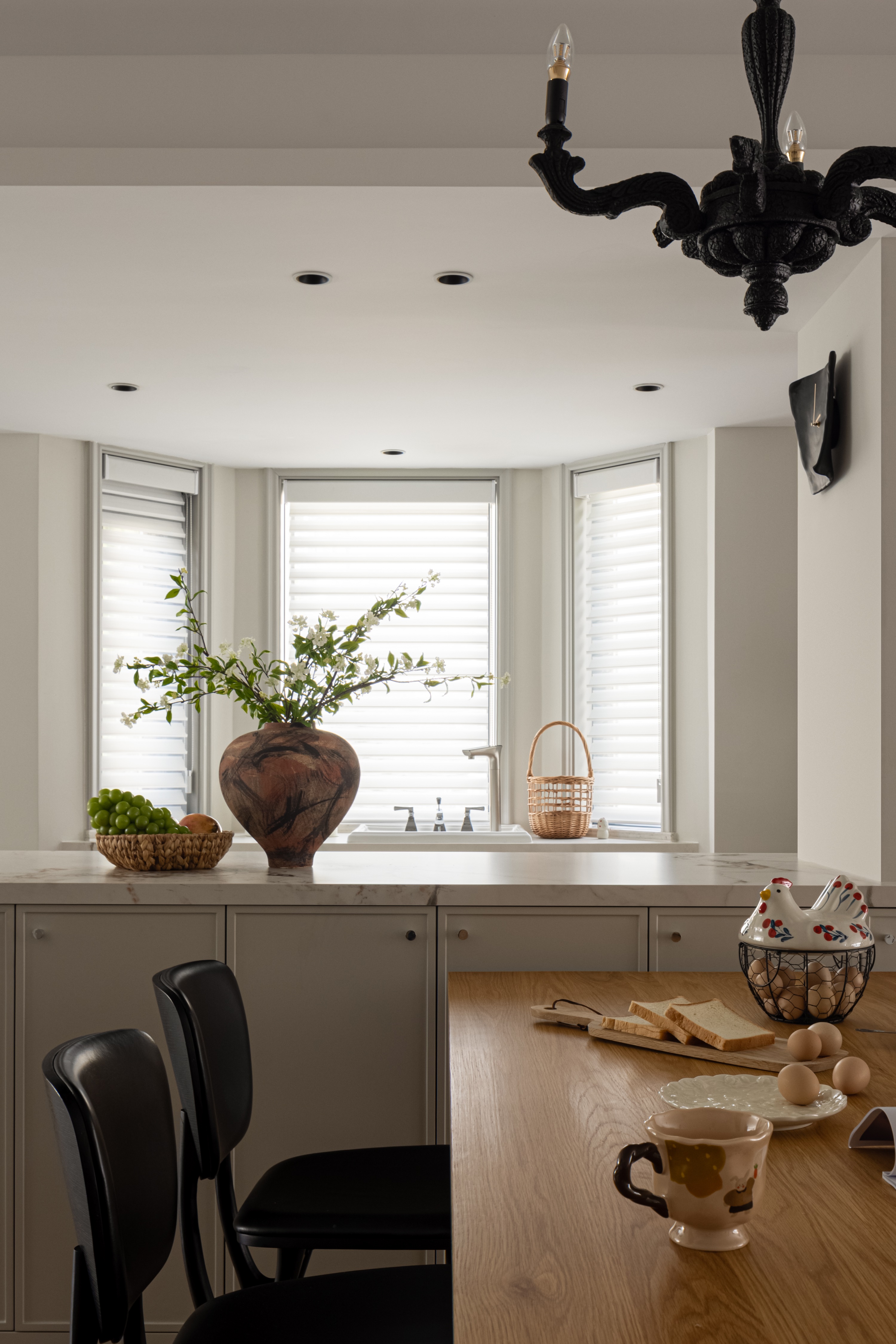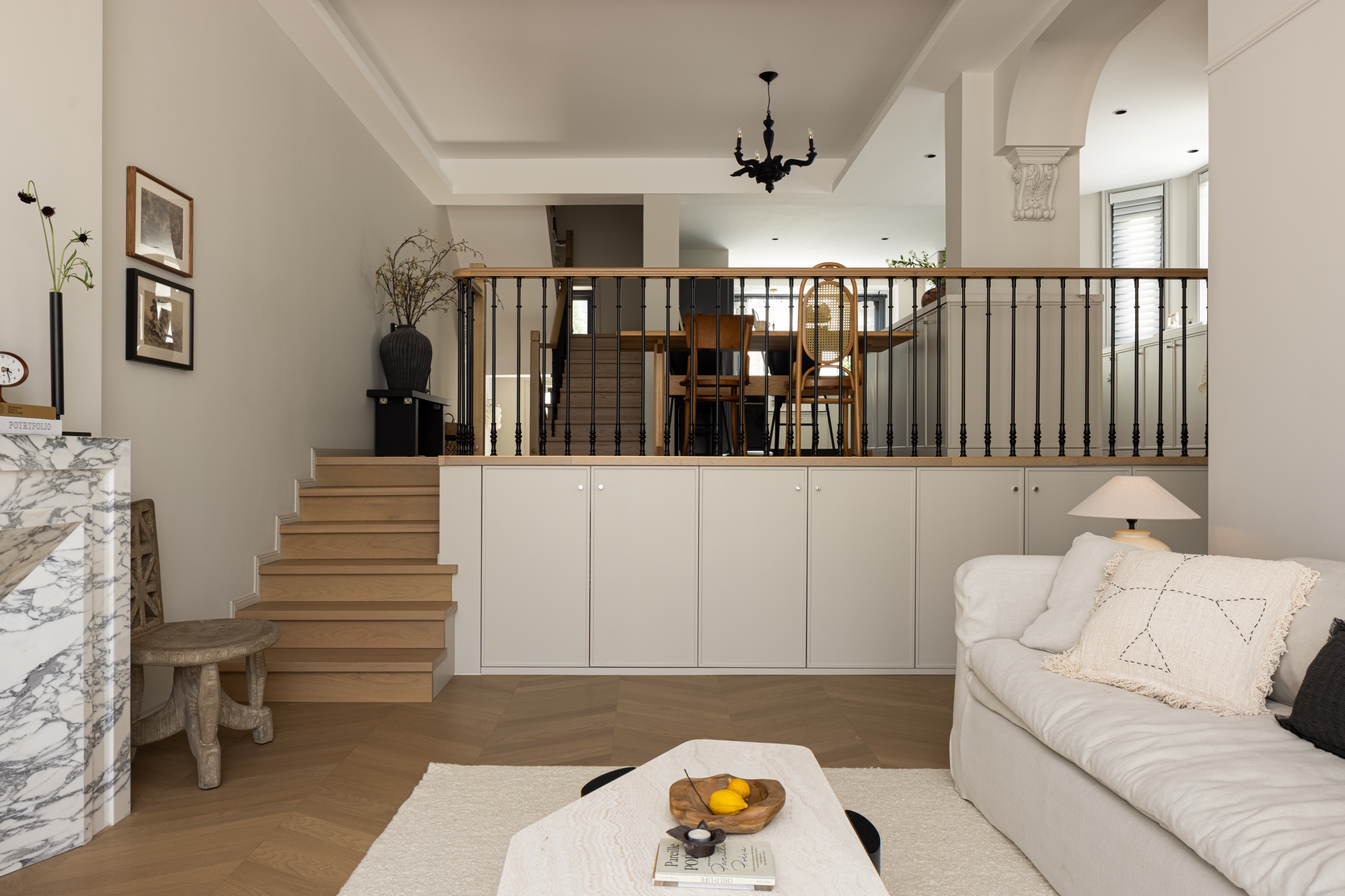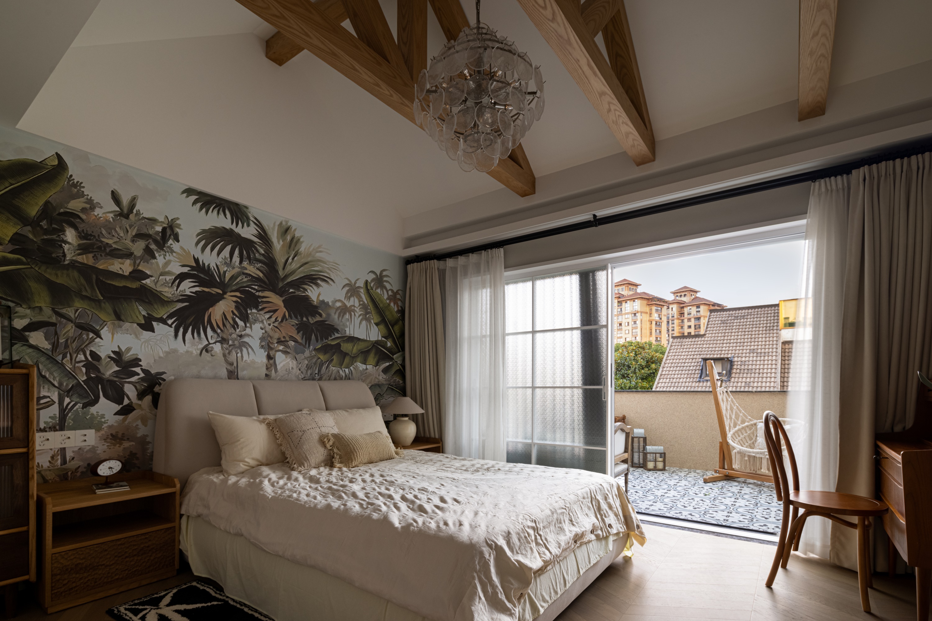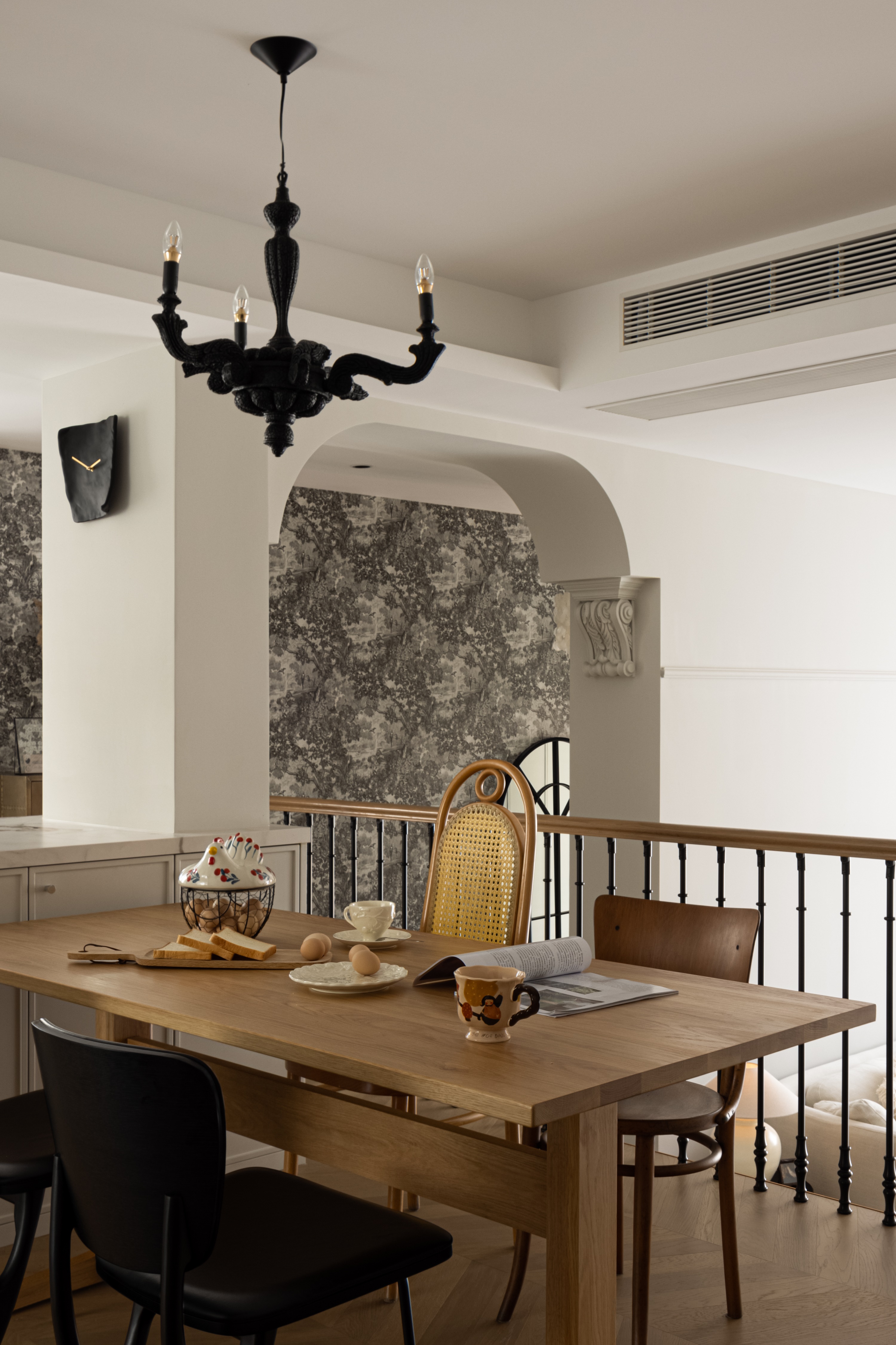 空间意境:作品在环境风格上的创新点在于其“度假”氛围的打造和自然元素的巧妙融合。设计师通过精心挑选的复古气质镂空栏杆、淘来的中古矮柜、手工实木单椅等家具,营造出一种田园风情的自然宁静感,符合“假期”主题。客餐厅区域没有电视,而是通过大理石壁炉、主人喜欢的艺术画作和精致的摆件,营造出一种放松且富有艺术氛围的空间。在材料上,棉麻、实木、大理石等天然纹理和材质的结合,不仅体现了环境的自然质感,也让空间更加和谐、温馨。此外,开放式厨房与餐厅区域通过三面开窗的设计,打破传统封闭的空间感,最大限度地引入自然光,让整个空间充满了轻松的度假感。