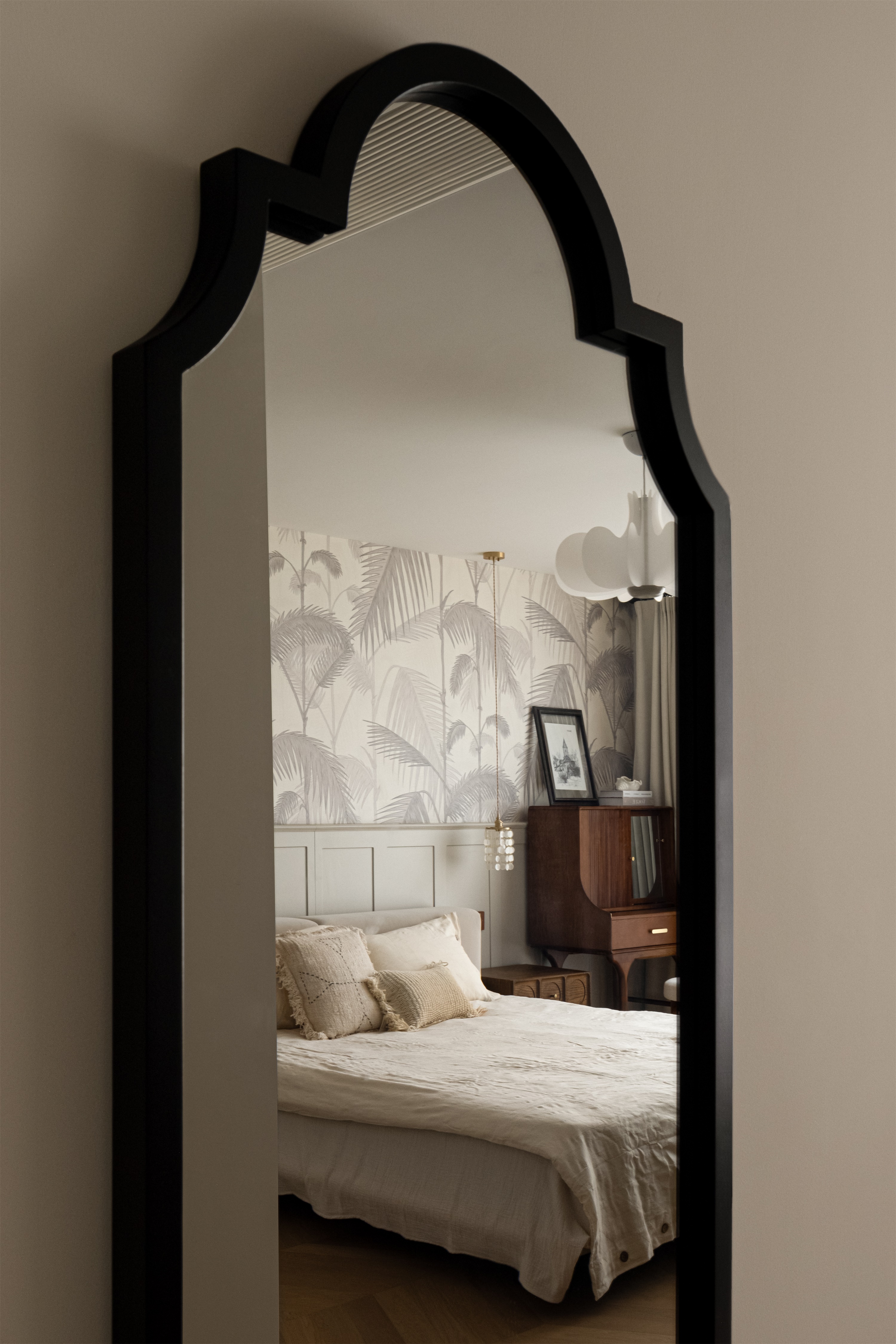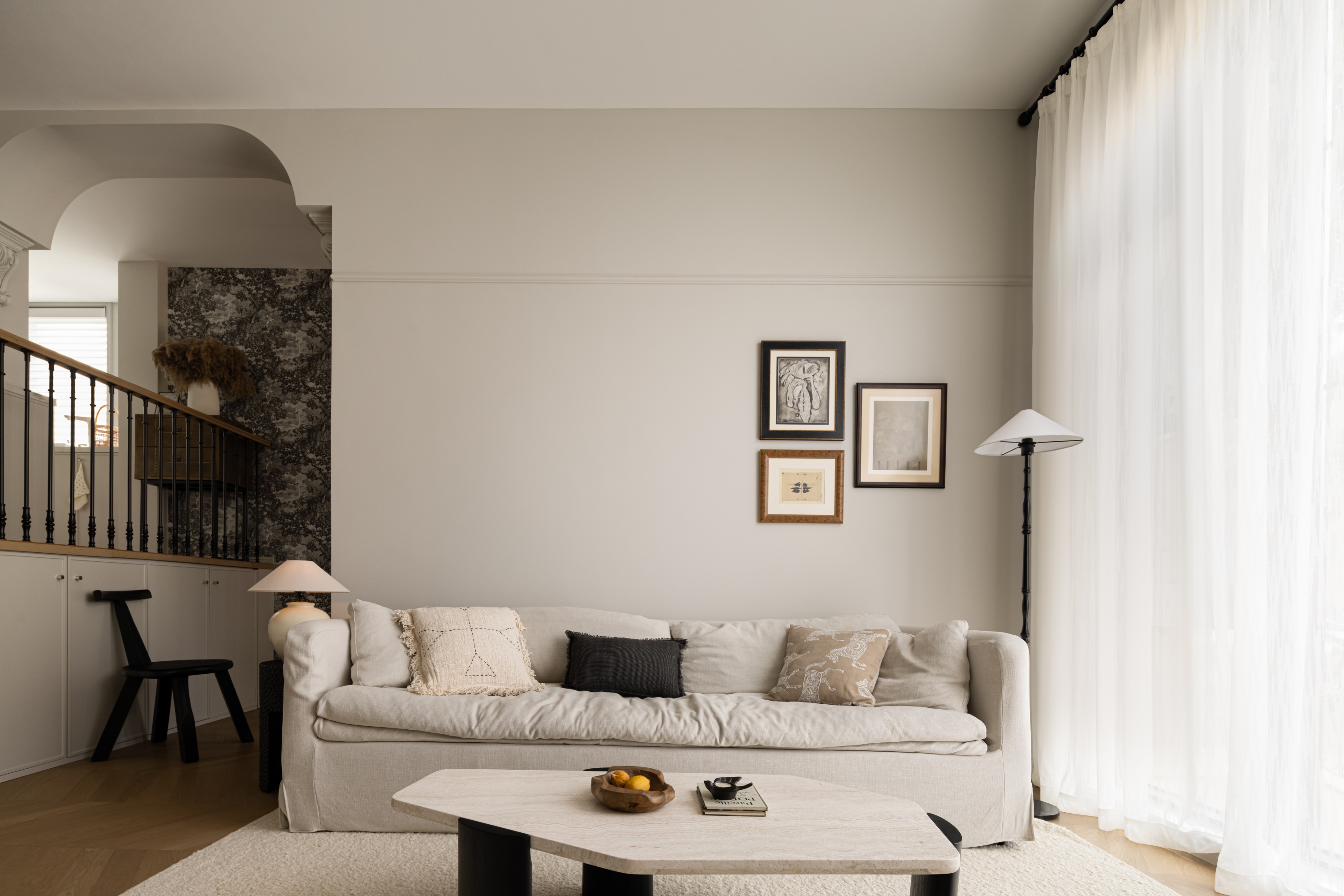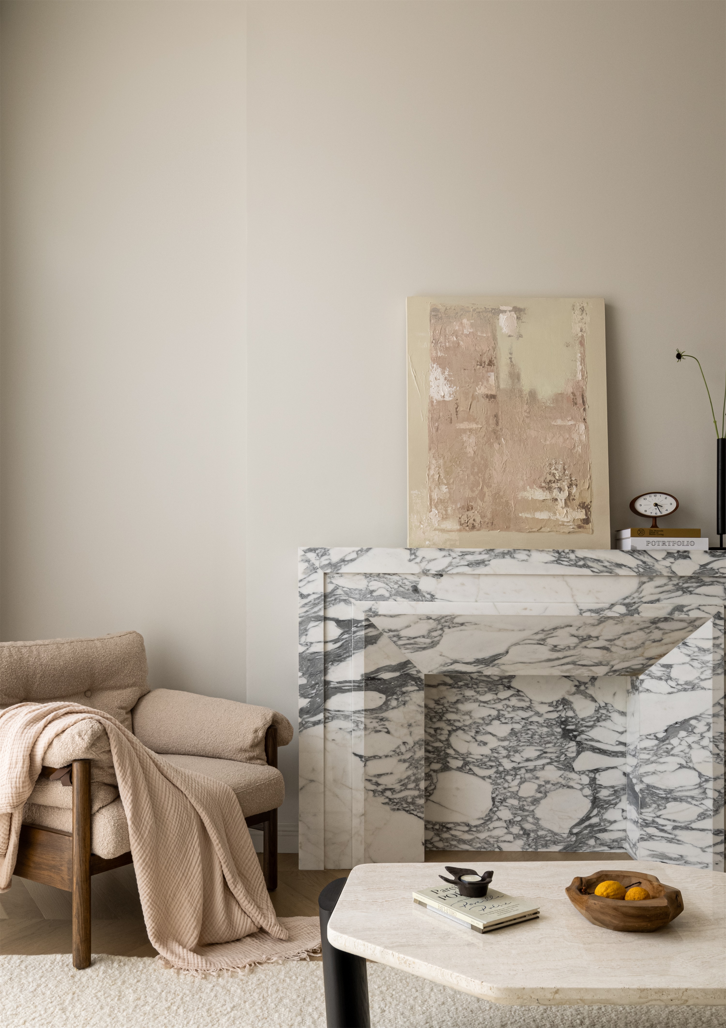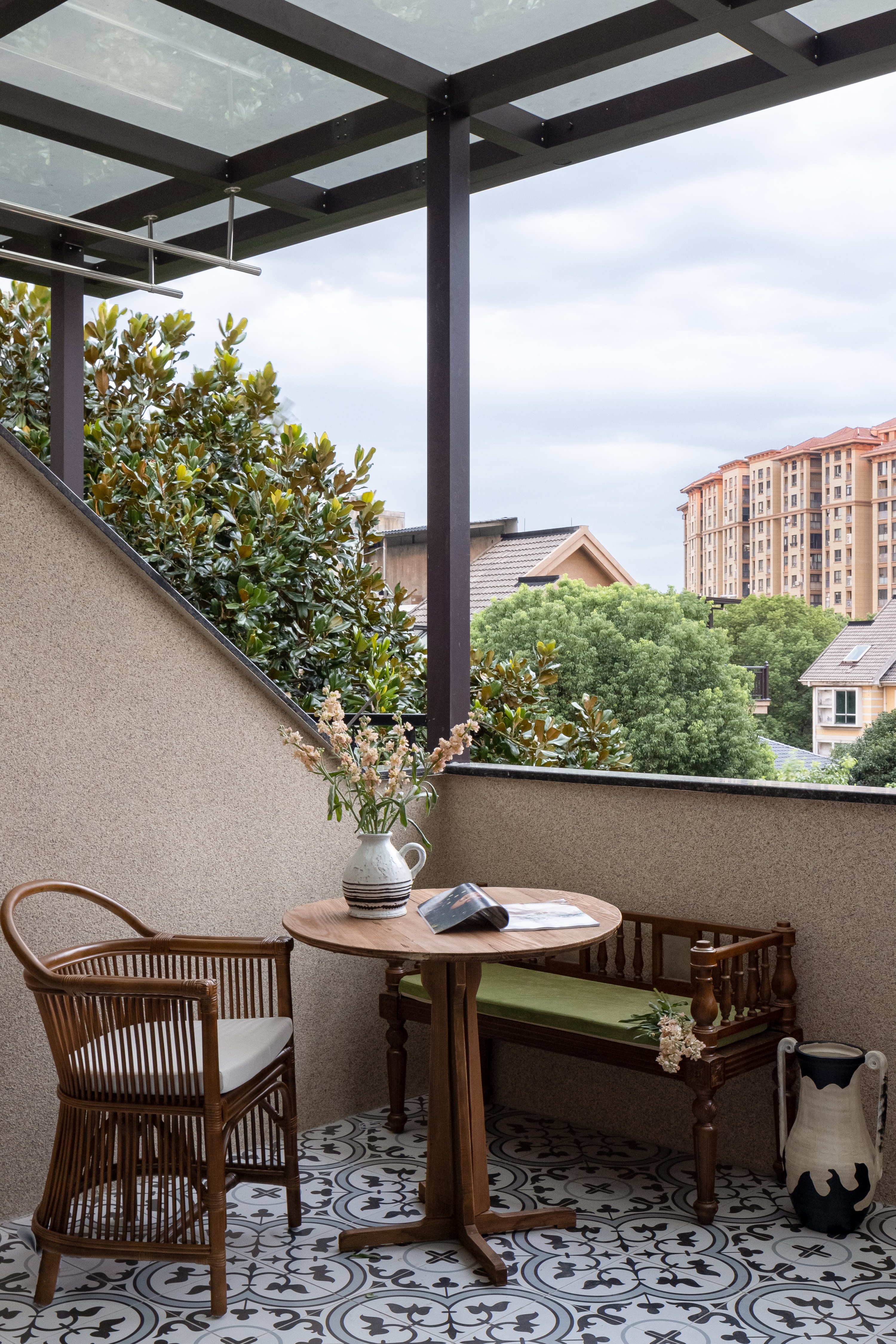 空间意境:作品在环境风格上的创新点在于其“度假”氛围的打造和自然元素的巧妙融合。设计师通过精心挑选的复古气质镂空栏杆、淘来的中古矮柜、手工实木单椅等家具,营造出一种田园风情的自然宁静感,符合“假期”主题。客餐厅区域没有电视,而是通过大理石壁炉、主人喜欢的艺术画作和精致的摆件,营造出一种放松且富有艺术氛围的空间。在材料上,棉麻、实木、大理石等天然纹理和材质的结合,不仅体现了环境的自然质感,也让空间更加和谐、温馨。此外,开放式厨房与餐厅区域通过三面开窗的设计,打破传统封闭的空间感,最大限度地引入自然光,让整个空间充满了轻松的度假感。