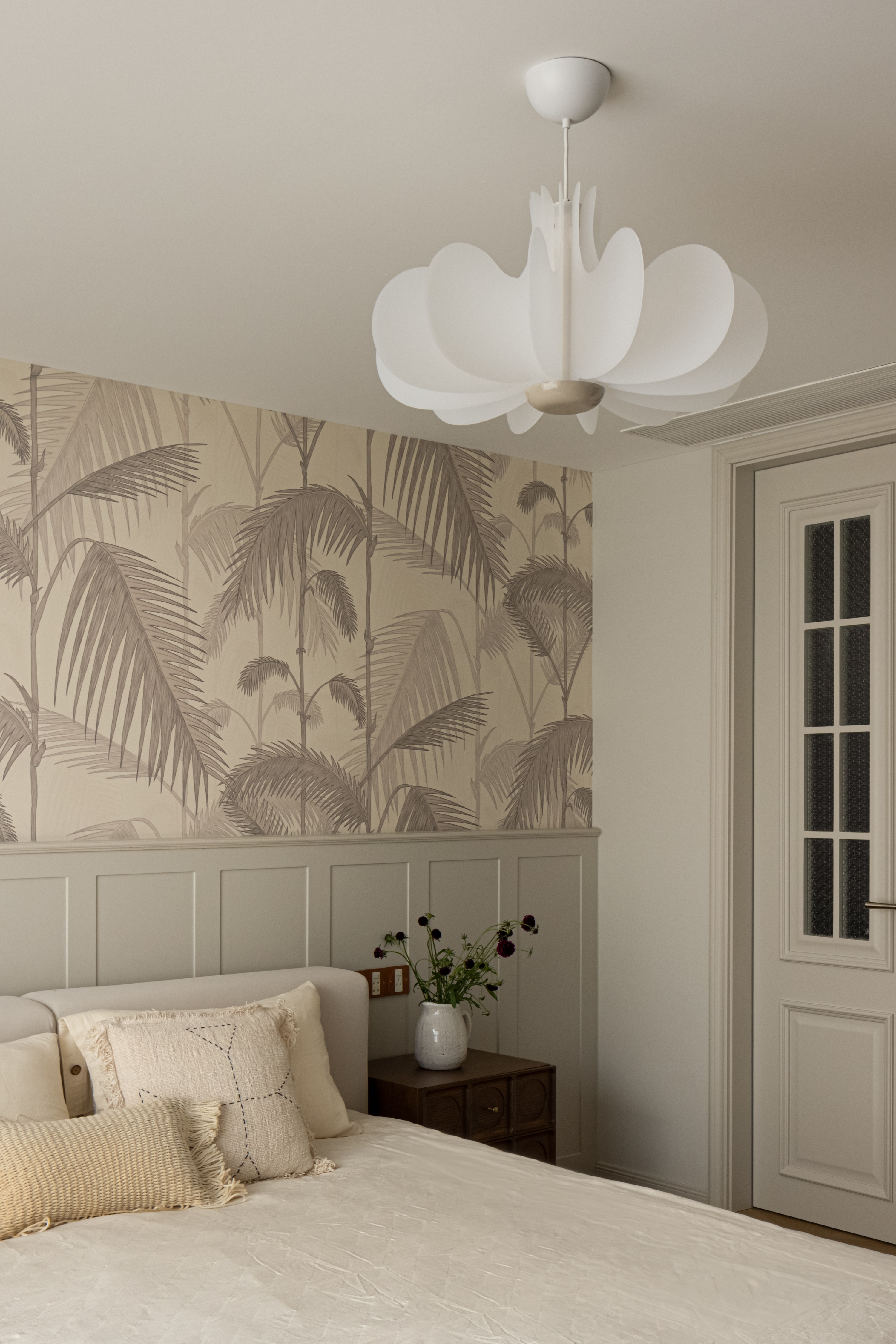 设计选材:在选材上,项目注重环保与经济性,选用了多种天然、可持续的材料,既保证了设计的美观与舒适性,又有助于降低环境负担。客餐厅、厨房等区域大量使用实木、大理石、棉麻等天然材料,避免了人工材料的过度使用,使空间更具自然质感且易于维护。这些材料不仅环保,还具备较长的使用寿命,从而减少了材料的更换频率,符合低碳经济的要求。同时,设计师通过定制家具和巧妙的空间利用,使得家中的各个收纳区域既实用又美观,减少了不必要的物品堆积,实现了高效空间利用和经济的生活方式。